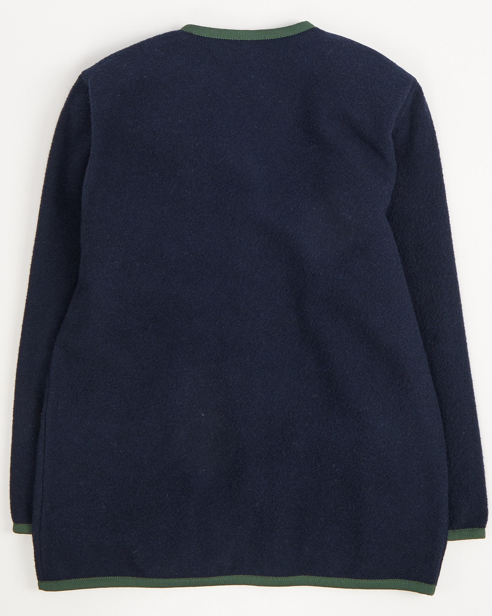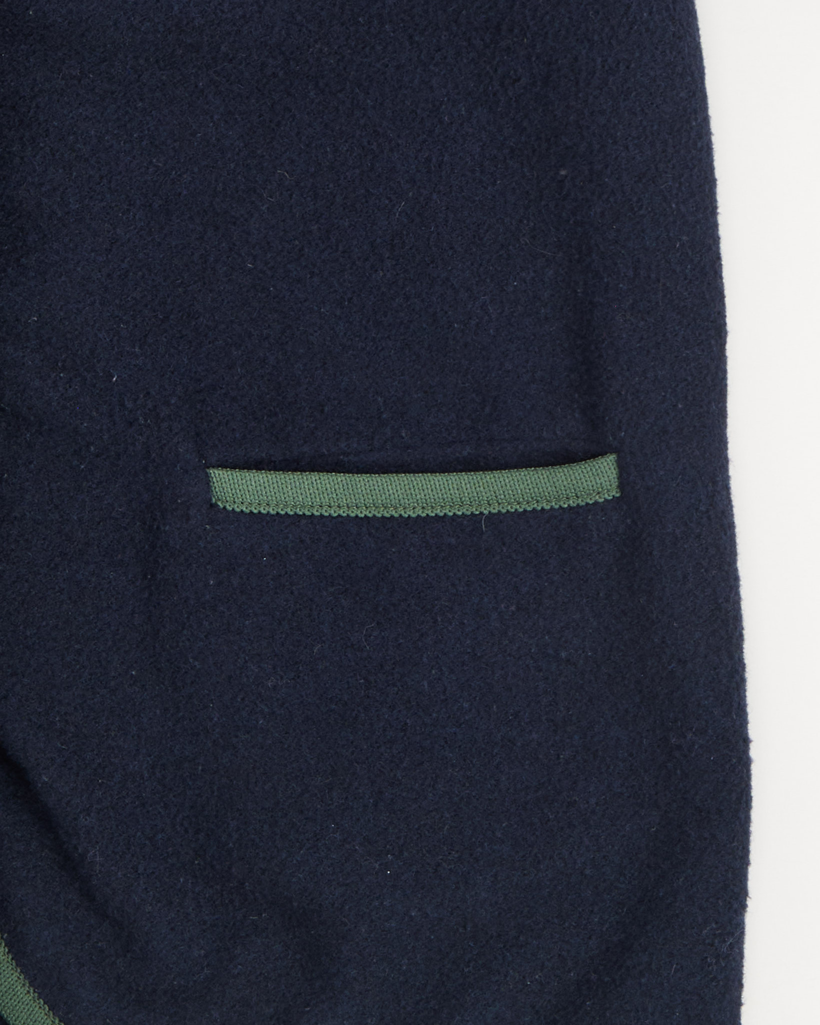 Винтажный жакет в стиле традиционной австрийской одежды. Выполнен в насыщенном темно-синем цвете с отделкой контрастным зеленым кантом. Вышивка в виде цветка эдельвейса на груди и декоративные металлические пуговицы с гербами, напоминающие старинные монеты