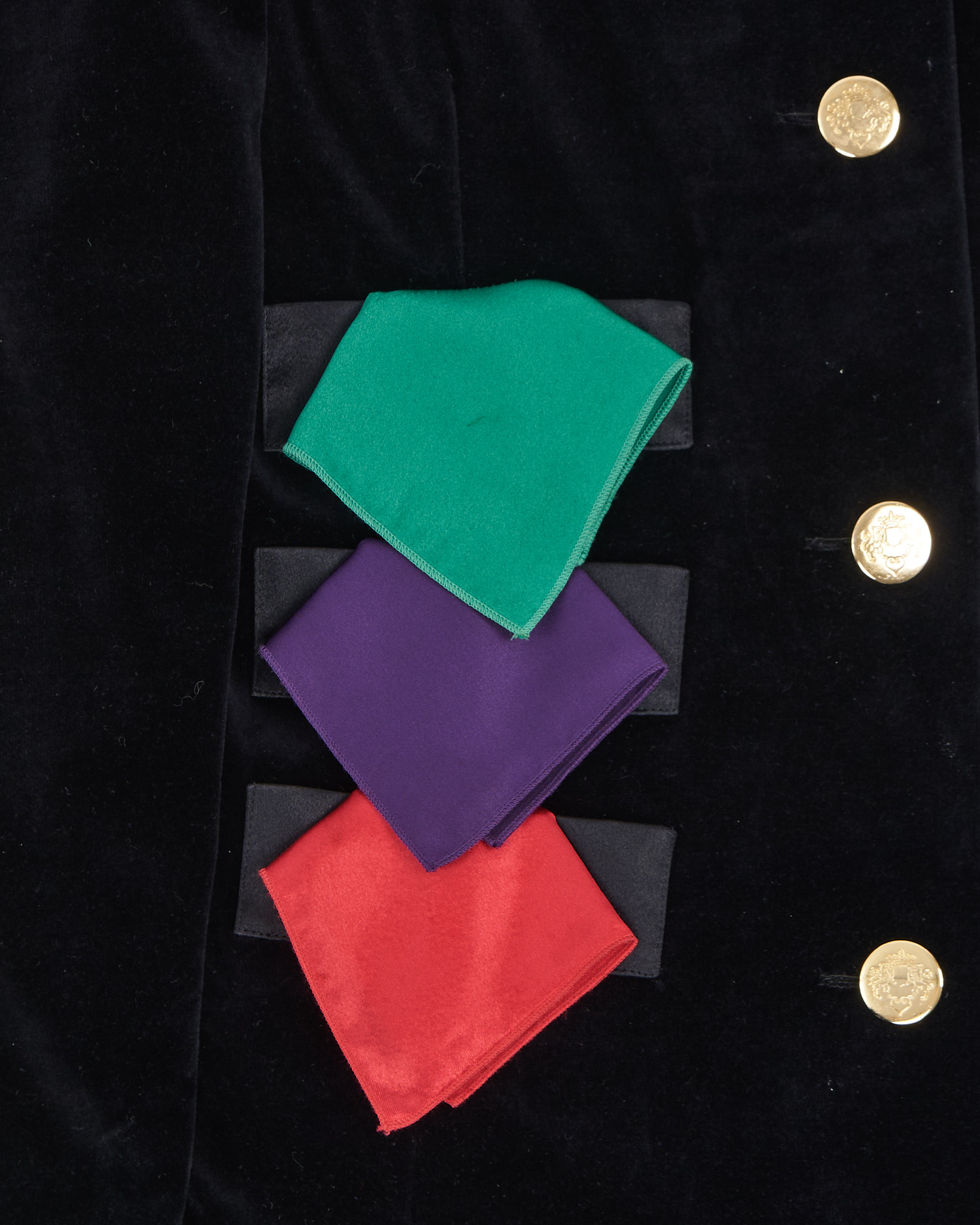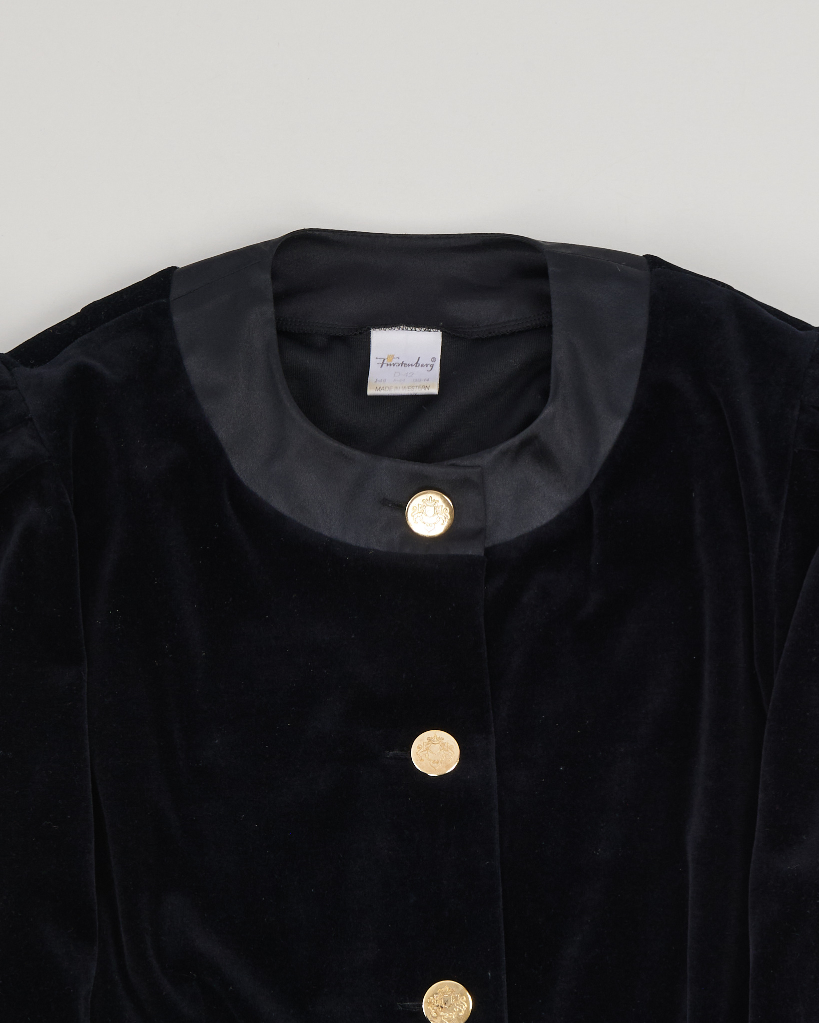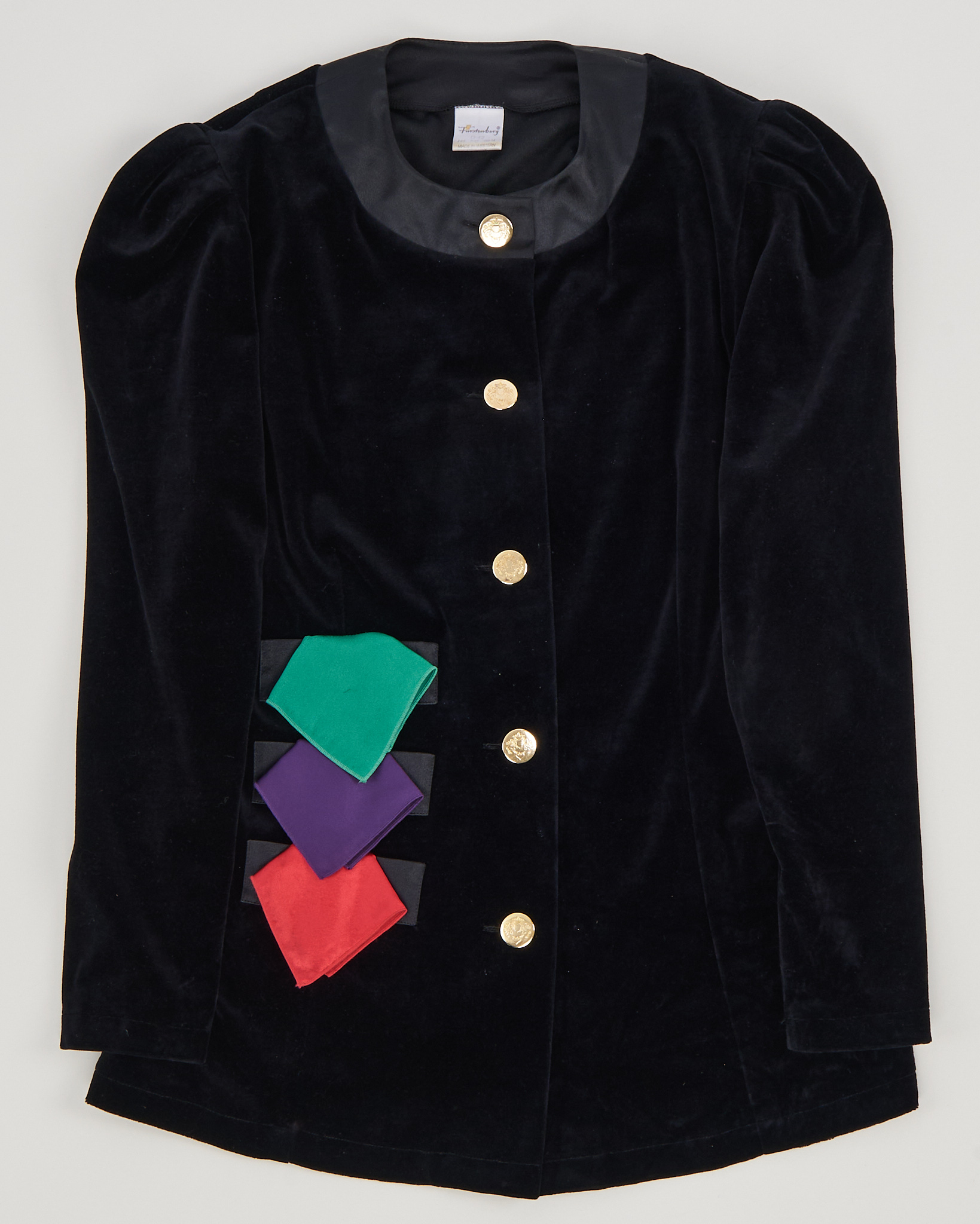 Бархатный жакет Fürstenberg с декоративными платками. Посадка свободная, удобные подплечники, золотистые пуговицы с гербом и декоративные разноцветные платки.