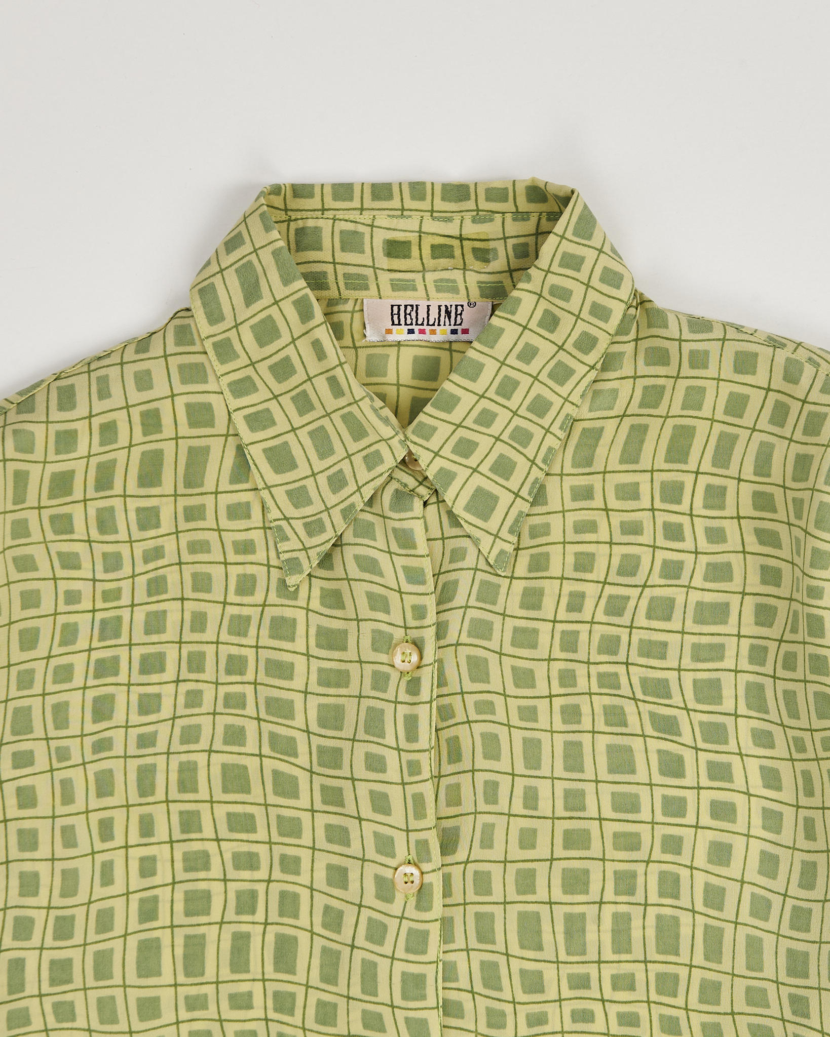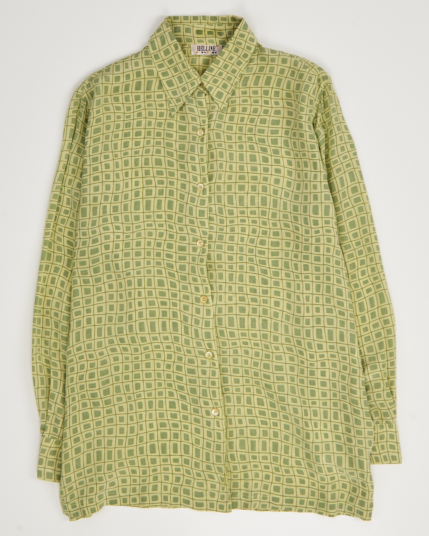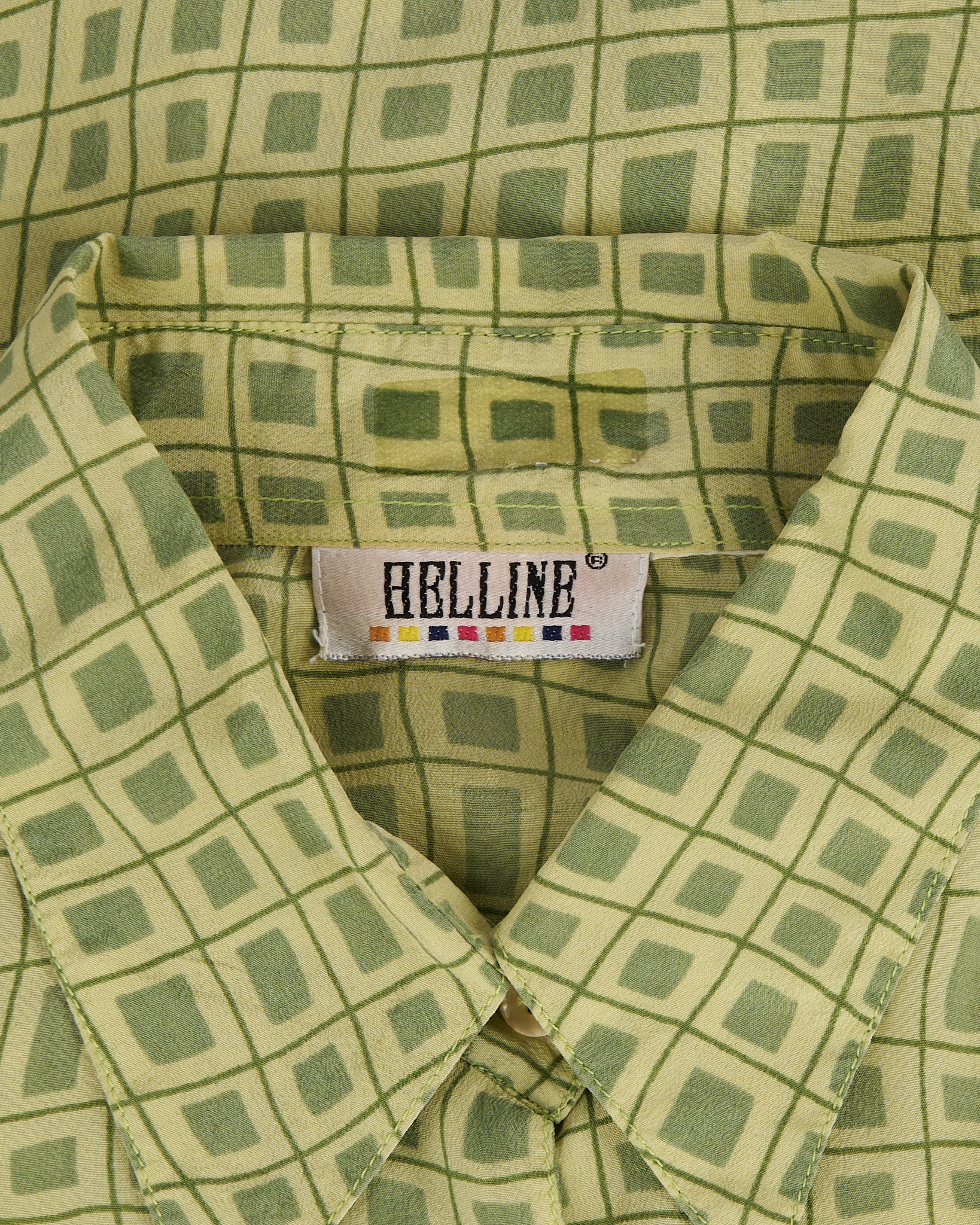 Блуза Belline выполнена из ткани оливково-зеленого оттенка с мелким геометрическим рисунком. Материал гладкий и мягкий на ощупь. Посадка свободная