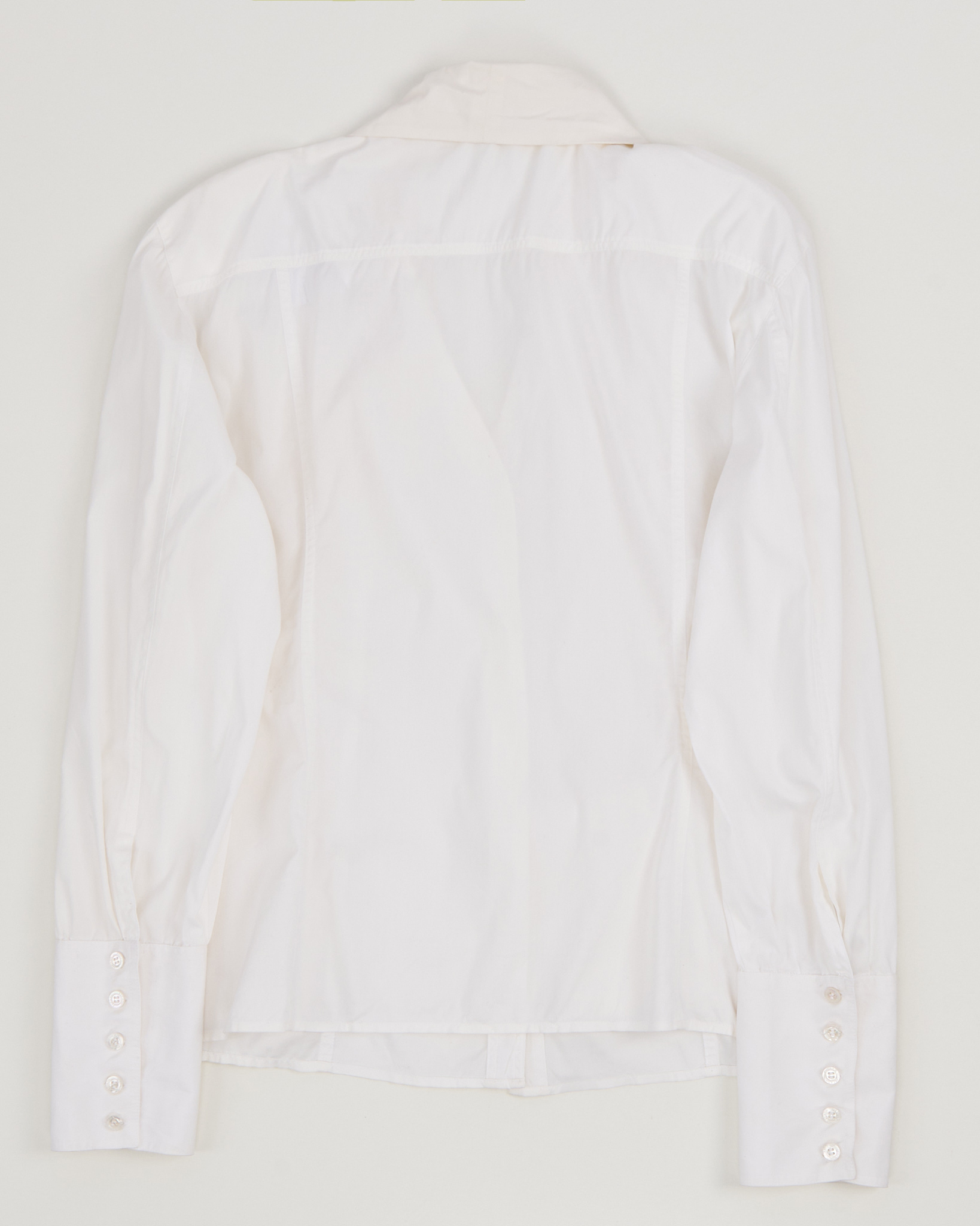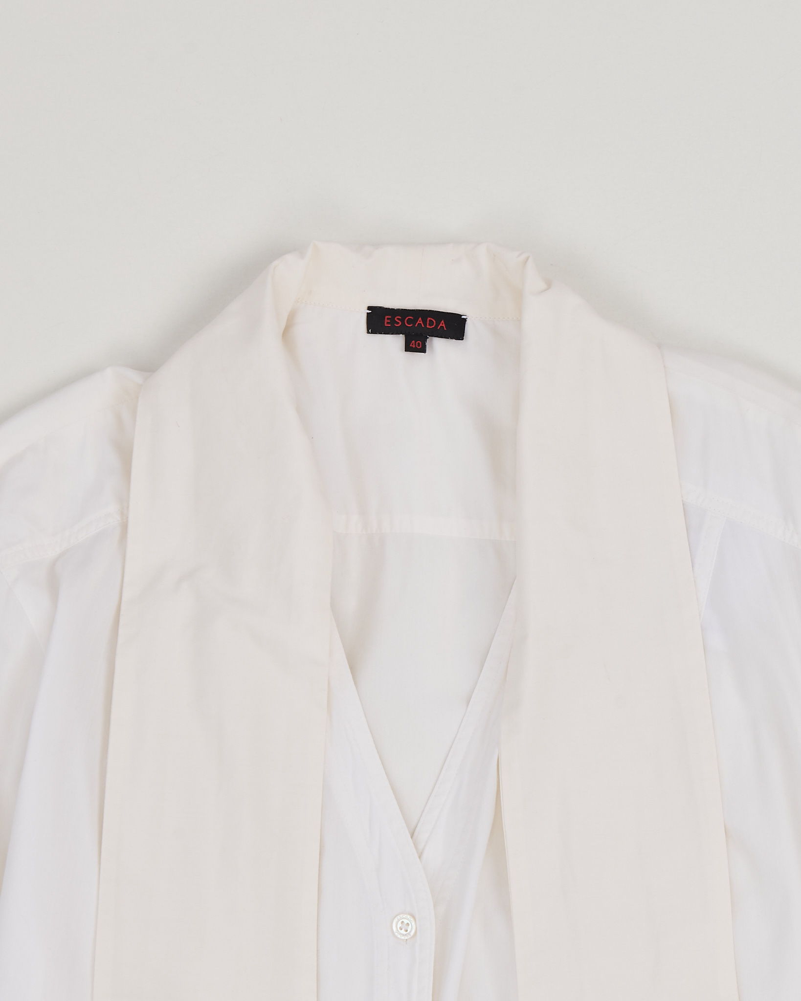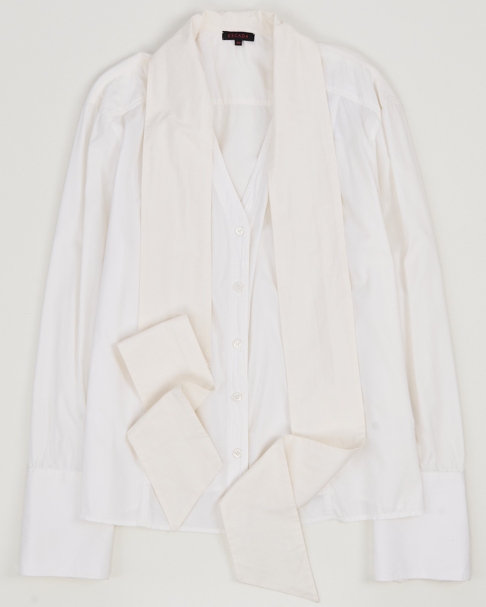 Блуза Escada из 72% хлопка. Посадка свободная, широкие манжеты с рядом пуговиц, длинный шарф на вороте придает вещи акцент.