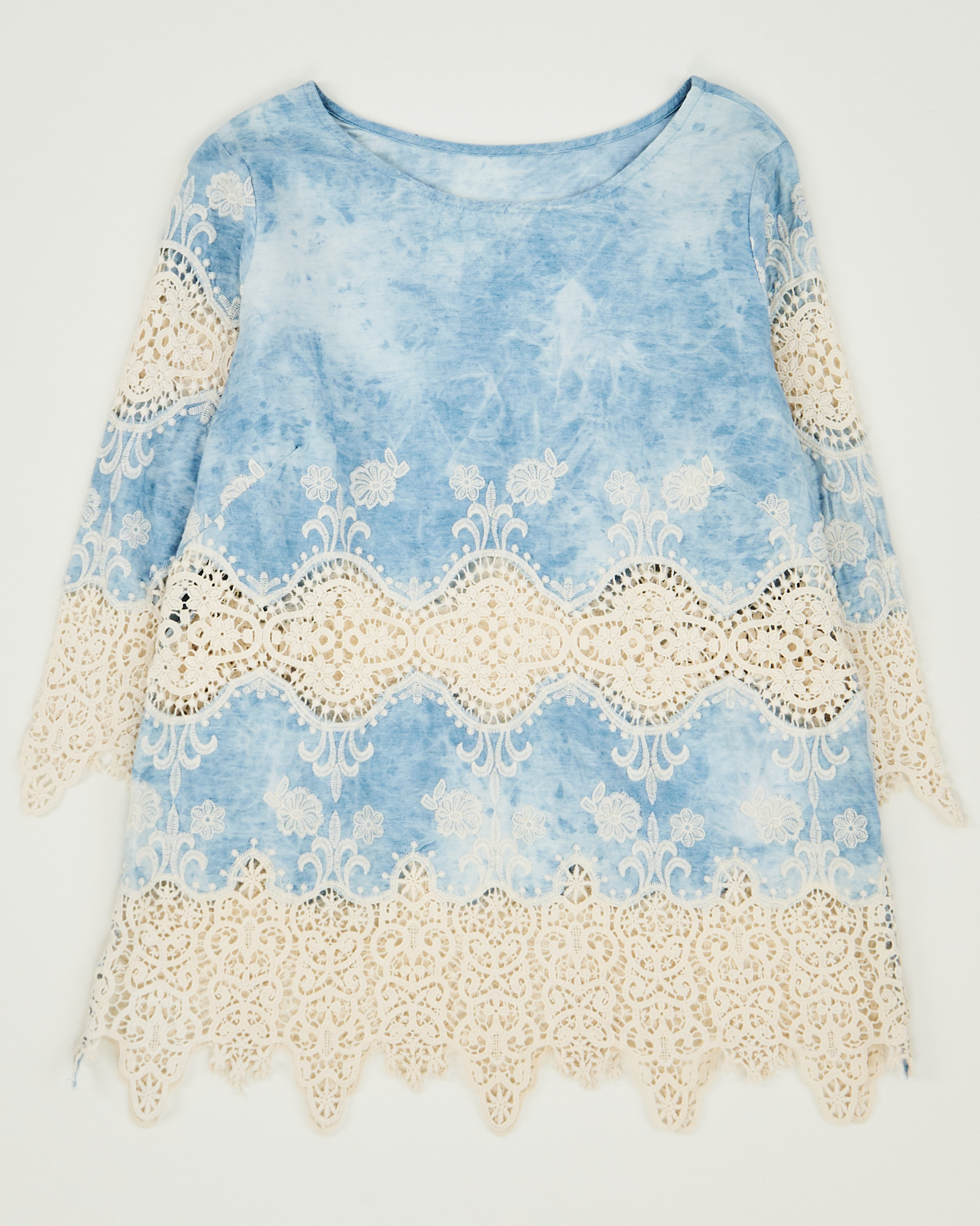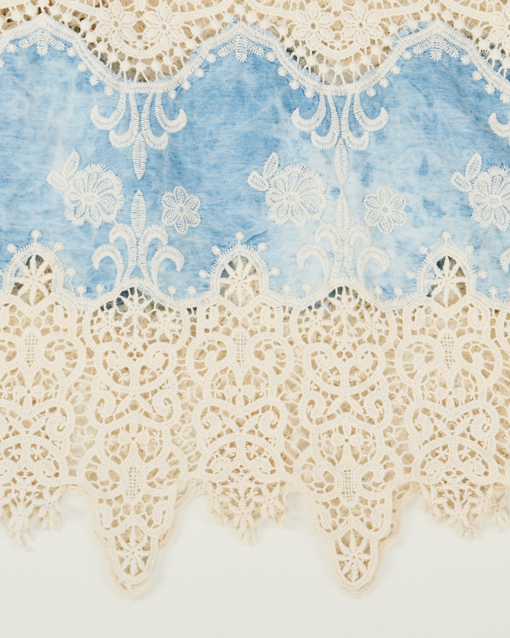 Блуза из хлопка голубого оттенка с контрастными кружевными вставками и вышивкой. Ткань мягкая, лёгкая. Посадка свободная, кружевные вставки придают вещи акцент.