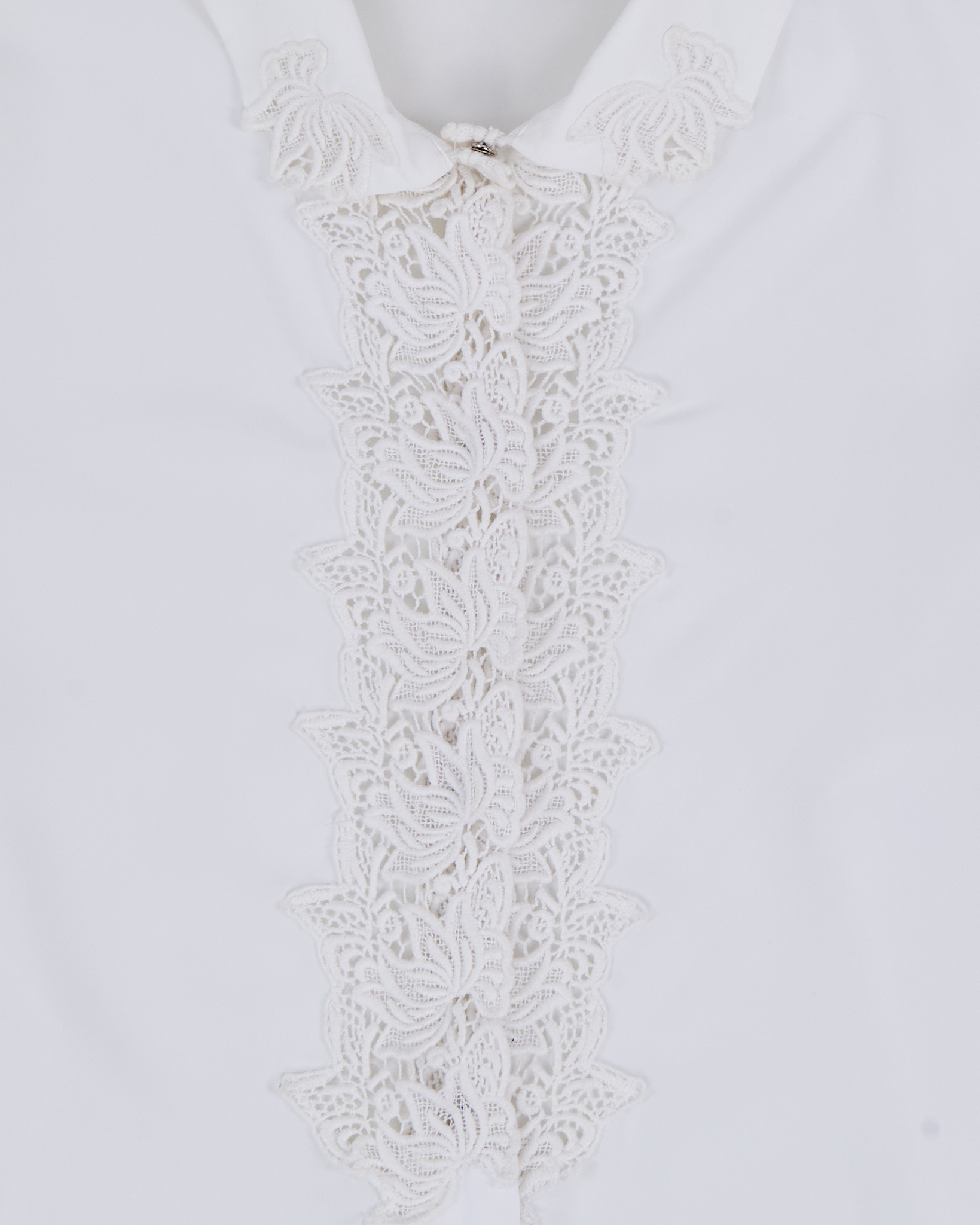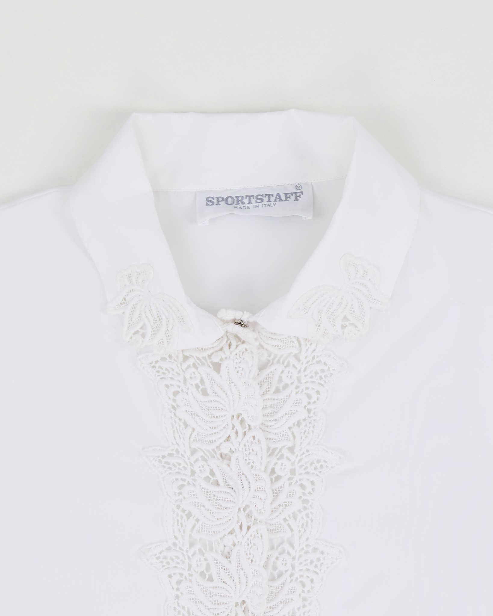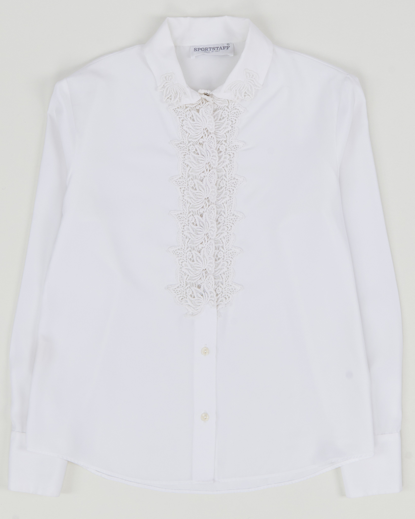 Белая блуза Sportstaff с декоративной кружевной вставкой по центру. Прямой крой, аккуратная посадка. Кружевная вставка придает вещи акцент, удобная застежка на клепки.