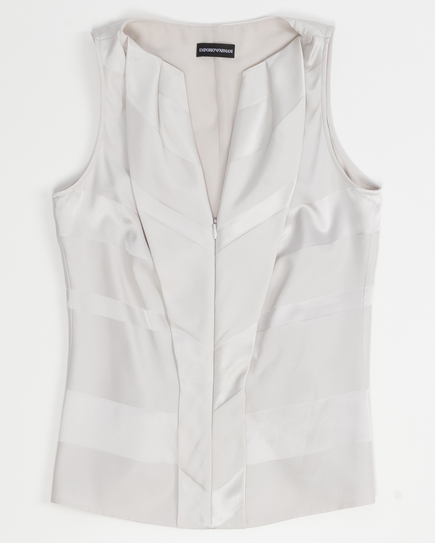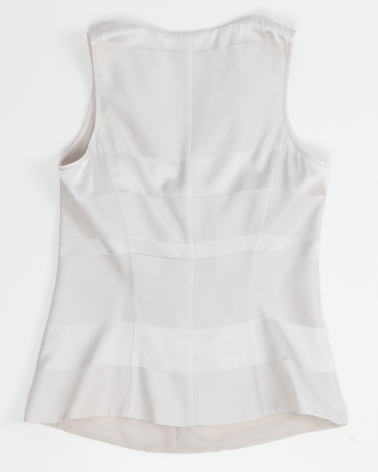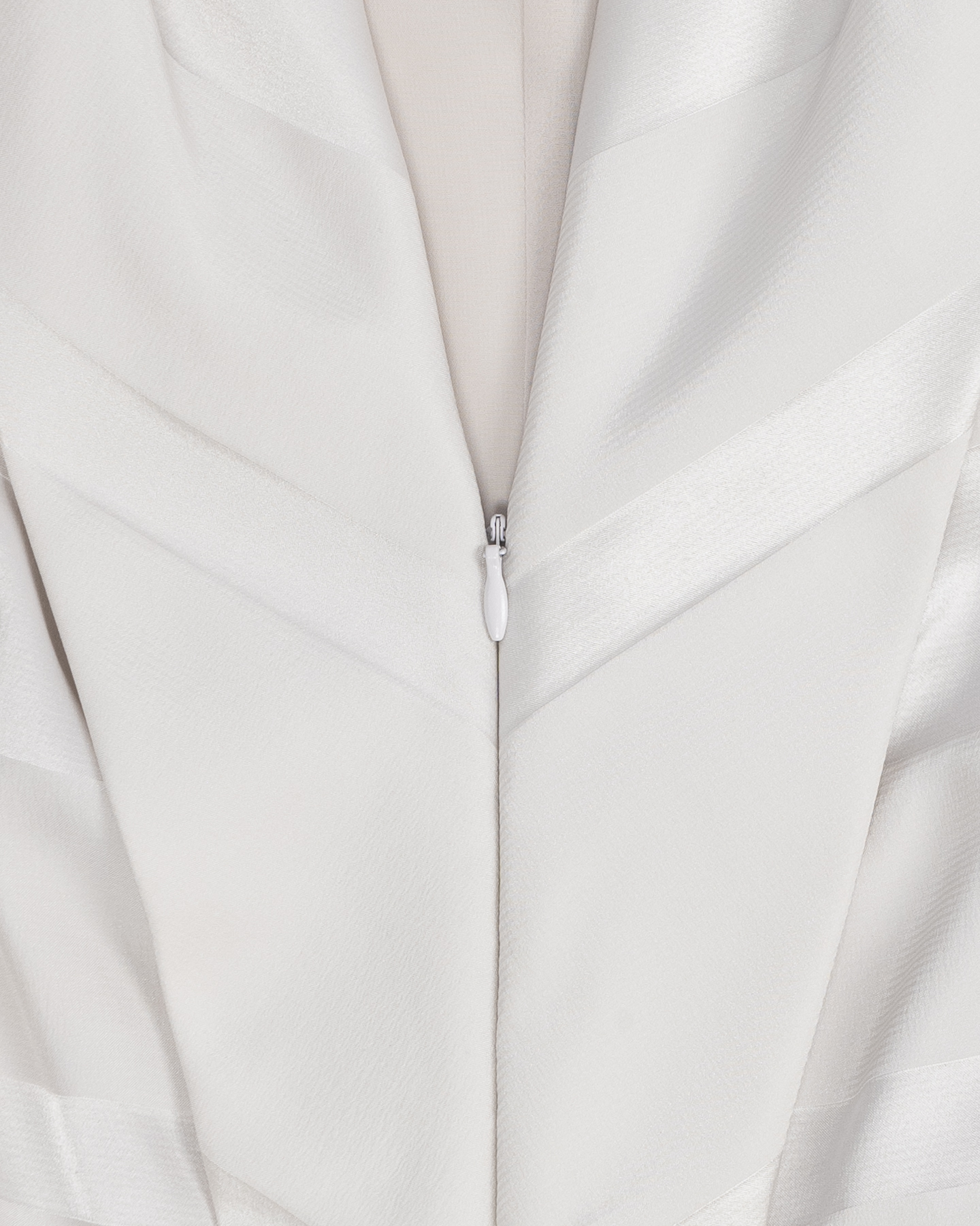 Материал приятен к телу и держит форму, создавая аккуратный силуэт. Декоративные геометрические вставки образуют выразительные диагонали и горизонтальные линии в оттенках холодного перламутра. Блузка подчёркивает линию плеч и аккуратно моделирует верхнюю часть фигуры. Идеальная посадка за счёт продуманной конструкции передней планки.