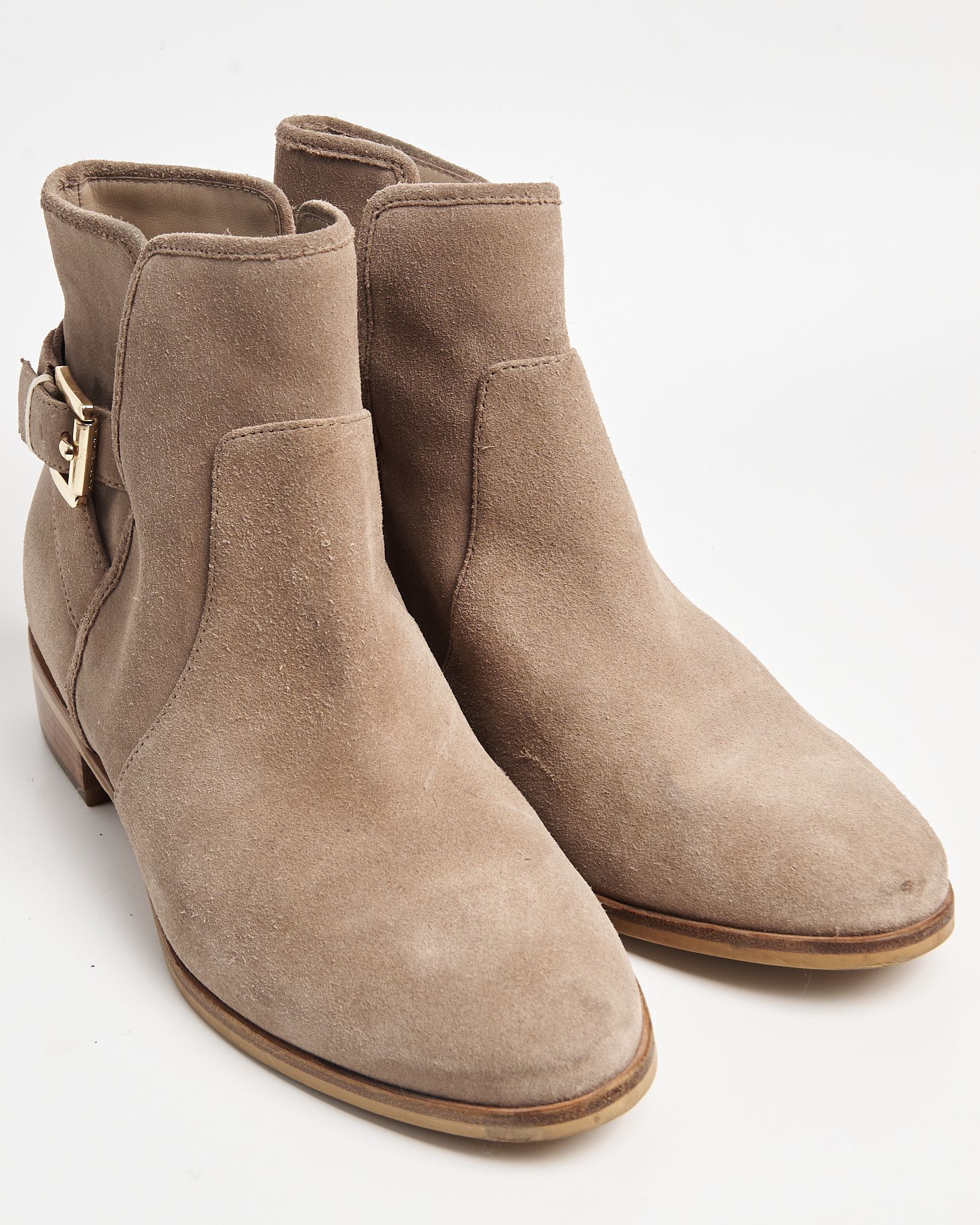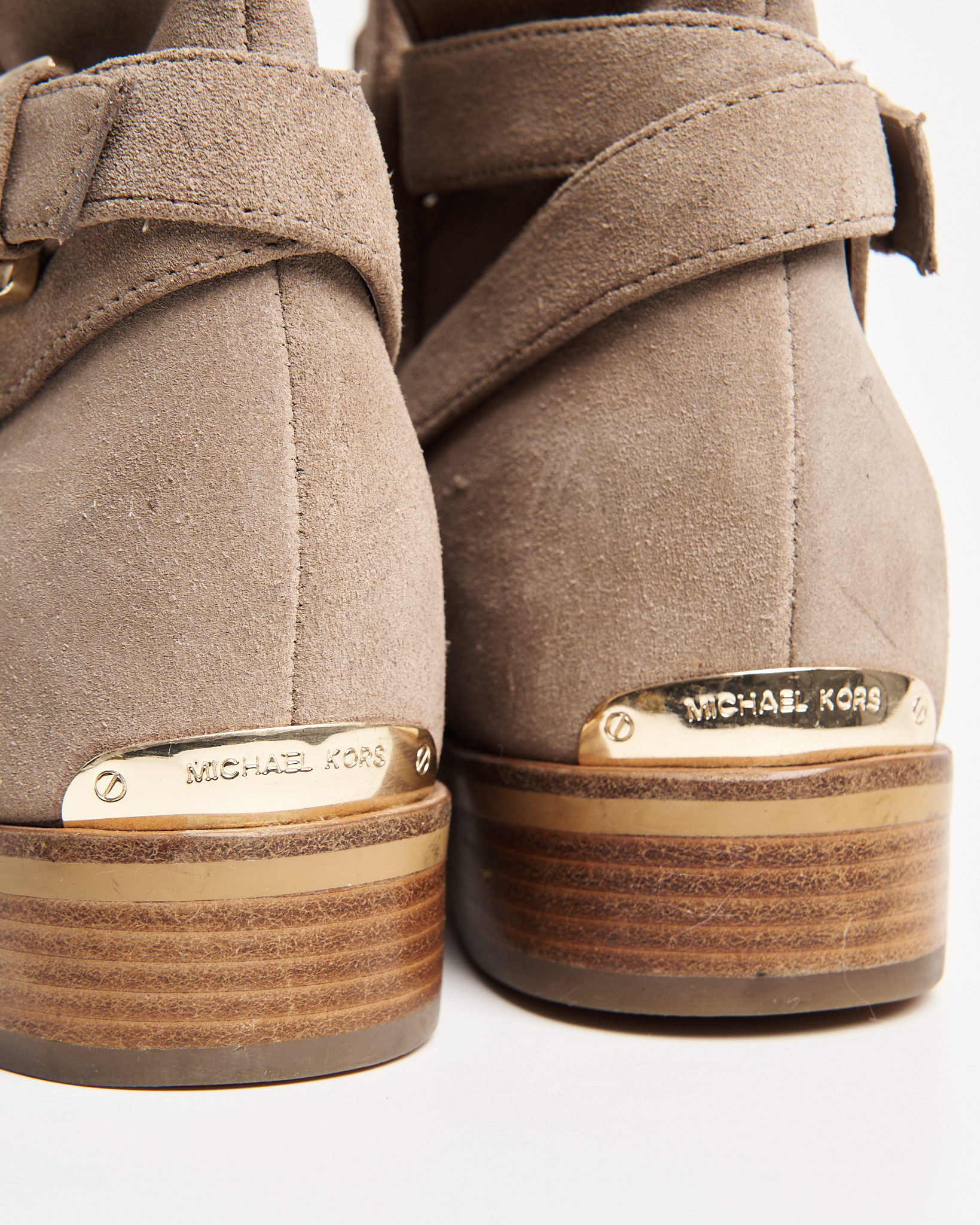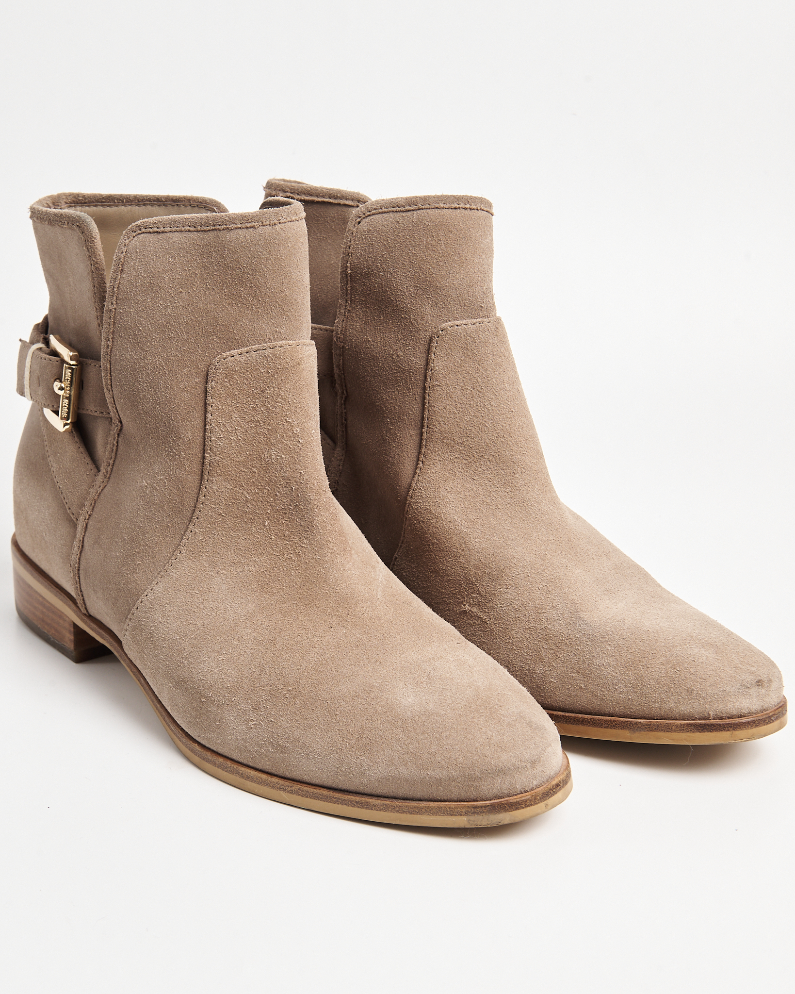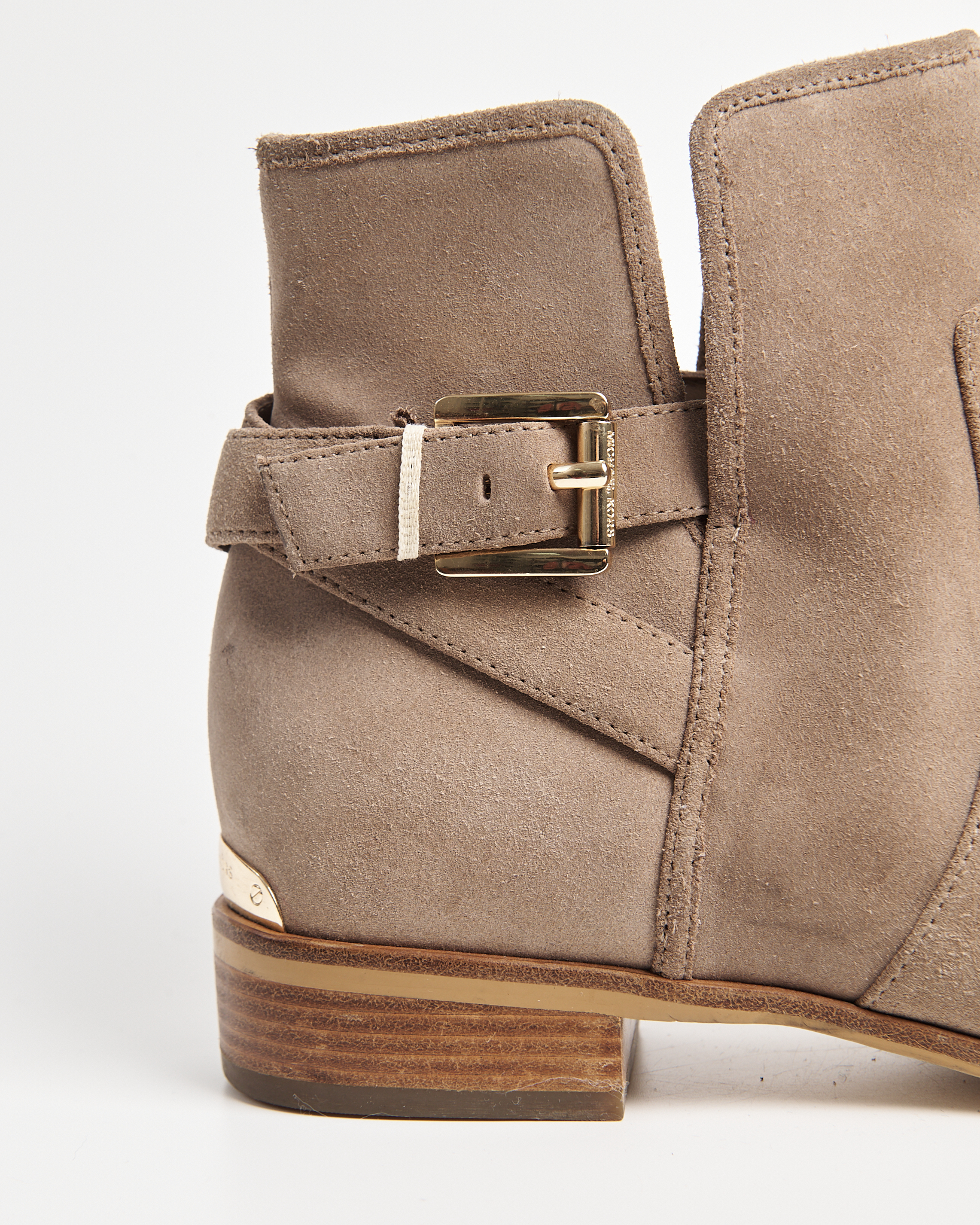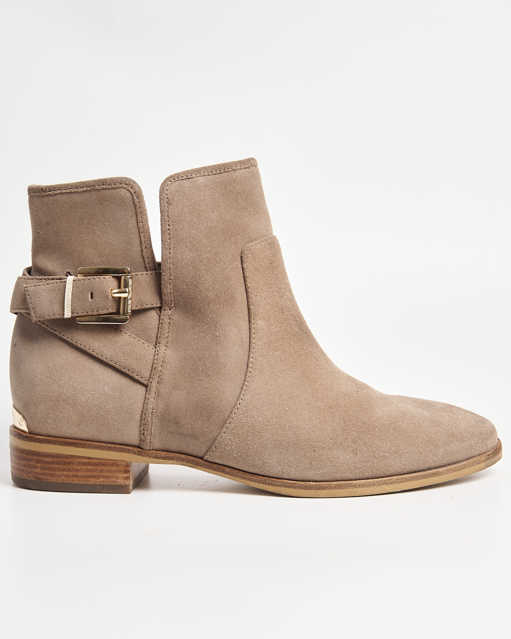 Ботильоны Michael Kors из мягкой натуральной замши тёплого бежевого оттенка. Устойчивый каблук, декоративный ремешок с металлической пряжкой, фирменный логотип бренда сзади.