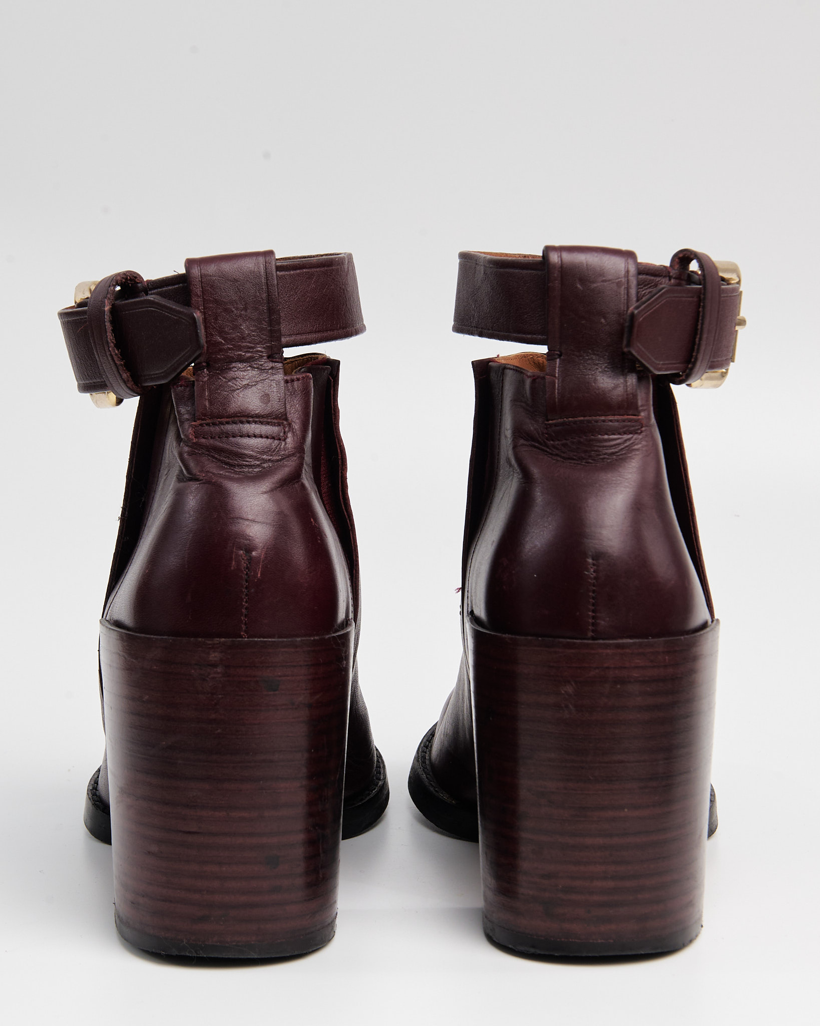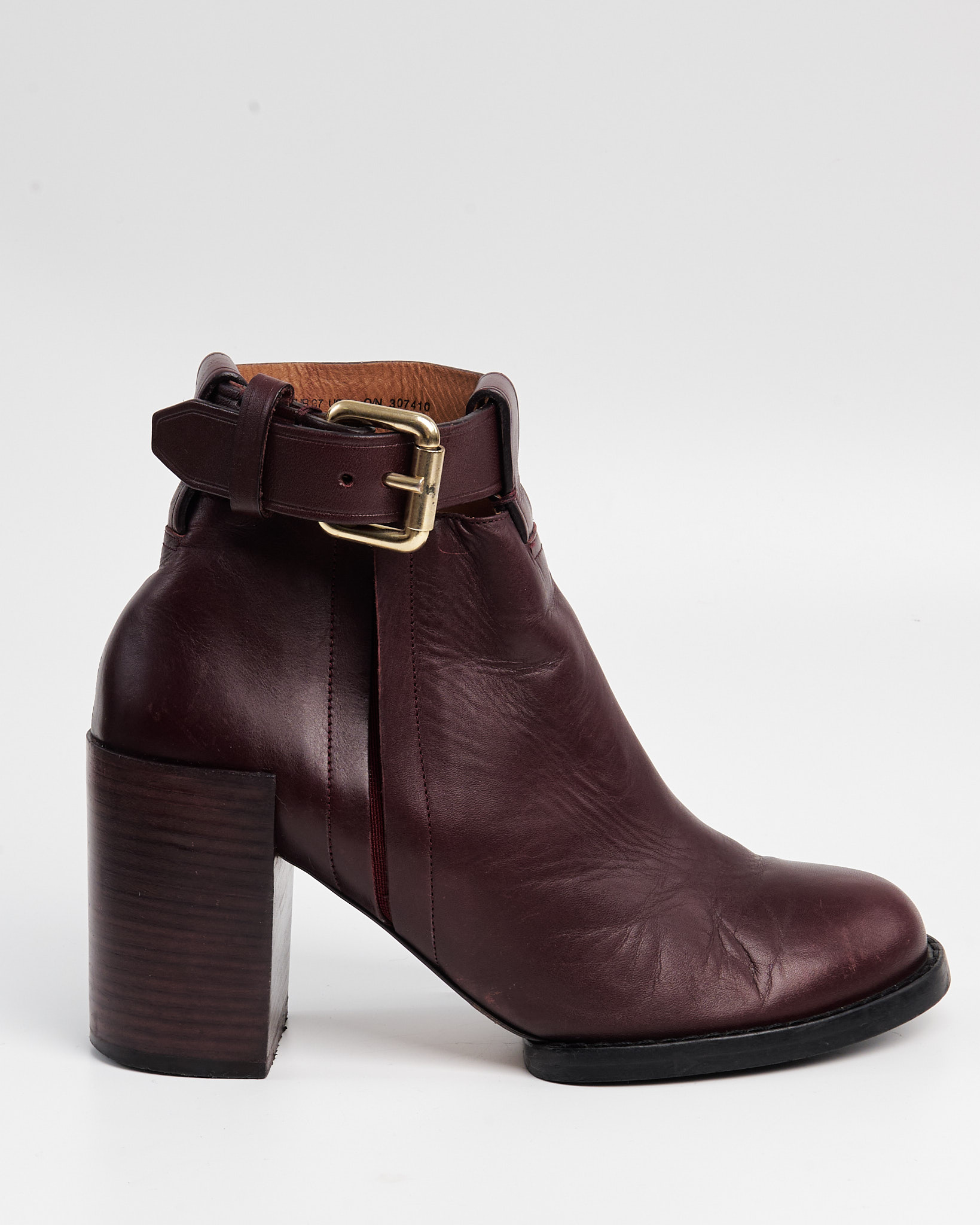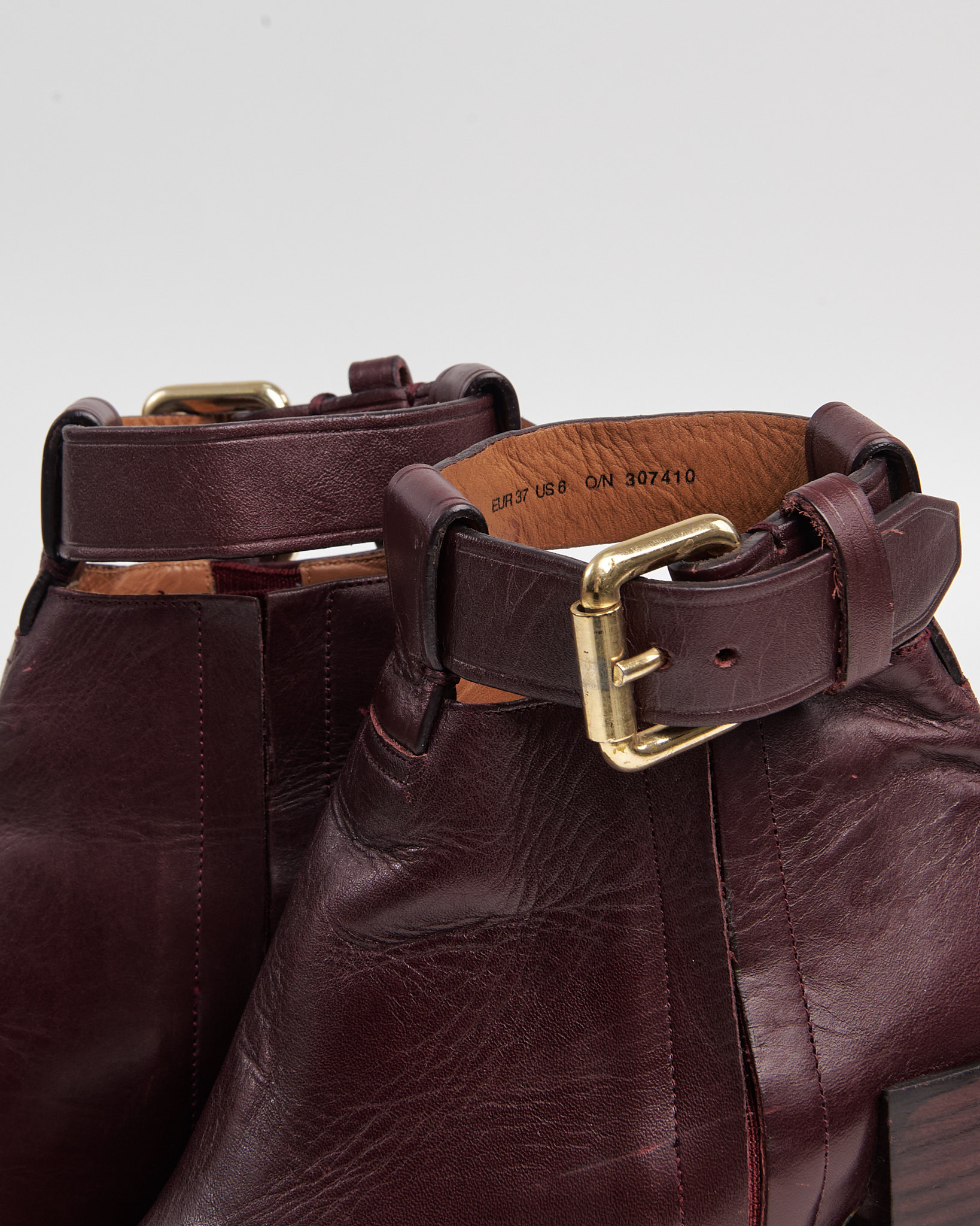 Ботильоны Other Stories цвета бургунди из 100% натуральной кожи. Акцентный широкий ремешок с массивной золотой пряжкой. Открытые вырезы по бокам визуально облегчают силуэт обуви, устойчивый наборный каблук.