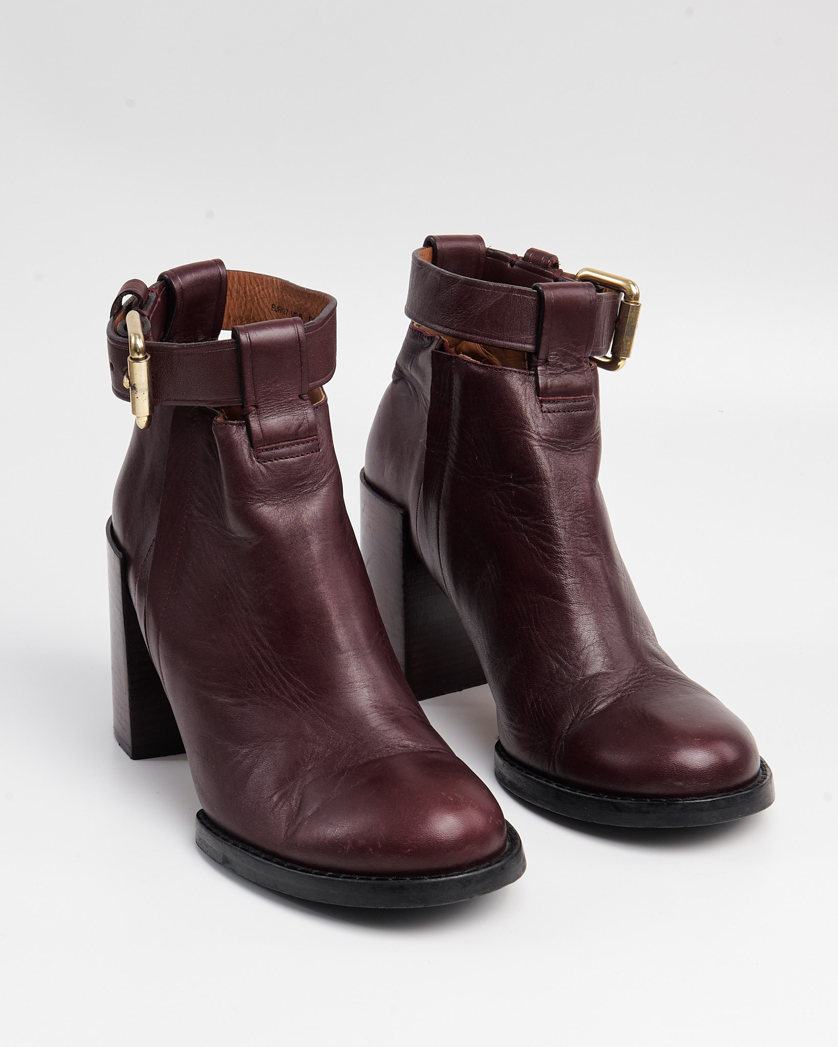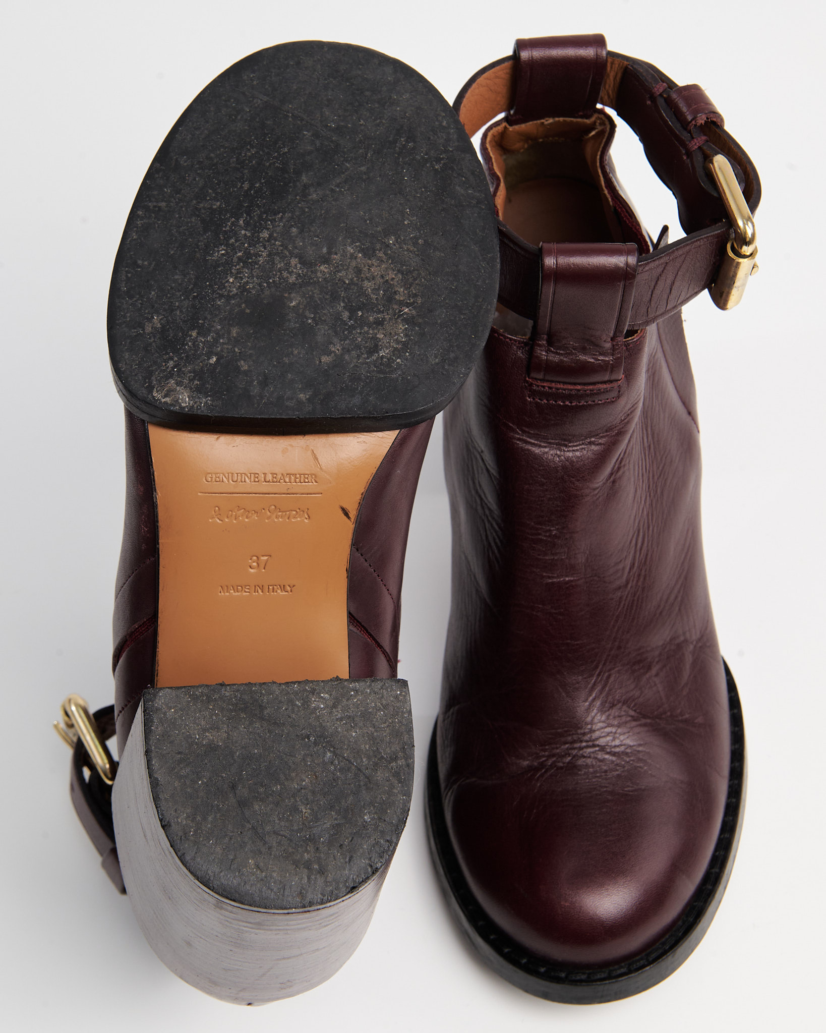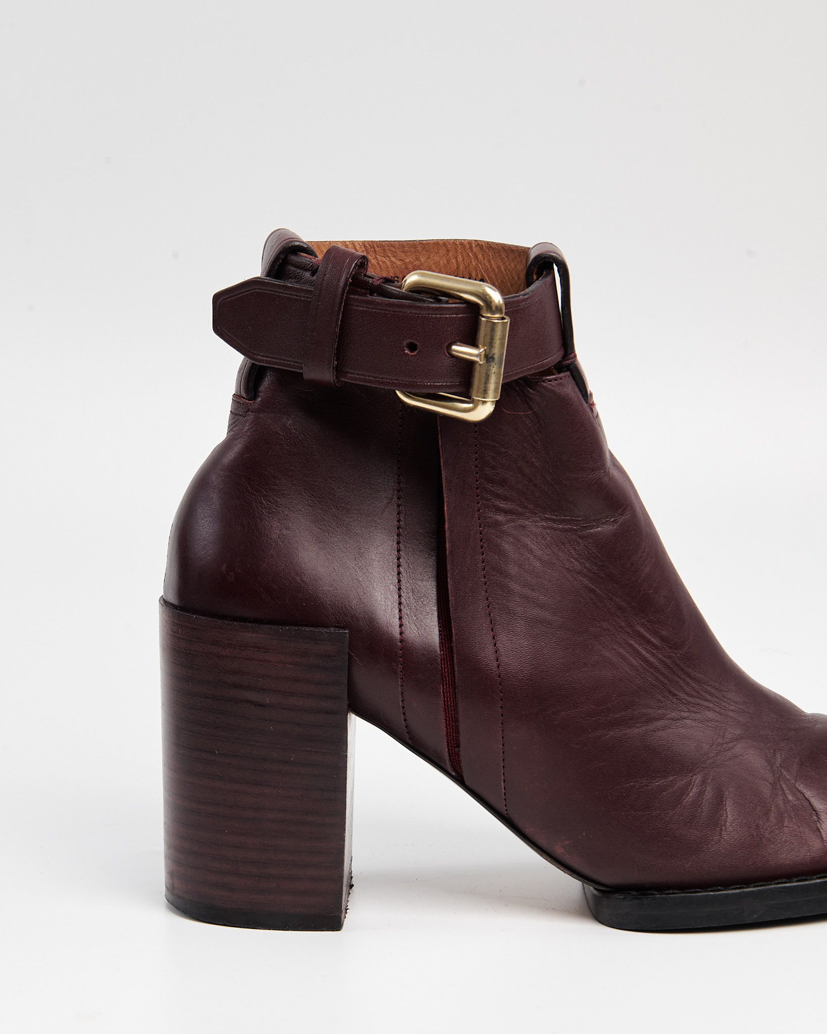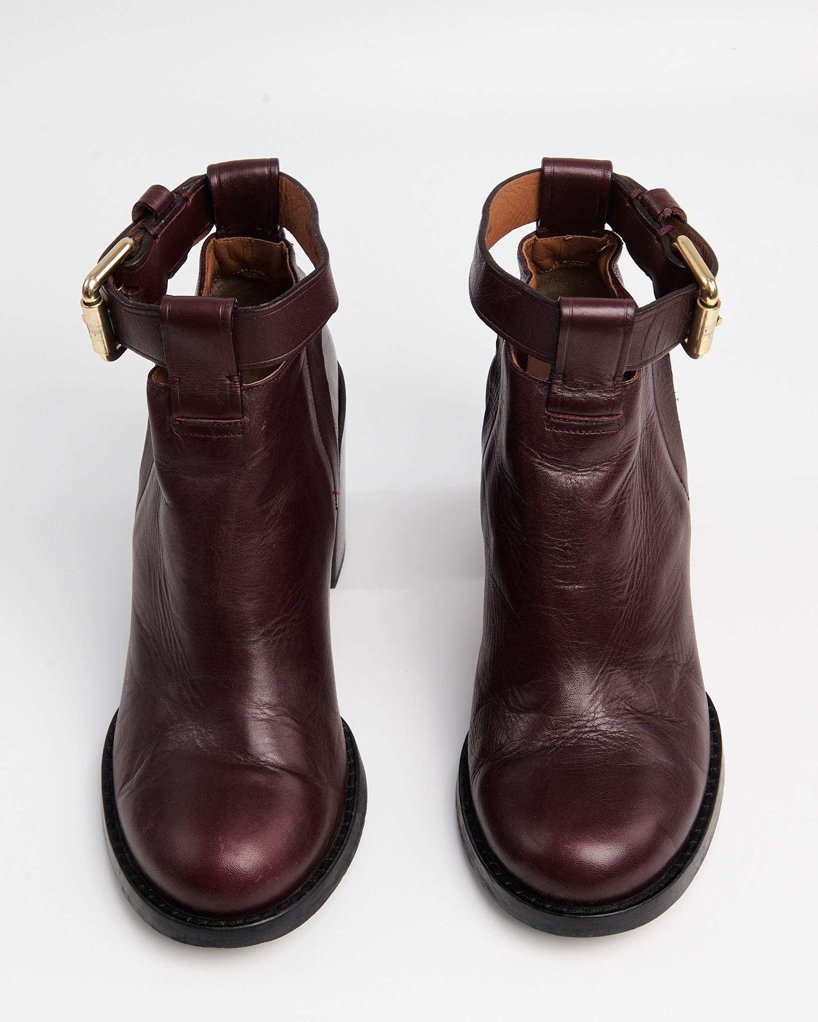 Ботильоны Other Stories цвета бургунди из 100% натуральной кожи. Акцентный широкий ремешок с массивной золотой пряжкой. Открытые вырезы по бокам визуально облегчают силуэт обуви, устойчивый наборный каблук.