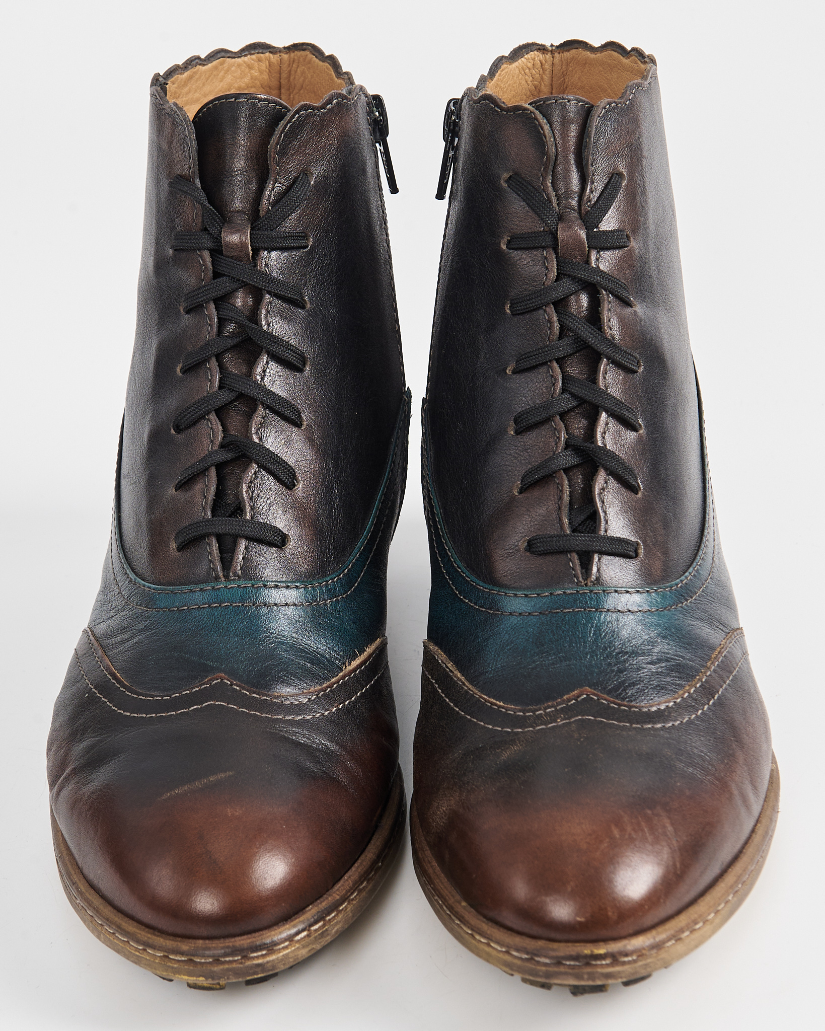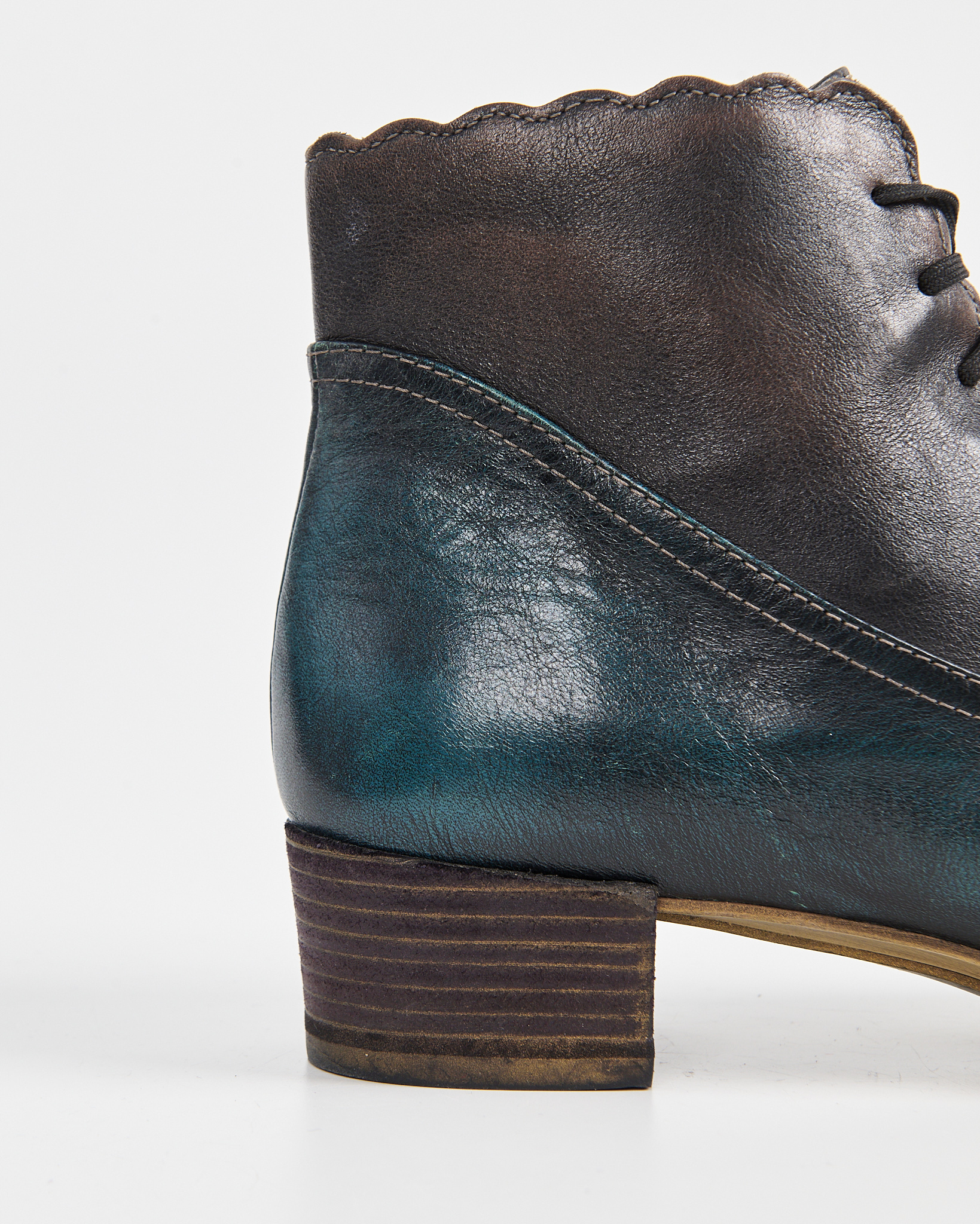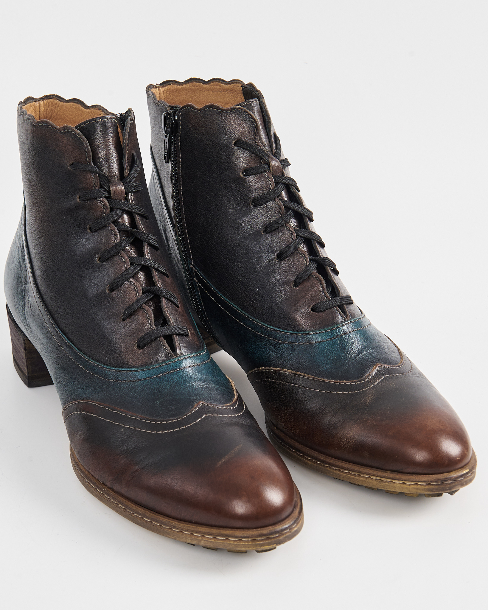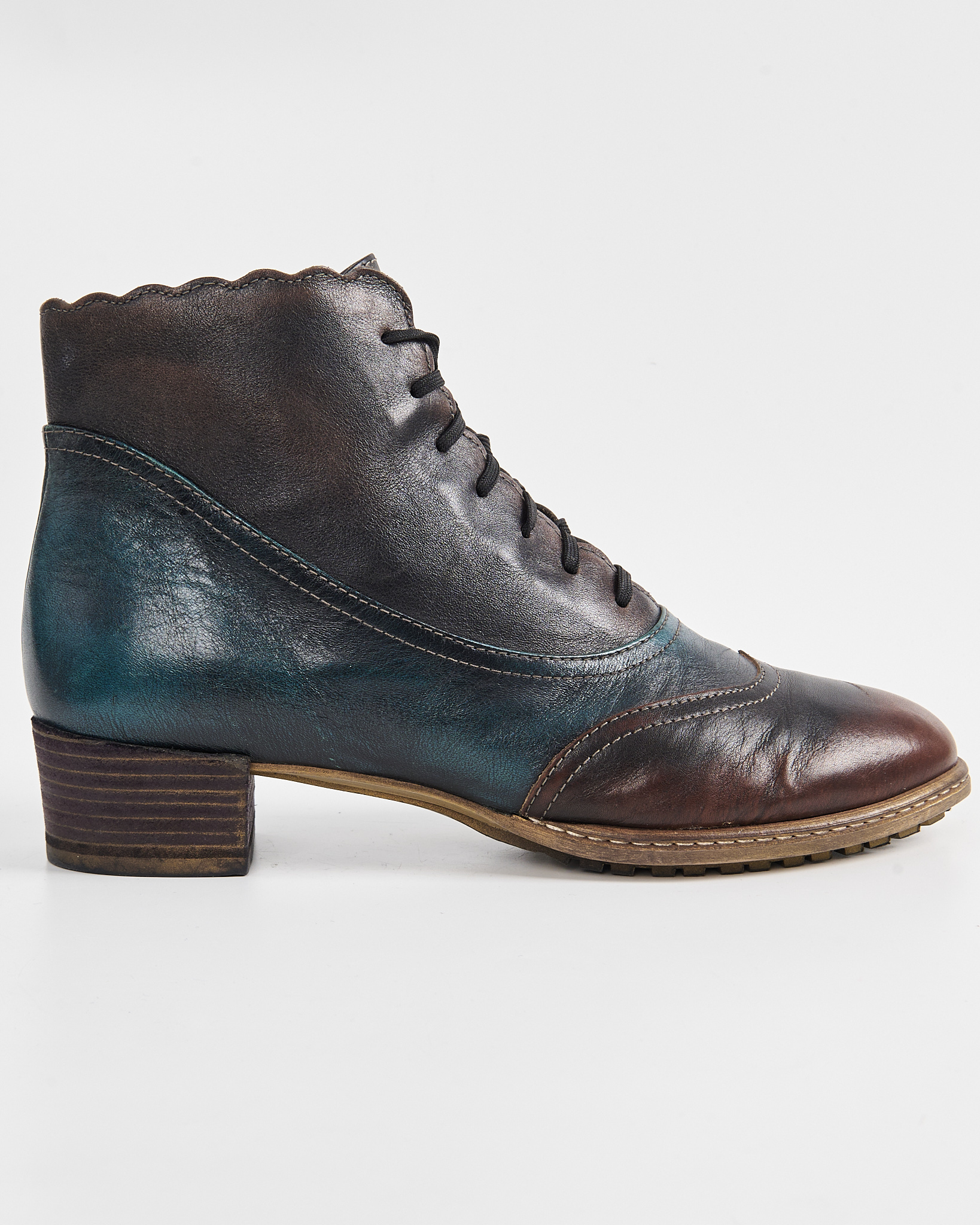 Ботинки из мягкой натуральной кожи с плавным переходом оттенков — от глубокого коричневого к темно-синему. Декорированы перфорацией, удобная  шнуровка по всей длине. Невысокий устойчивый каблук и прочная подошва.