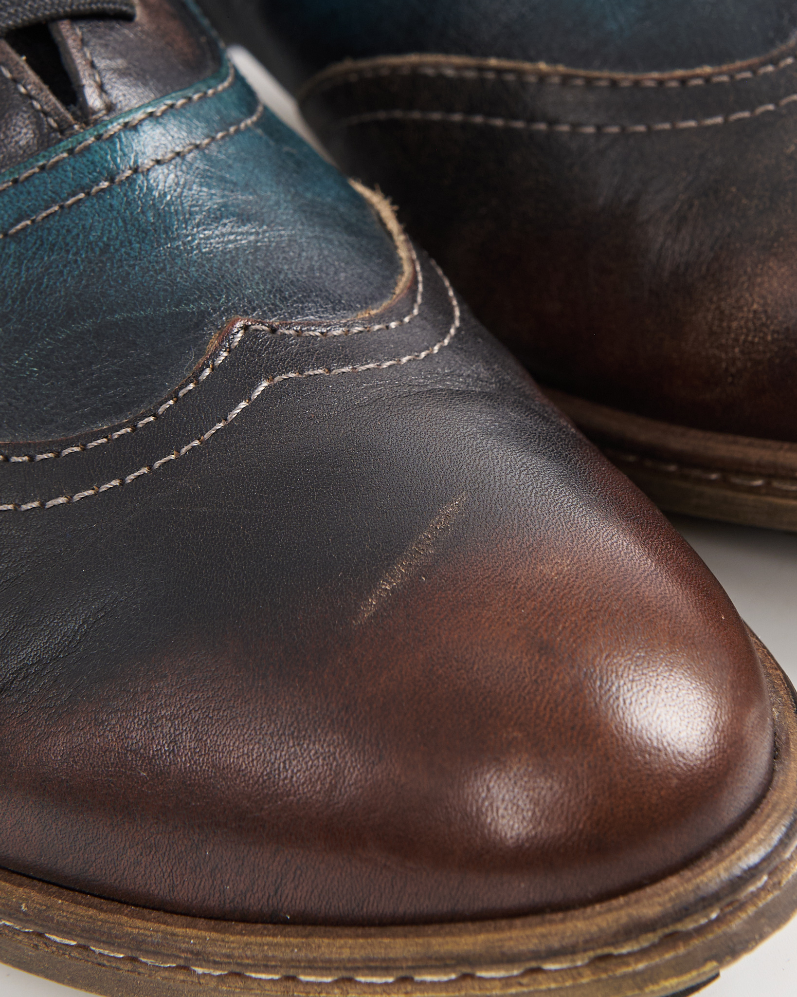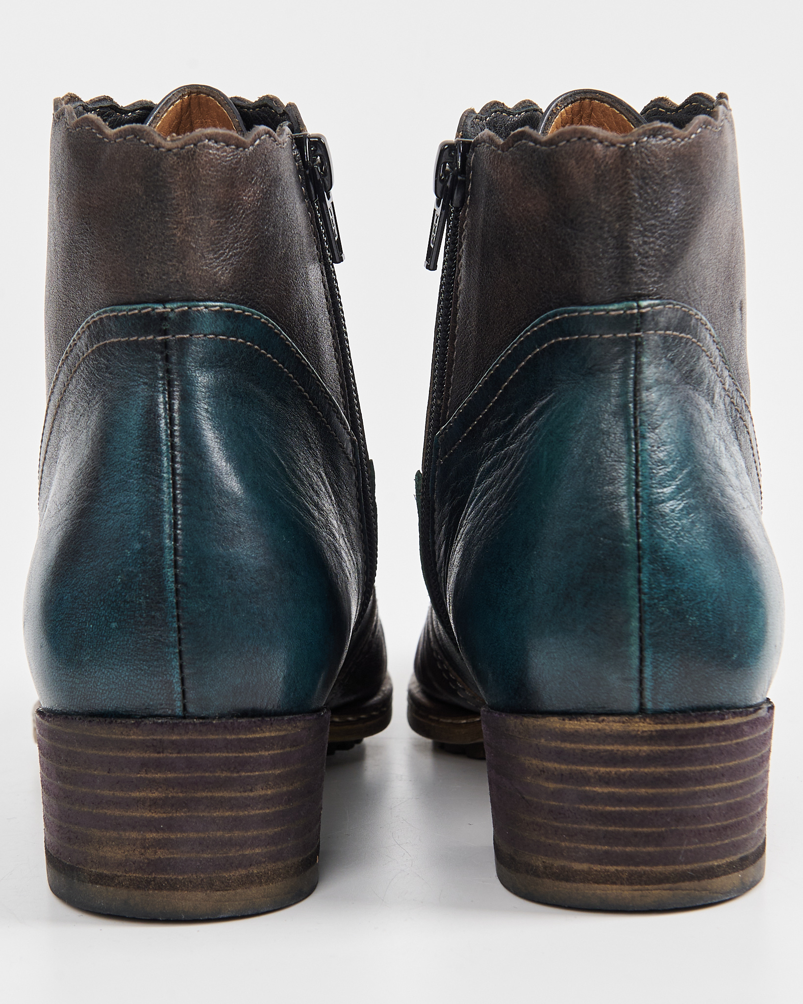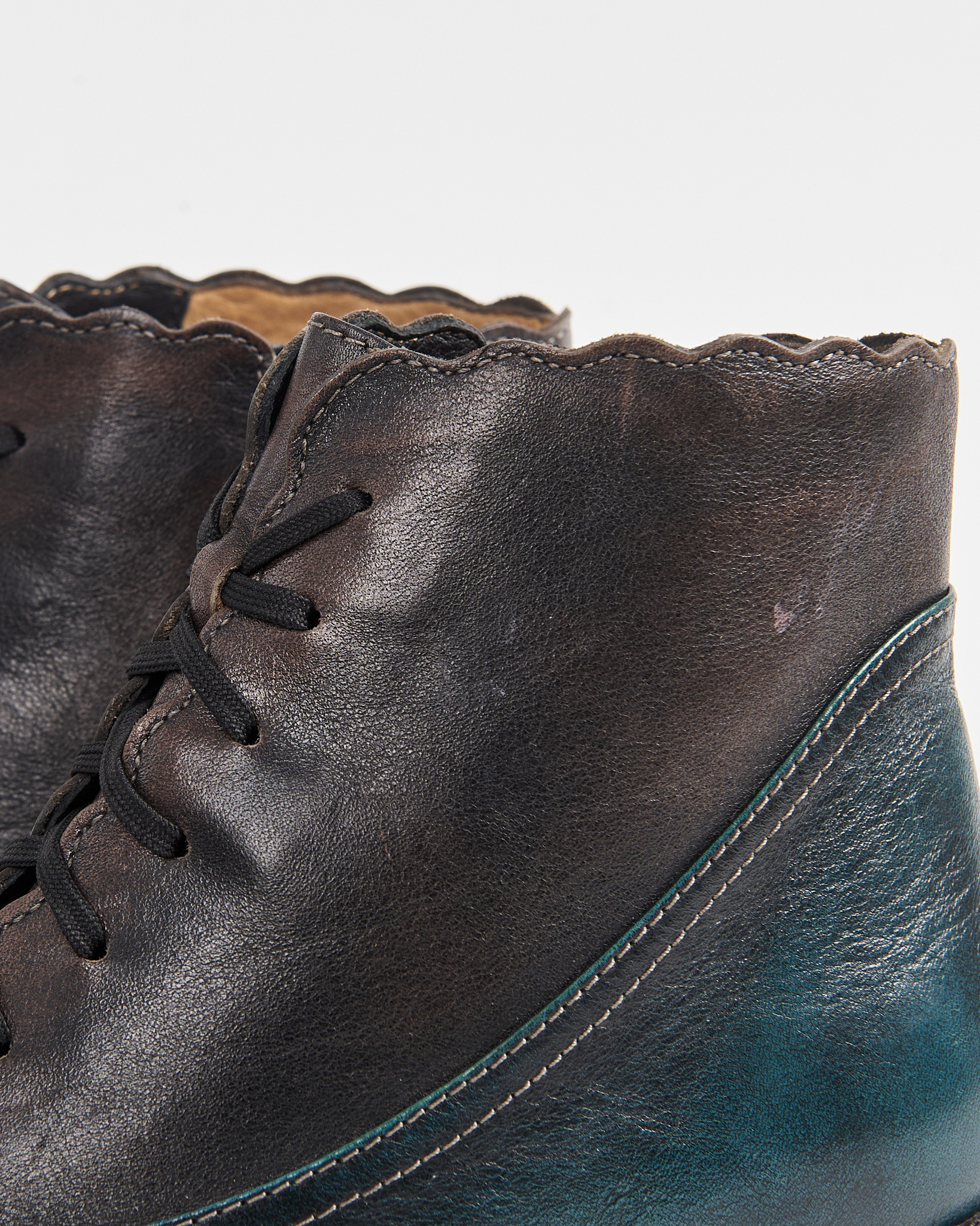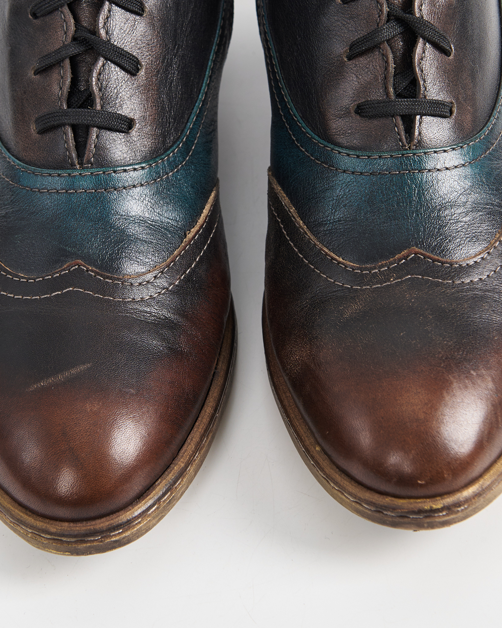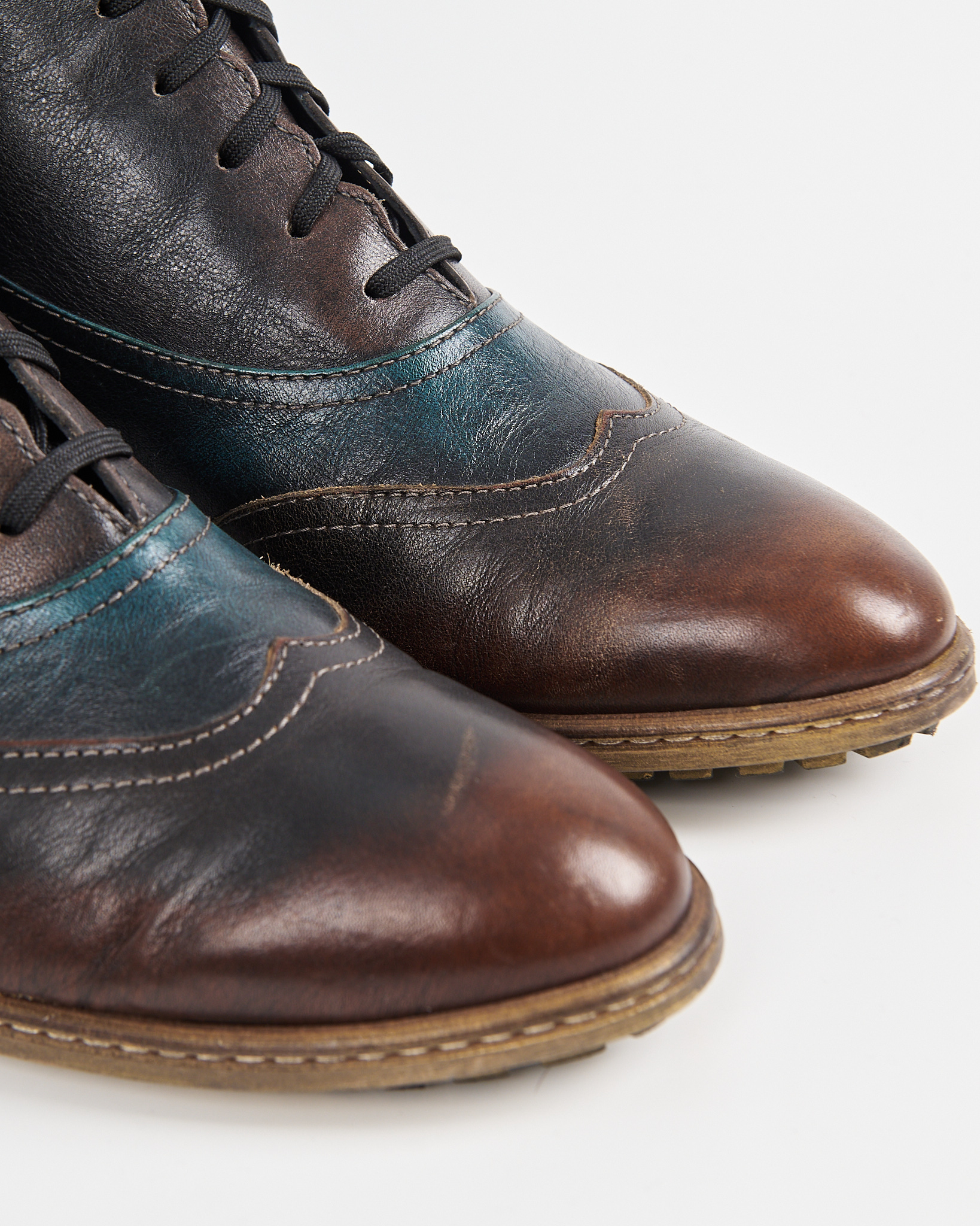 Ботинки из мягкой натуральной кожи с плавным переходом оттенков — от глубокого коричневого к темно-синему. Декорированы перфорацией, удобная  шнуровка по всей длине. Невысокий устойчивый каблук и прочная подошва.