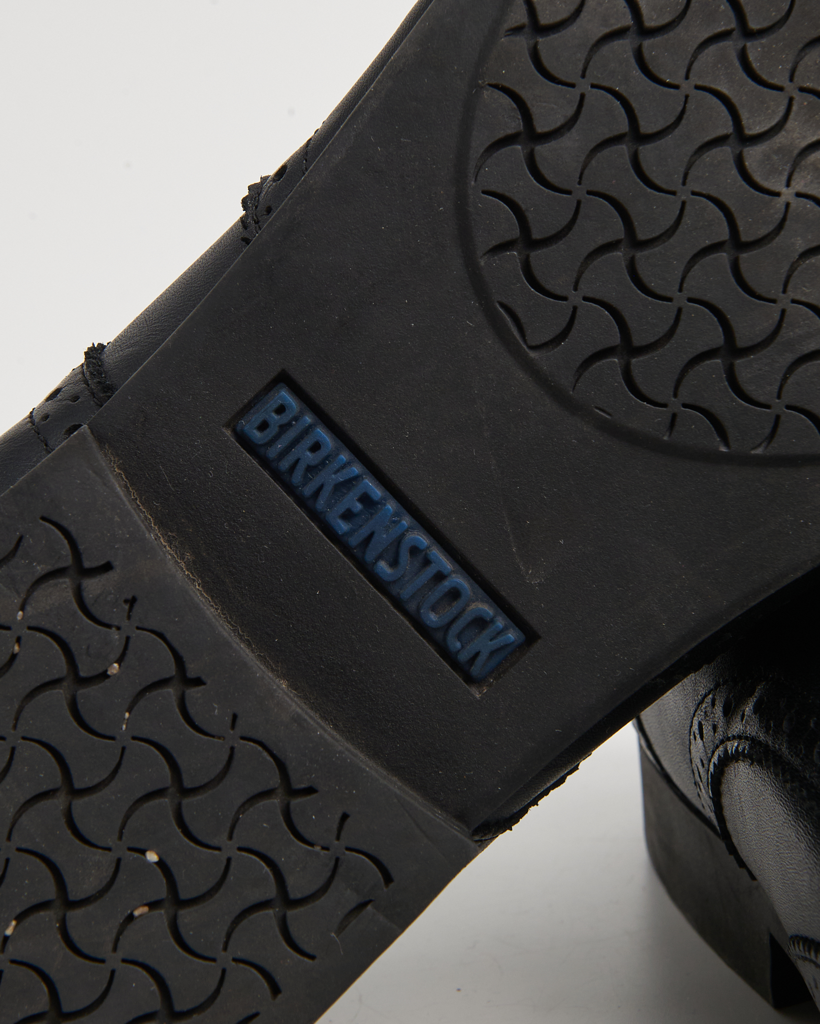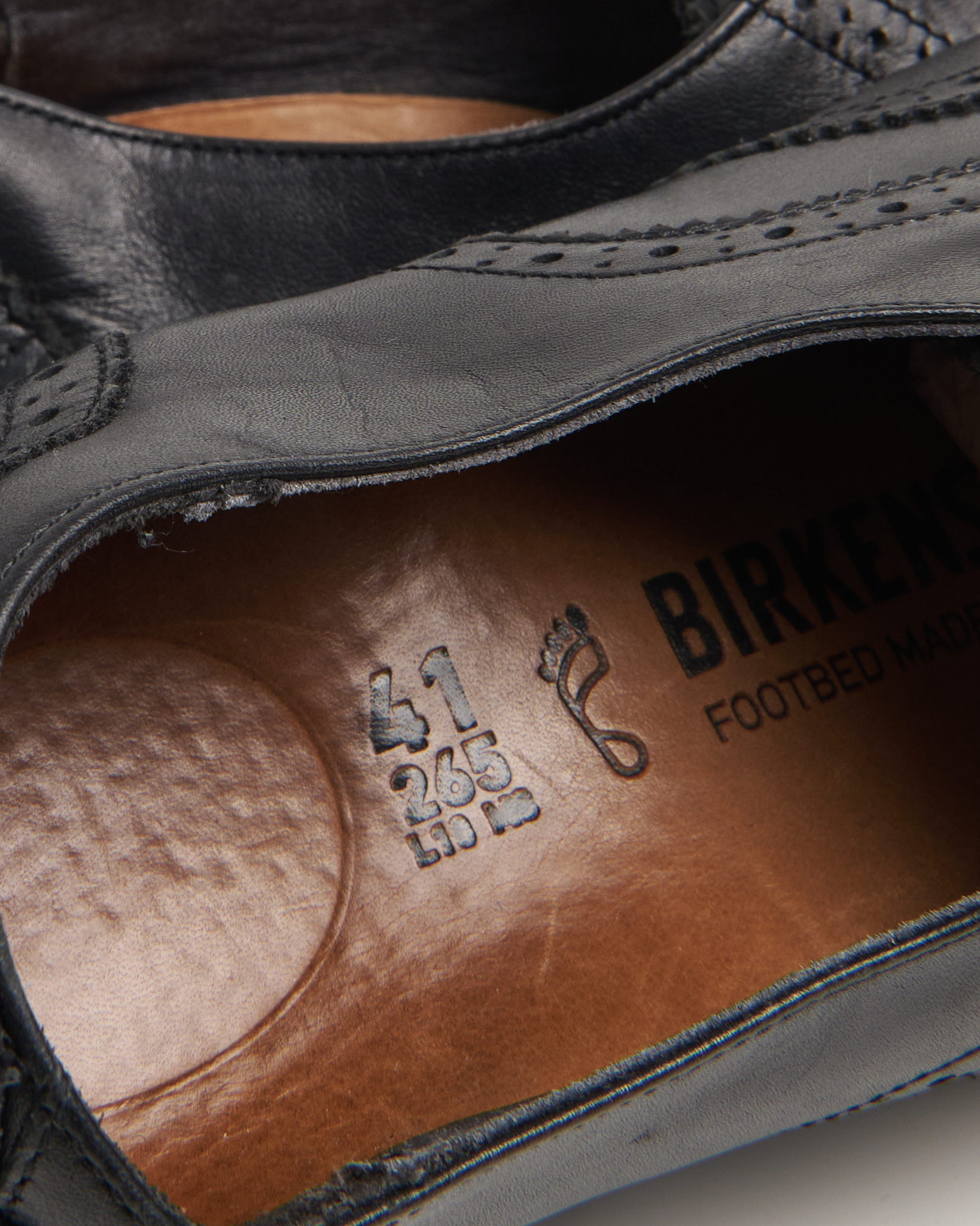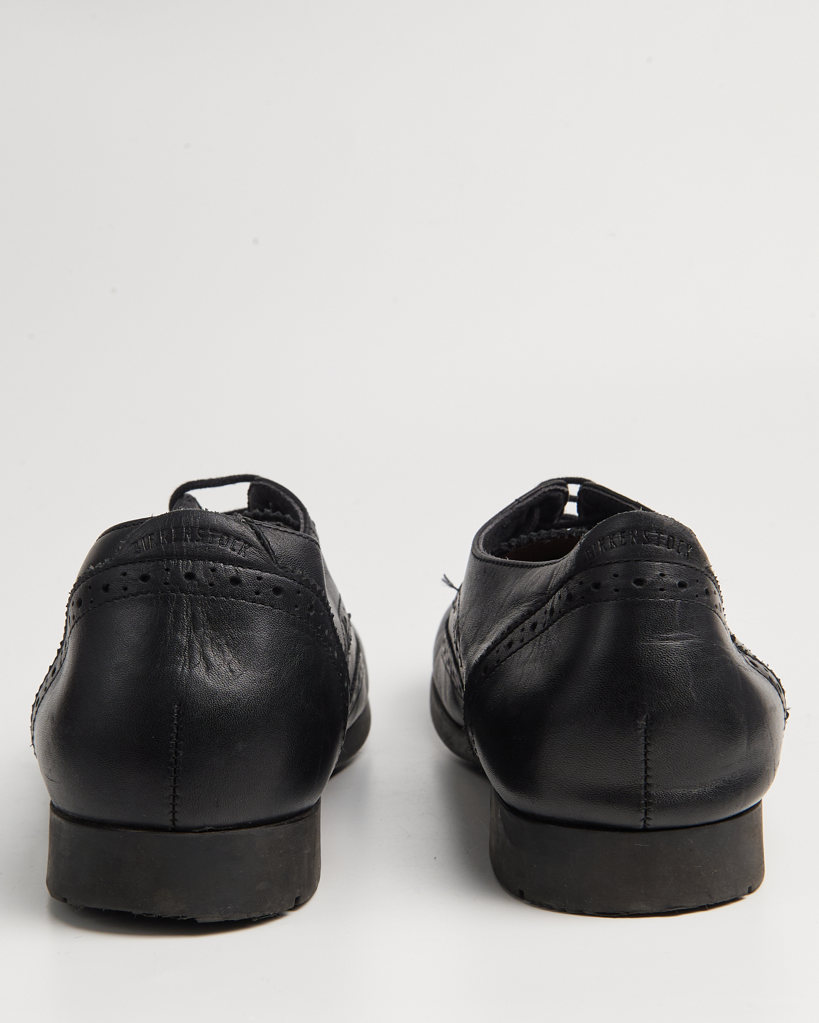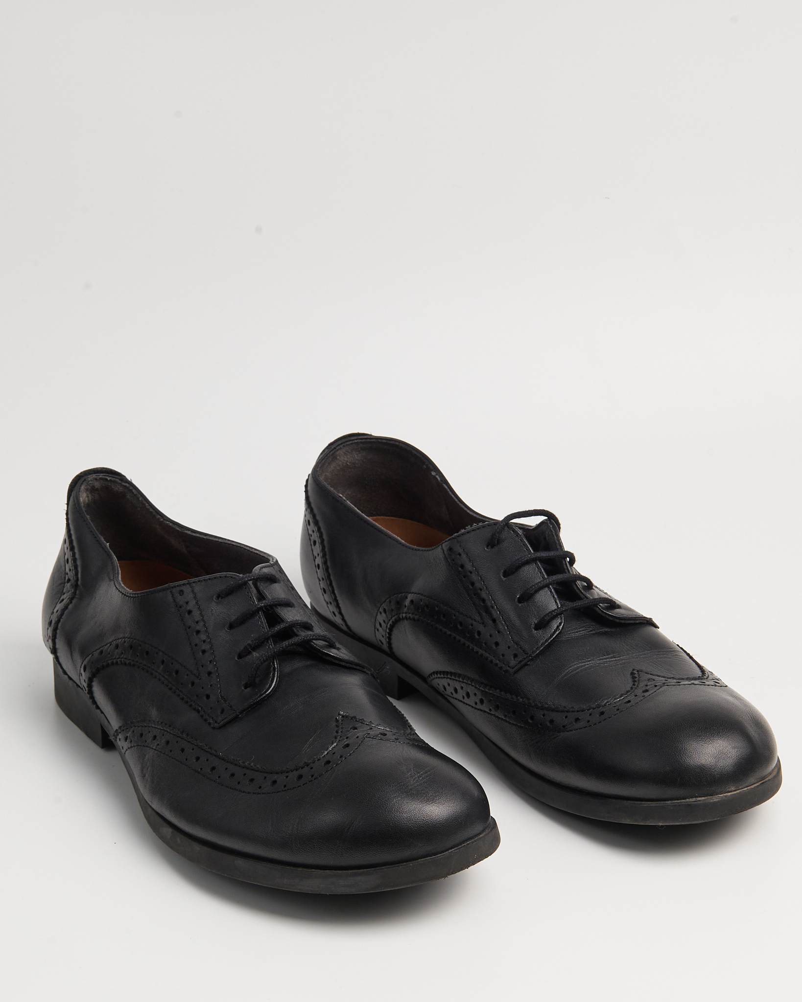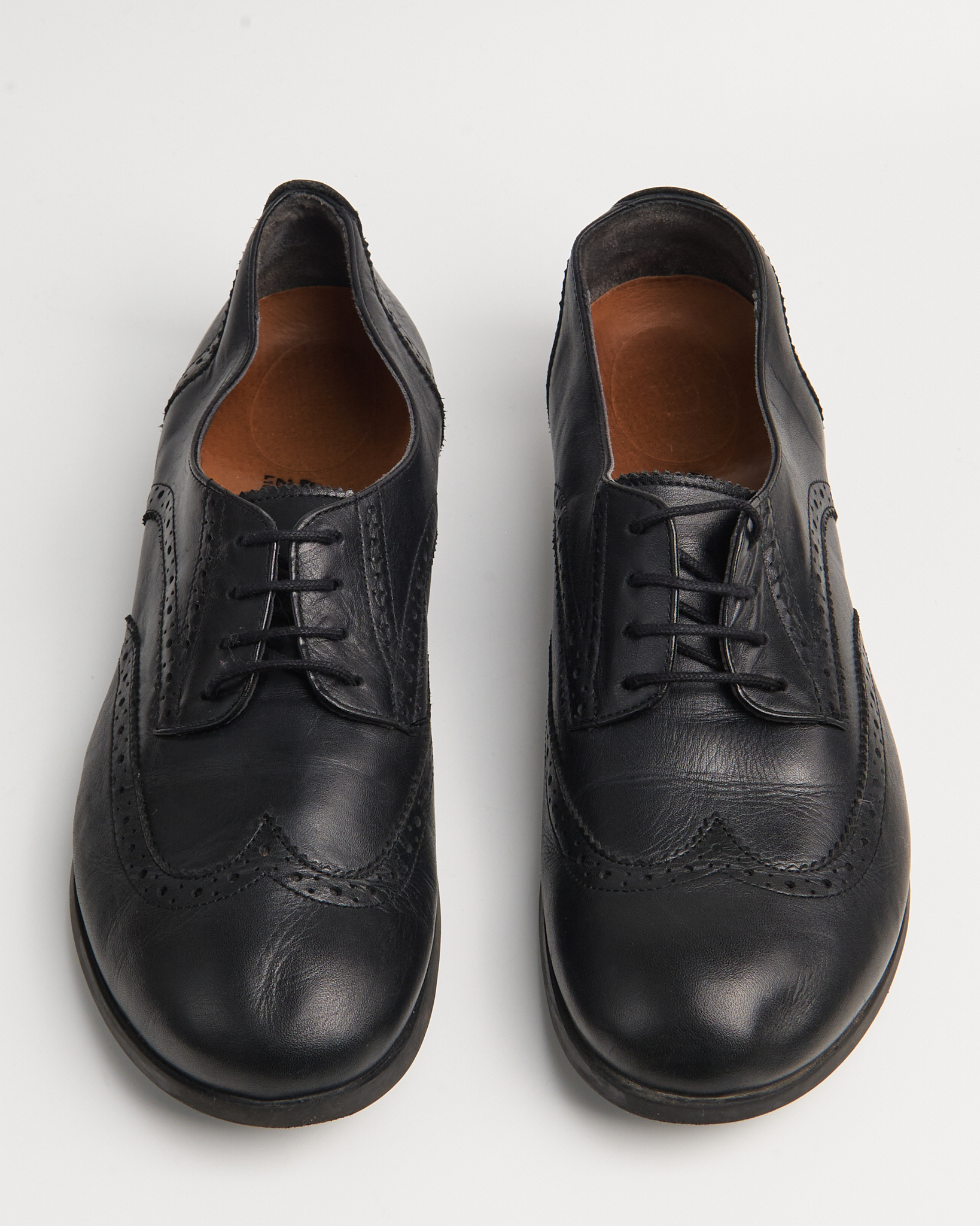 Чёрные кожаные туфли выполнены в традиционной форме броги с характерной перфорацией и декоративной строчкой