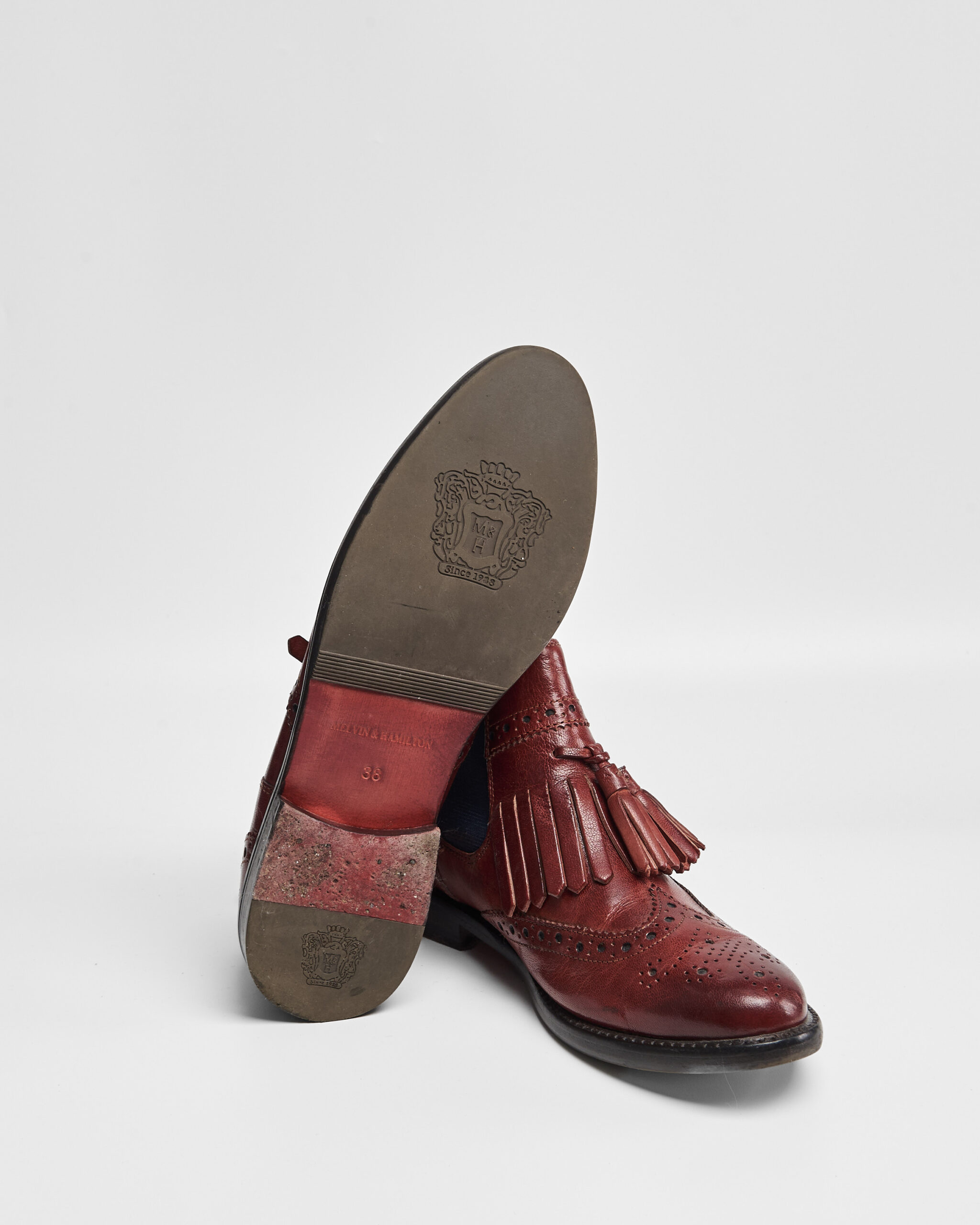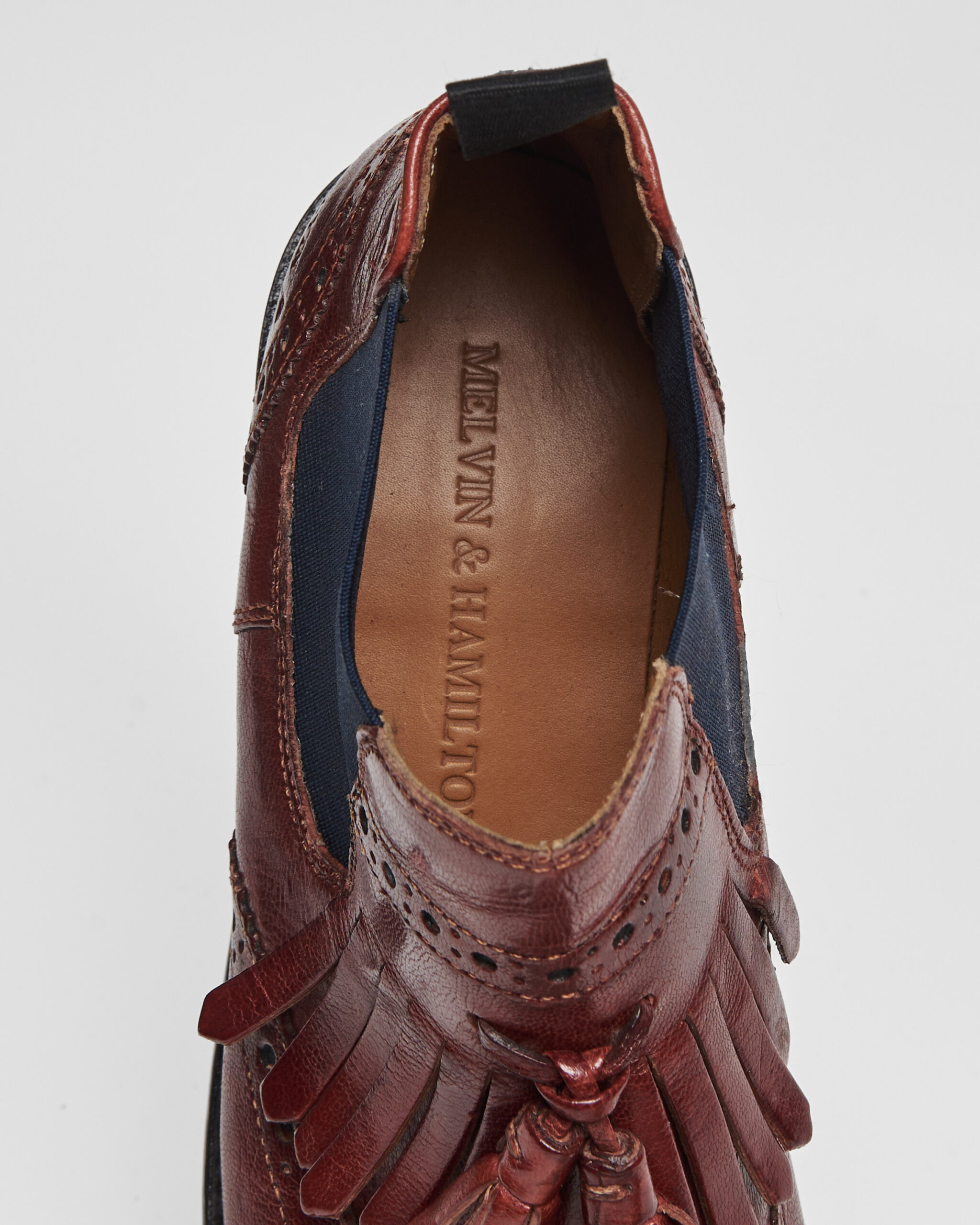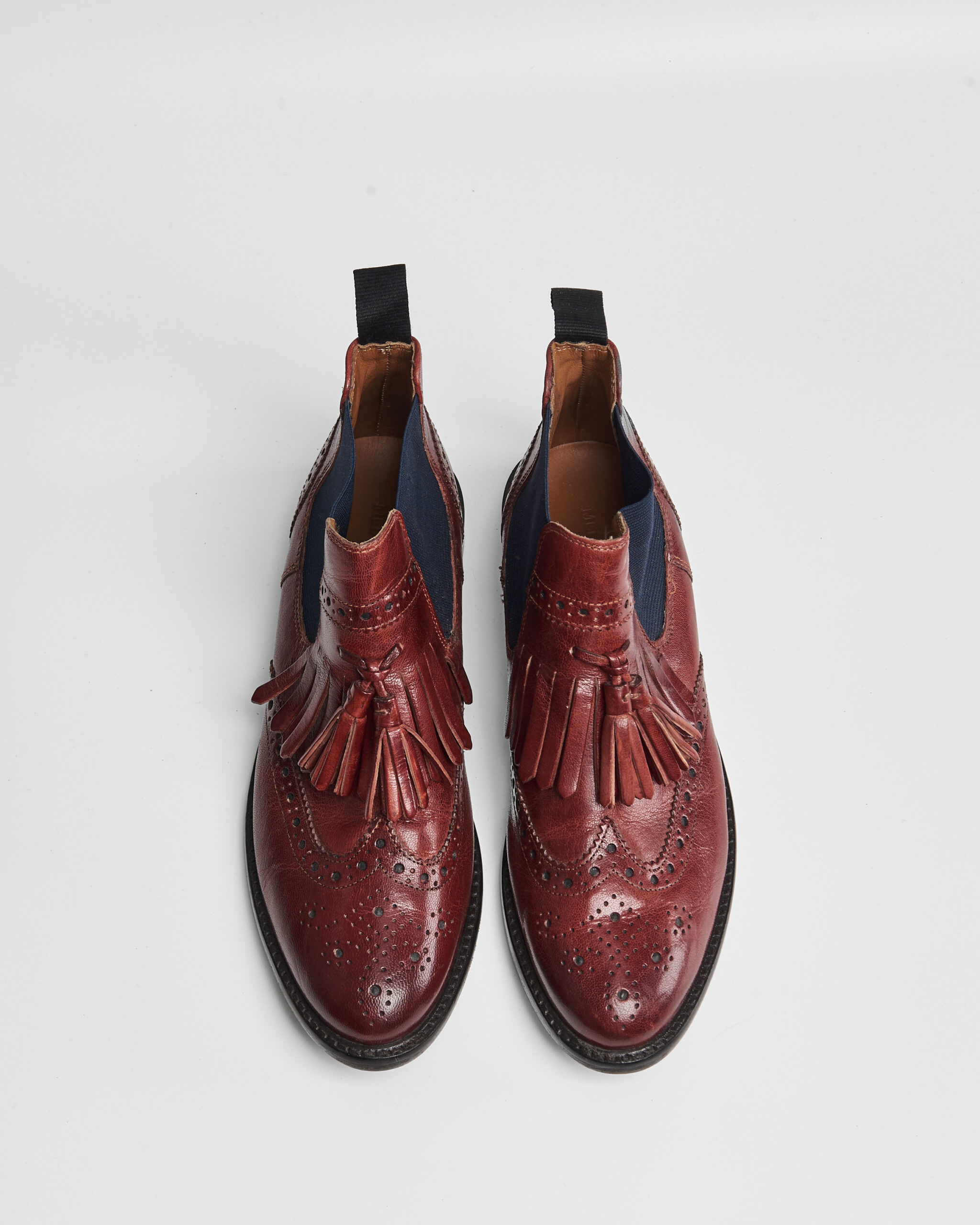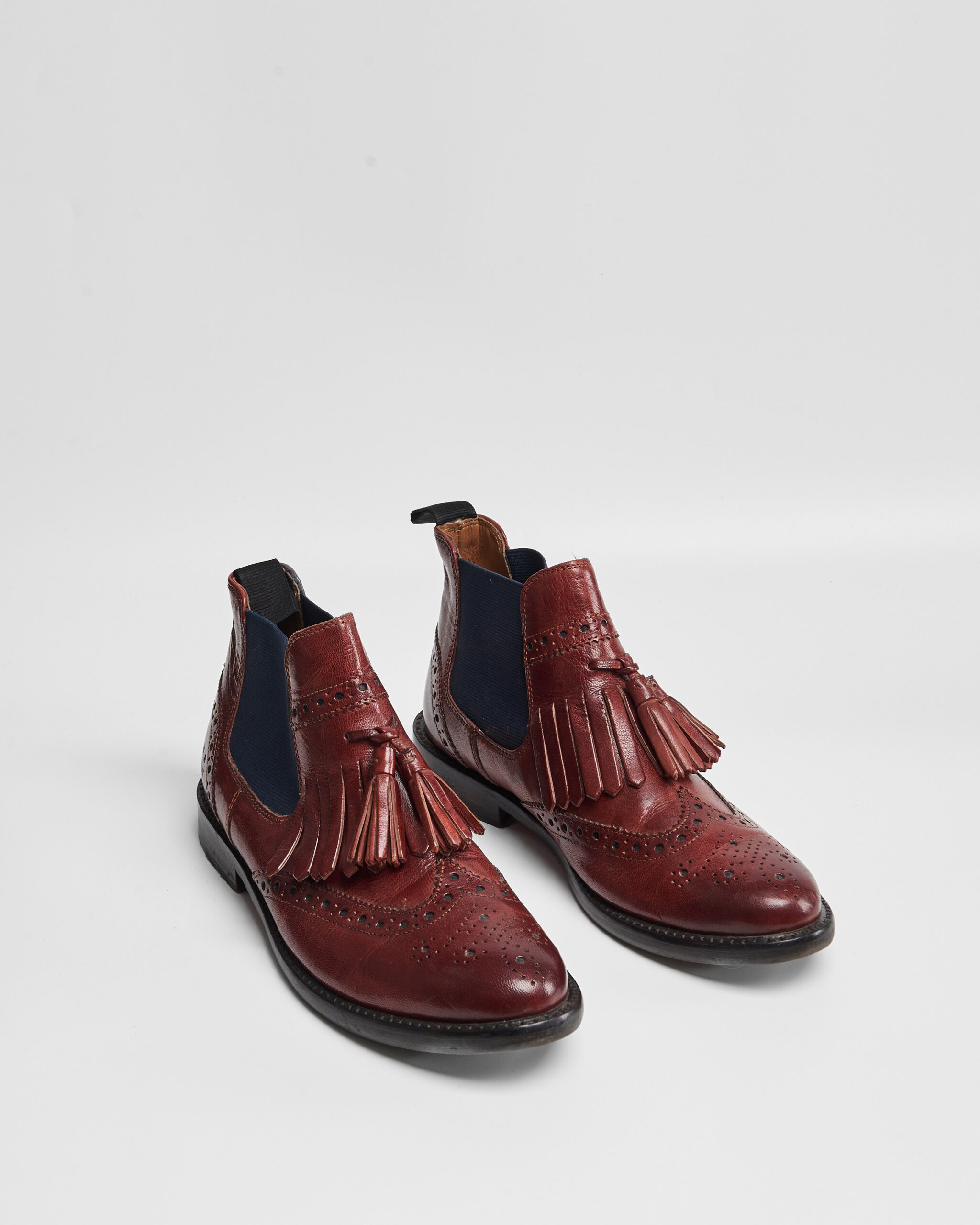 Пара выполнена из 100% гладкой кожи. Модель формирует устойчивую посадку благодаря боковым эластичным вставкам и аккуратно структурированной колодке. Детали в виде перфорации и кожаных кисточек делают образ выразительным.