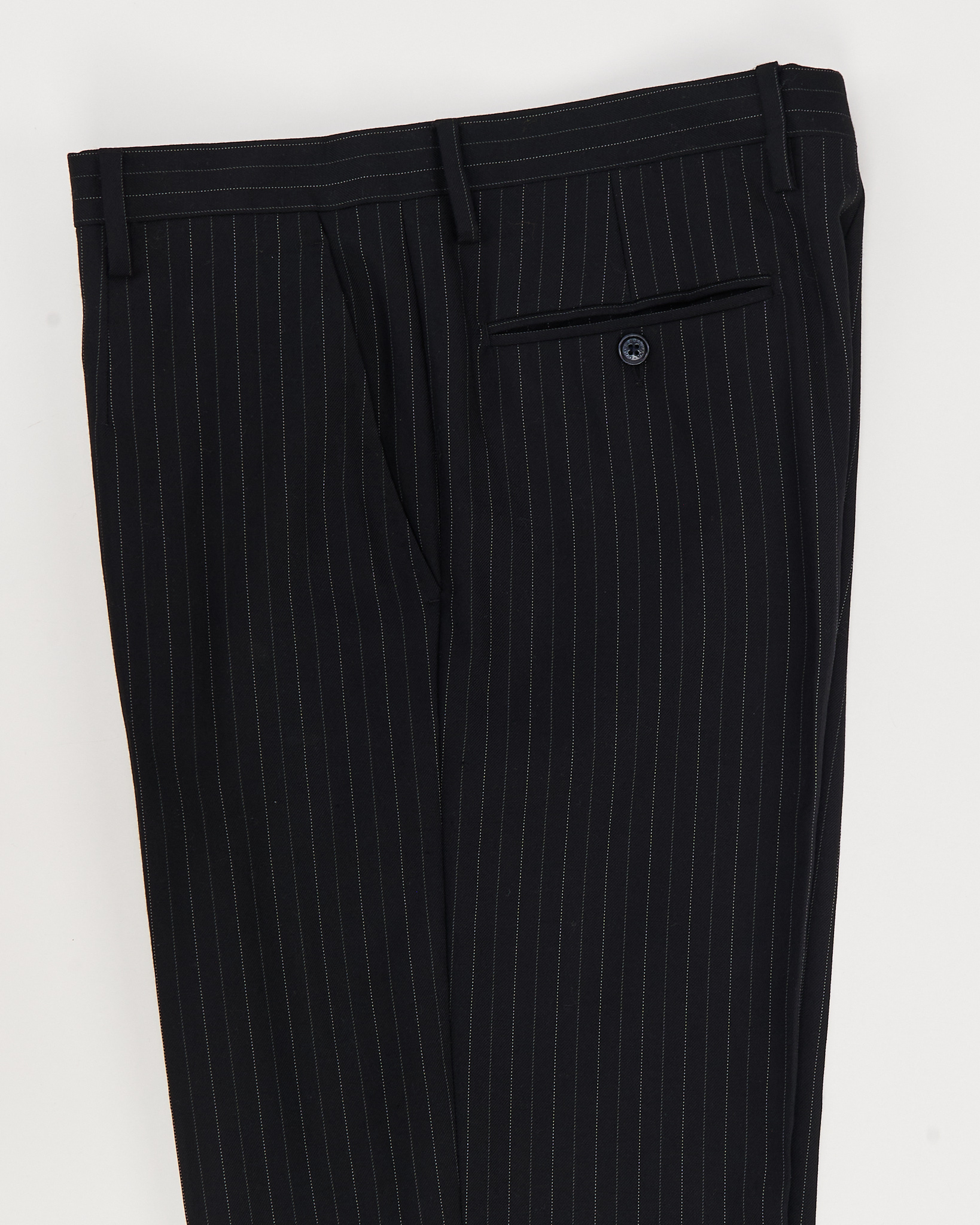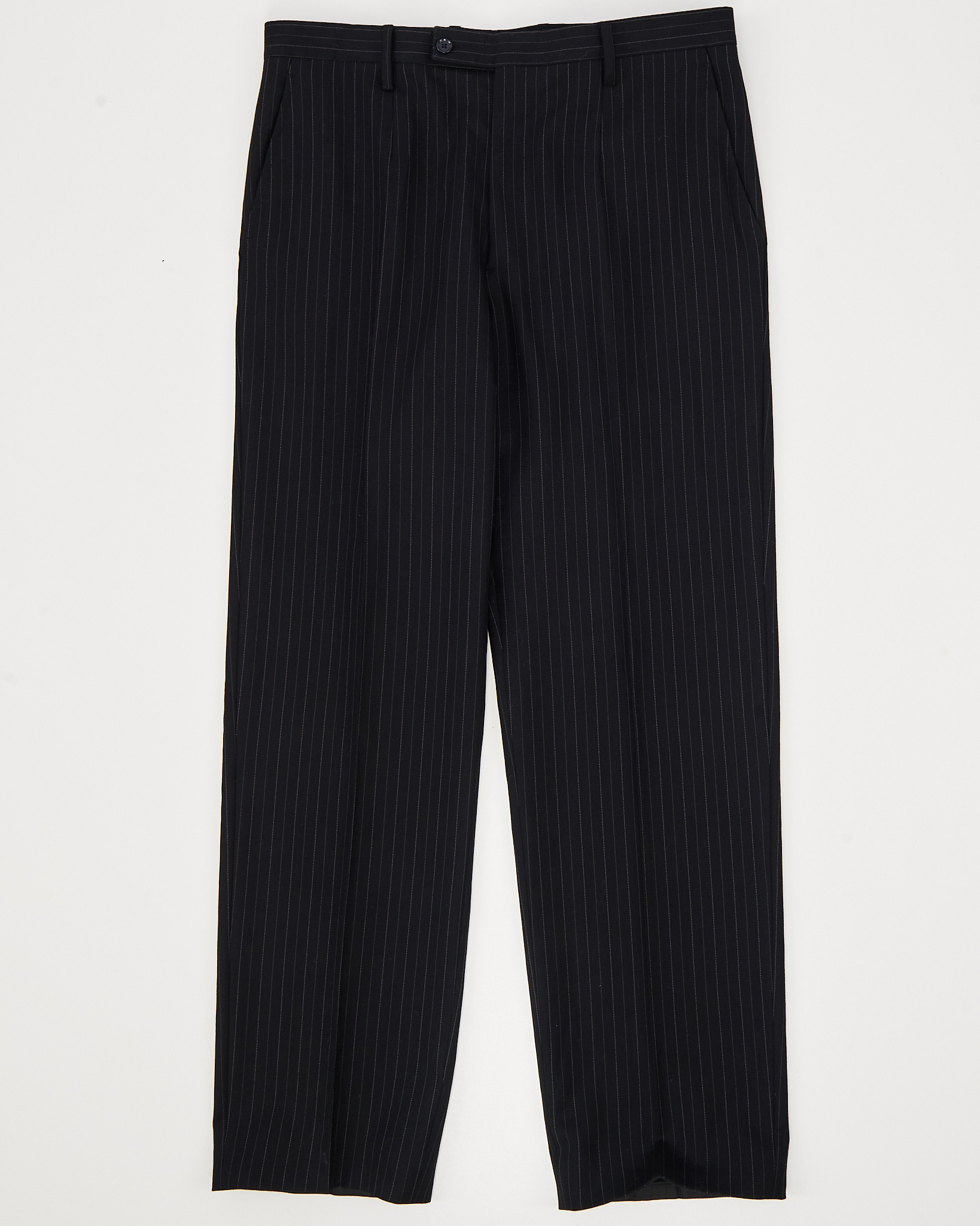 Классические брюки из тонкой шерсти с вертикальной полоской. Вытянутый силуэт, благодаря прямому крою и аккуратной посадке по талии. Внутренняя отделка с фирменной тесьмой, функциональные карманы.