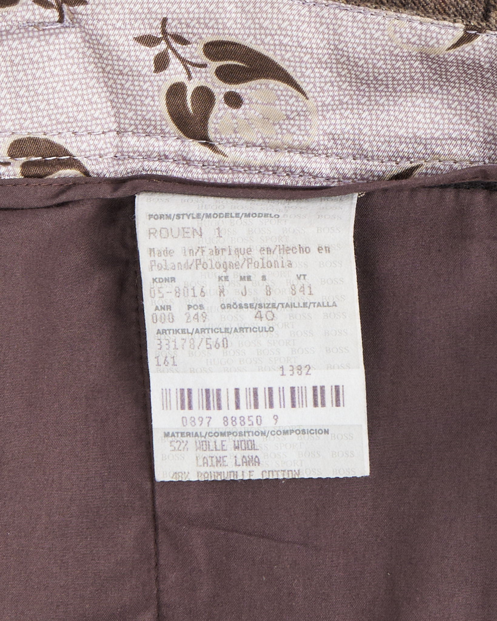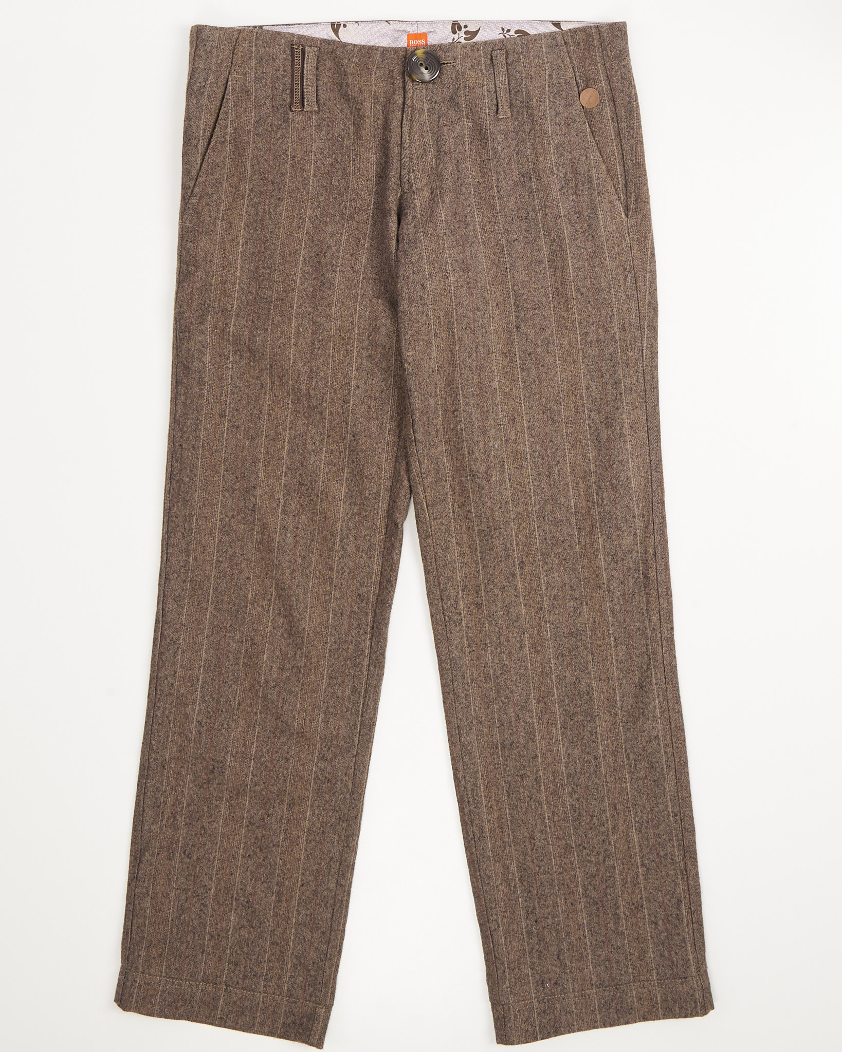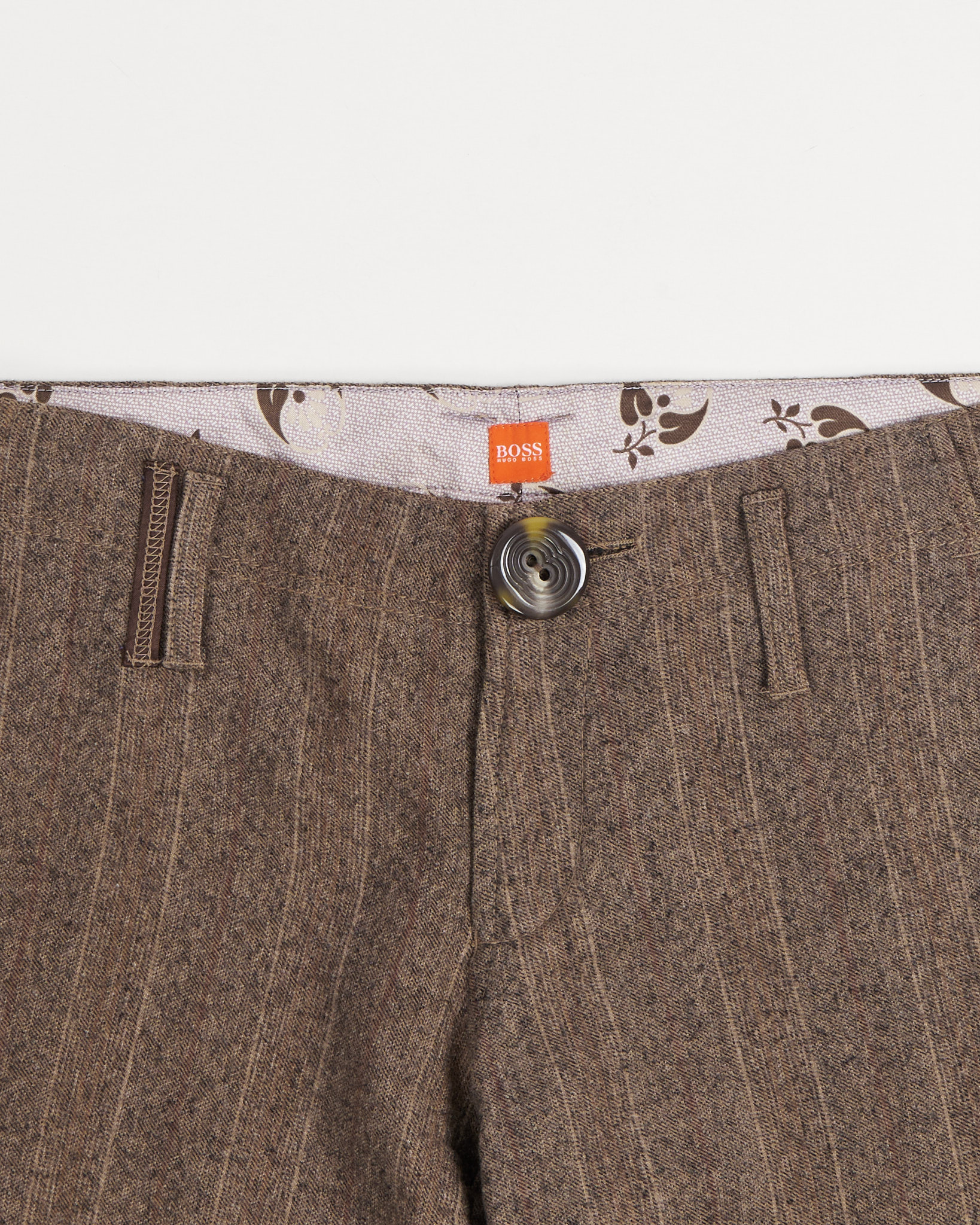 Фактурные шерстяные брюки Hugo Boss. Прямой крой, бархатный хлястик на поясе сзади и пуговицы с эффектом потертости, функциональные карманы.