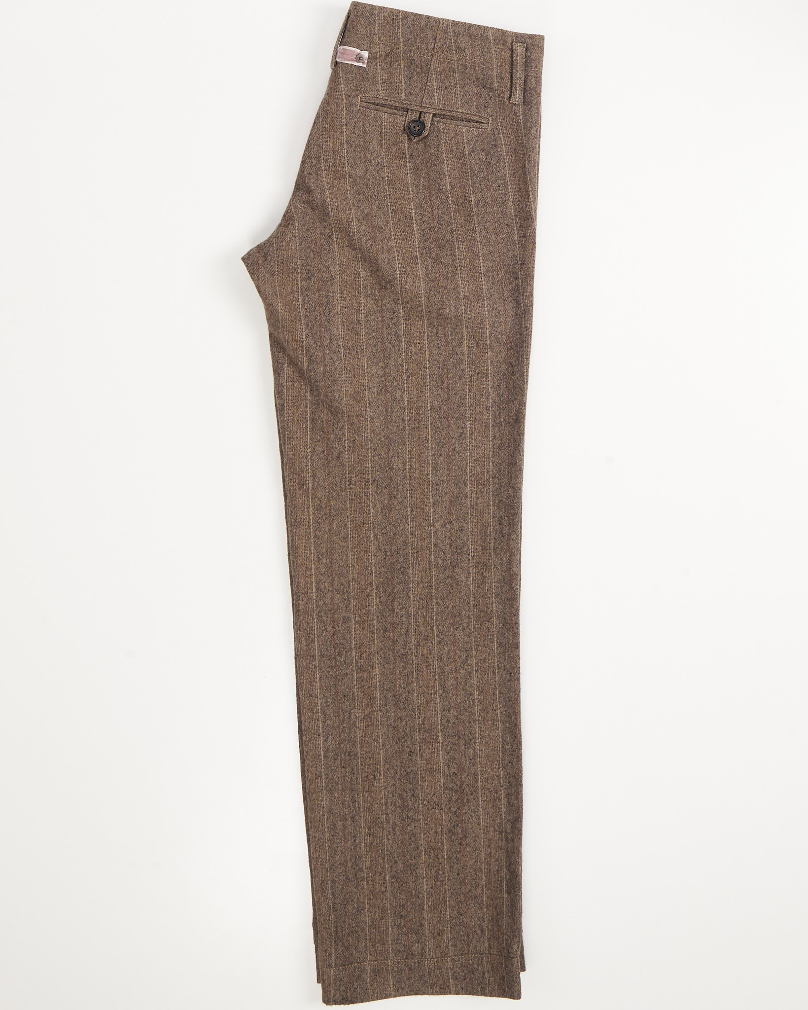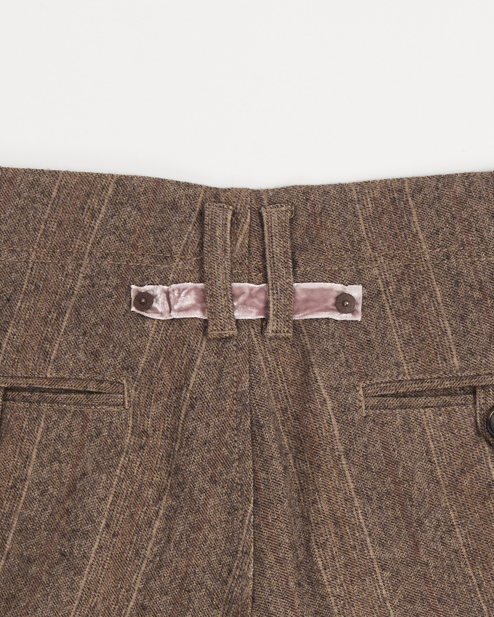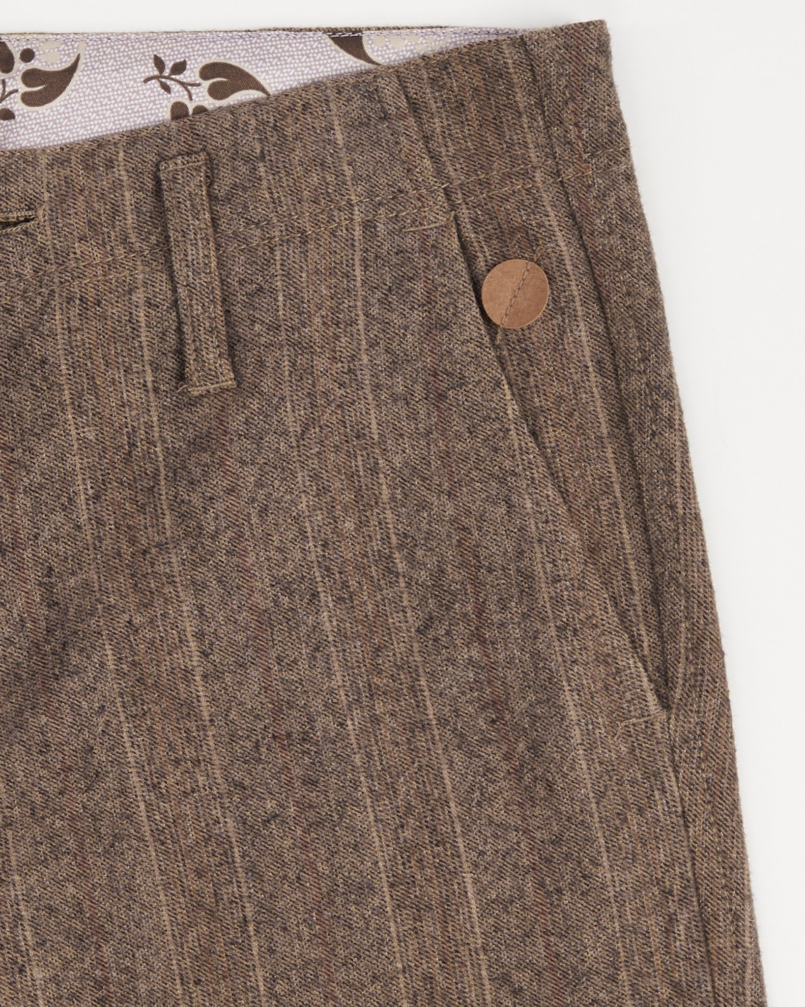 Фактурные шерстяные брюки Hugo Boss. Прямой крой, бархатный хлястик на поясе сзади и пуговицы с эффектом потертости, функциональные карманы.