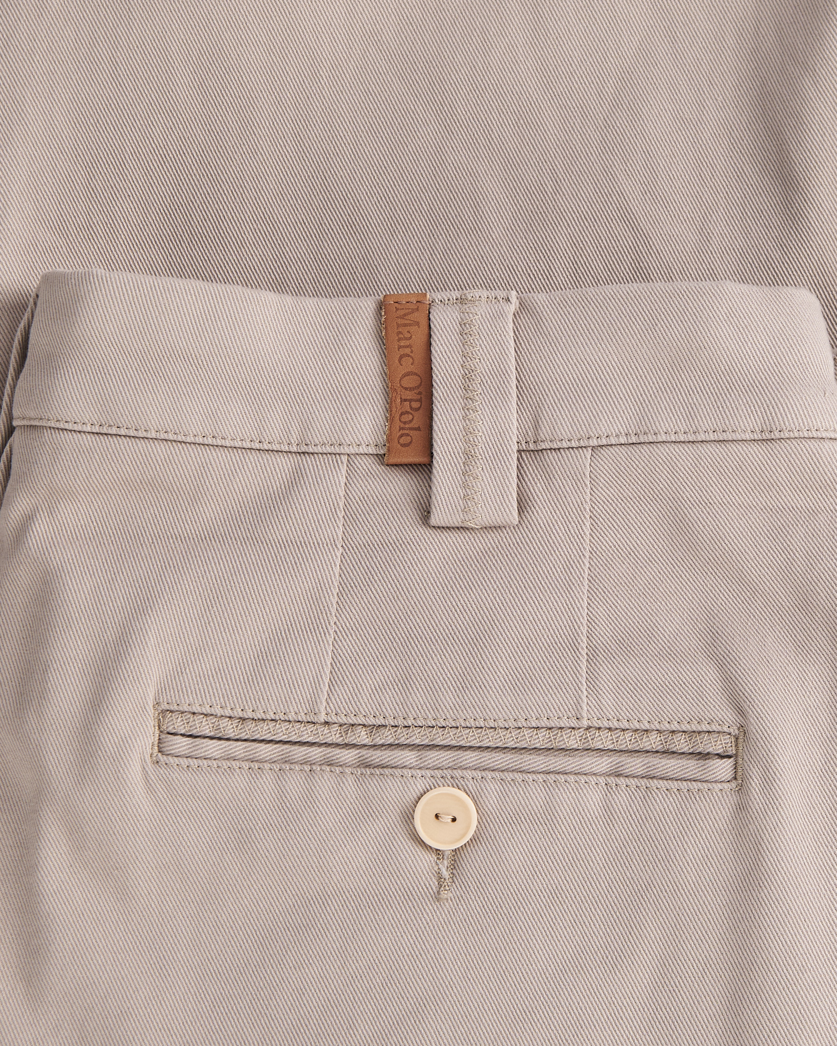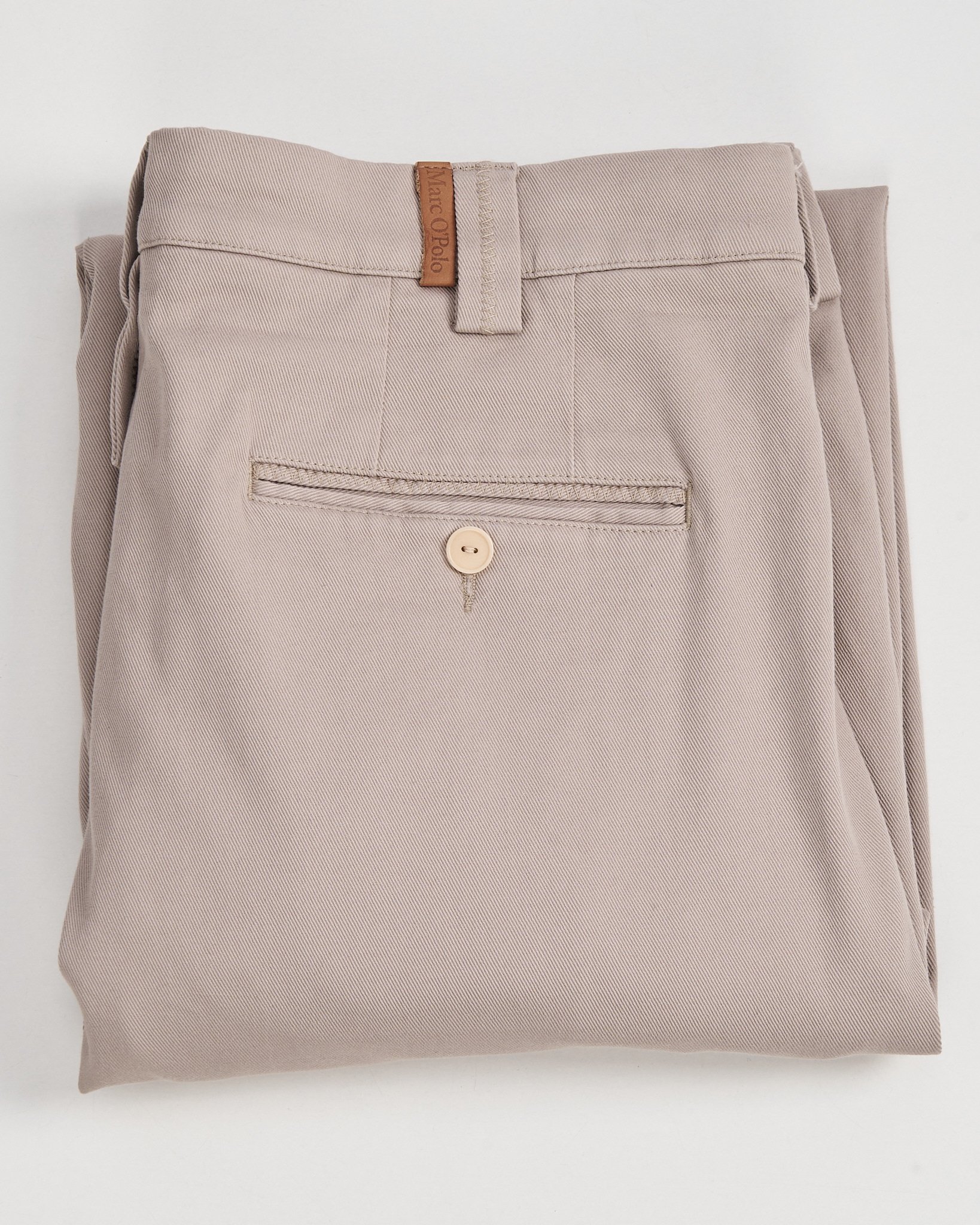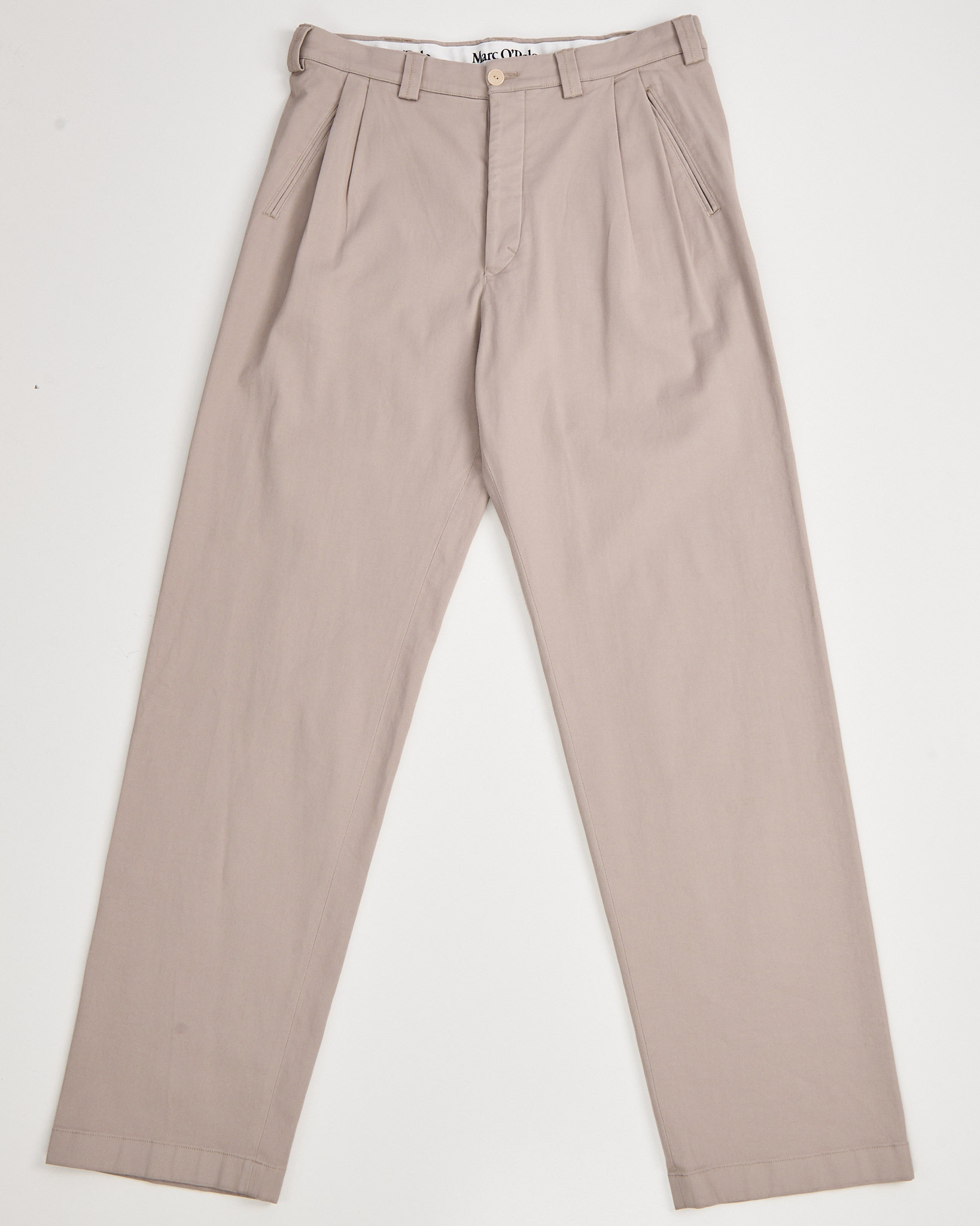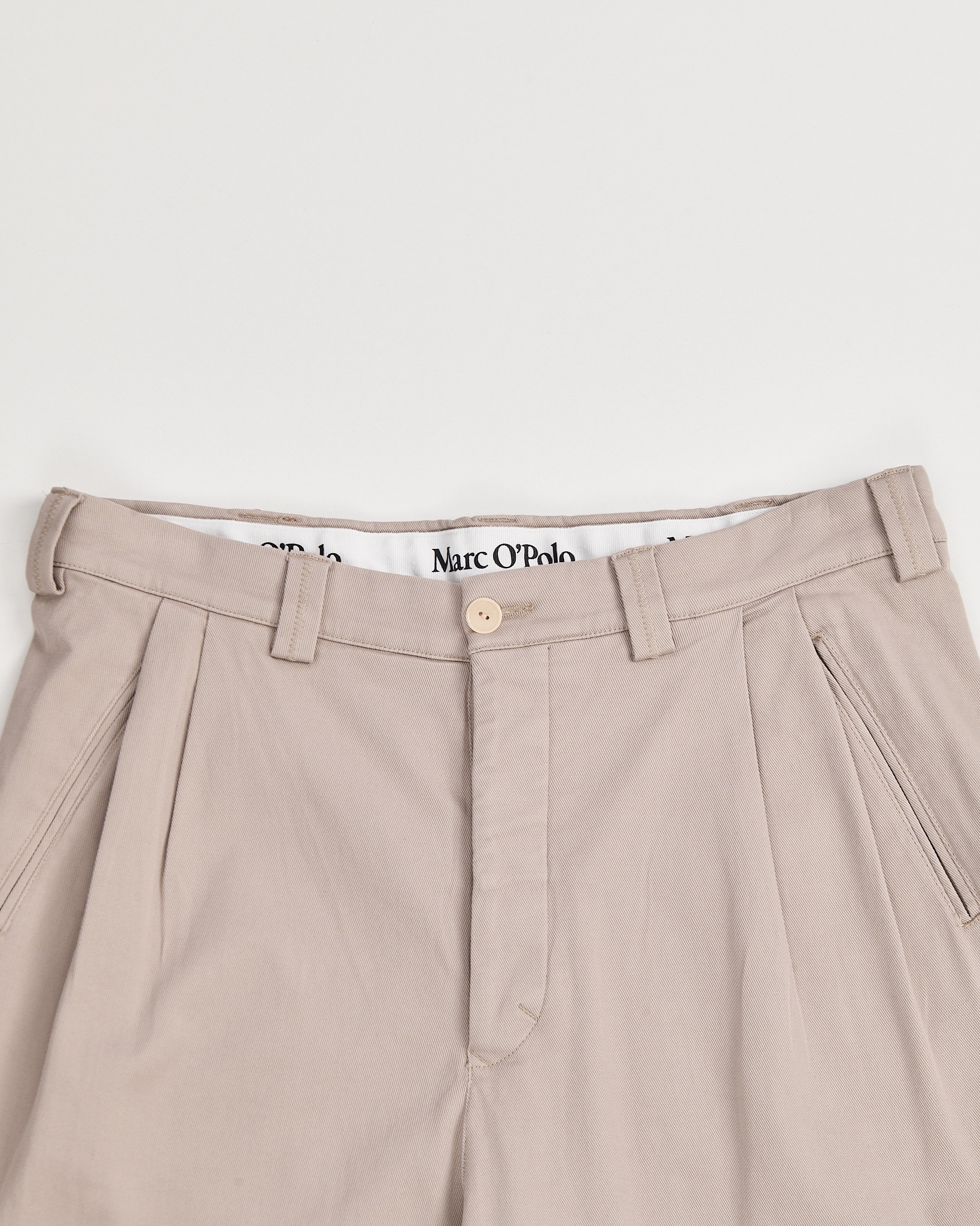 Брюки Marc O’Polo из плотной хлопковой ткани светлого бежевого оттенка. Посадка высокая, спереди заложены складки, линия брюк формирует свободный и аккуратный силуэт. Функциональные карманы.