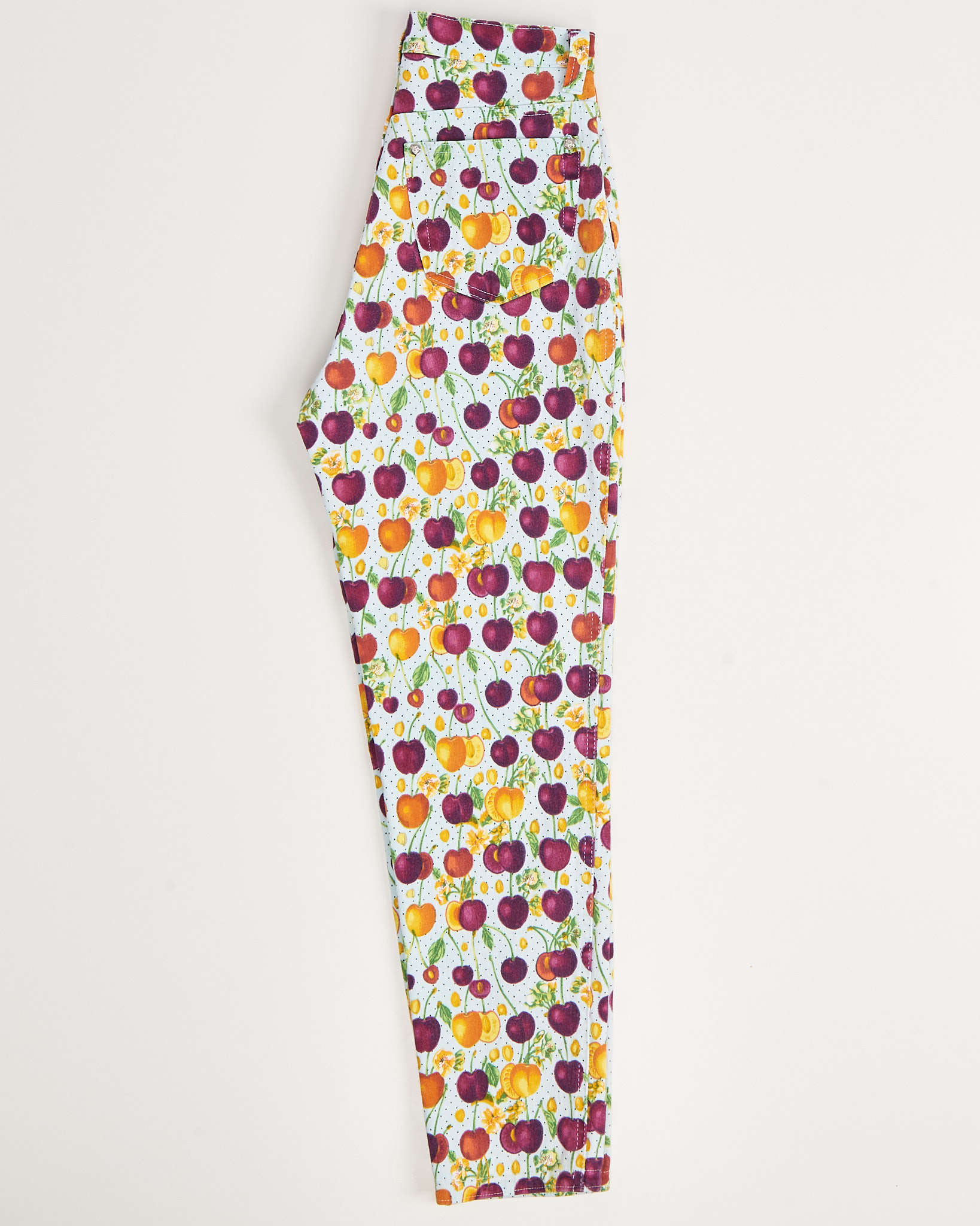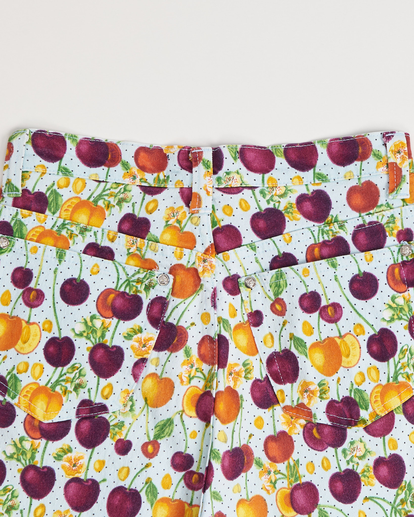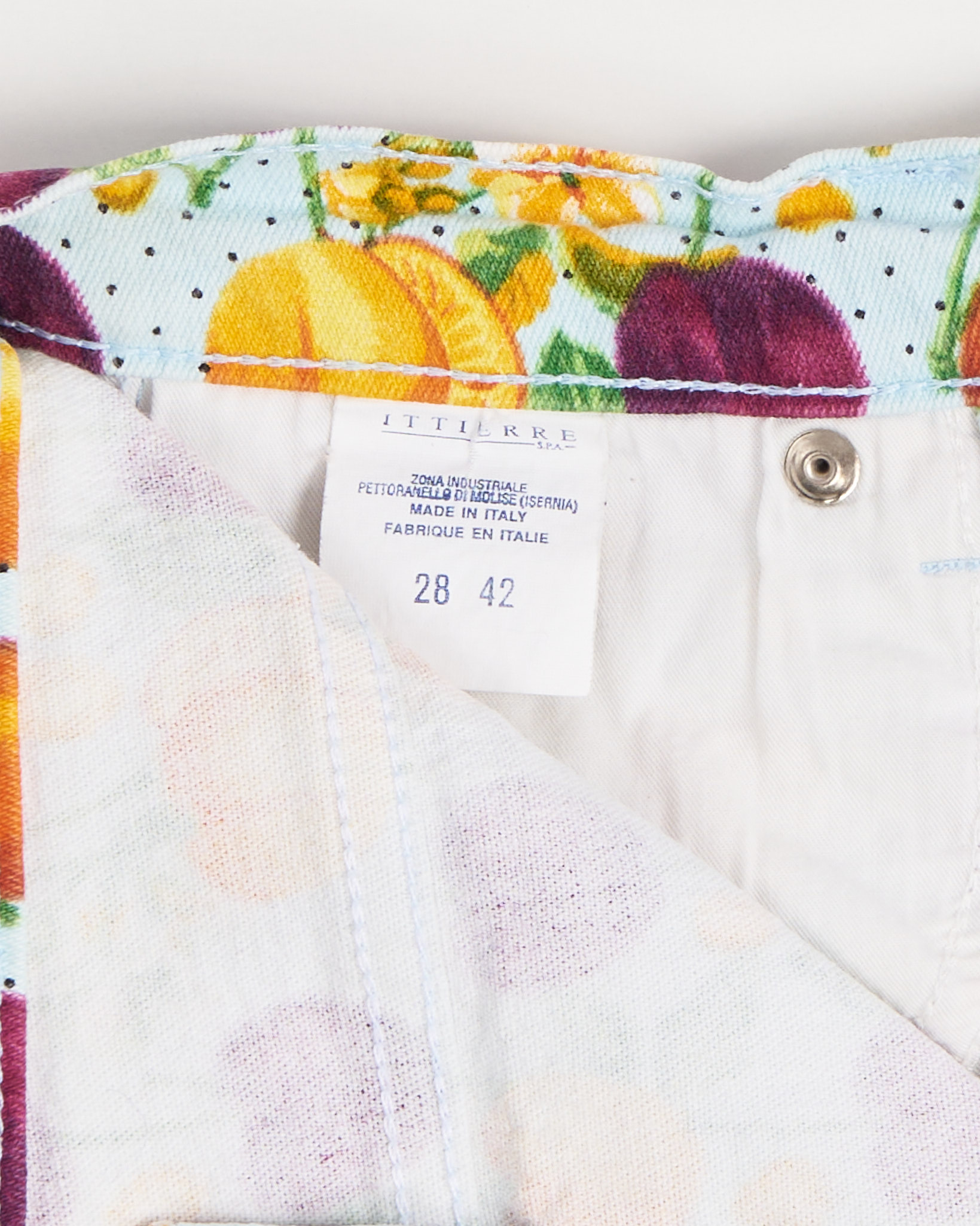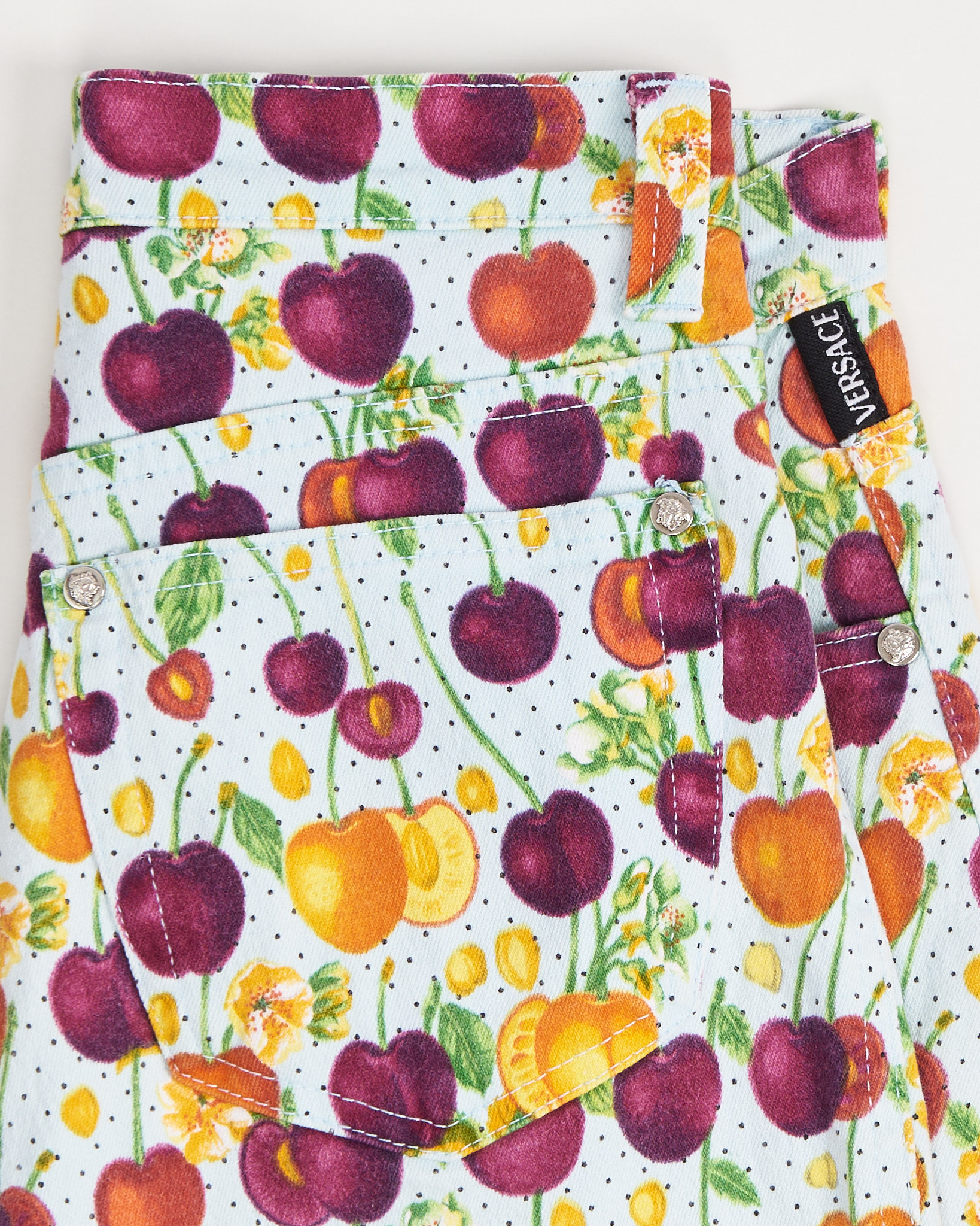 Белая основа с насыщенным разноцветным принтом. Четыре кармана, серебристая фурнитура с логотипом. Фирменная нашивка Versace внутри. Сделаны в Италии