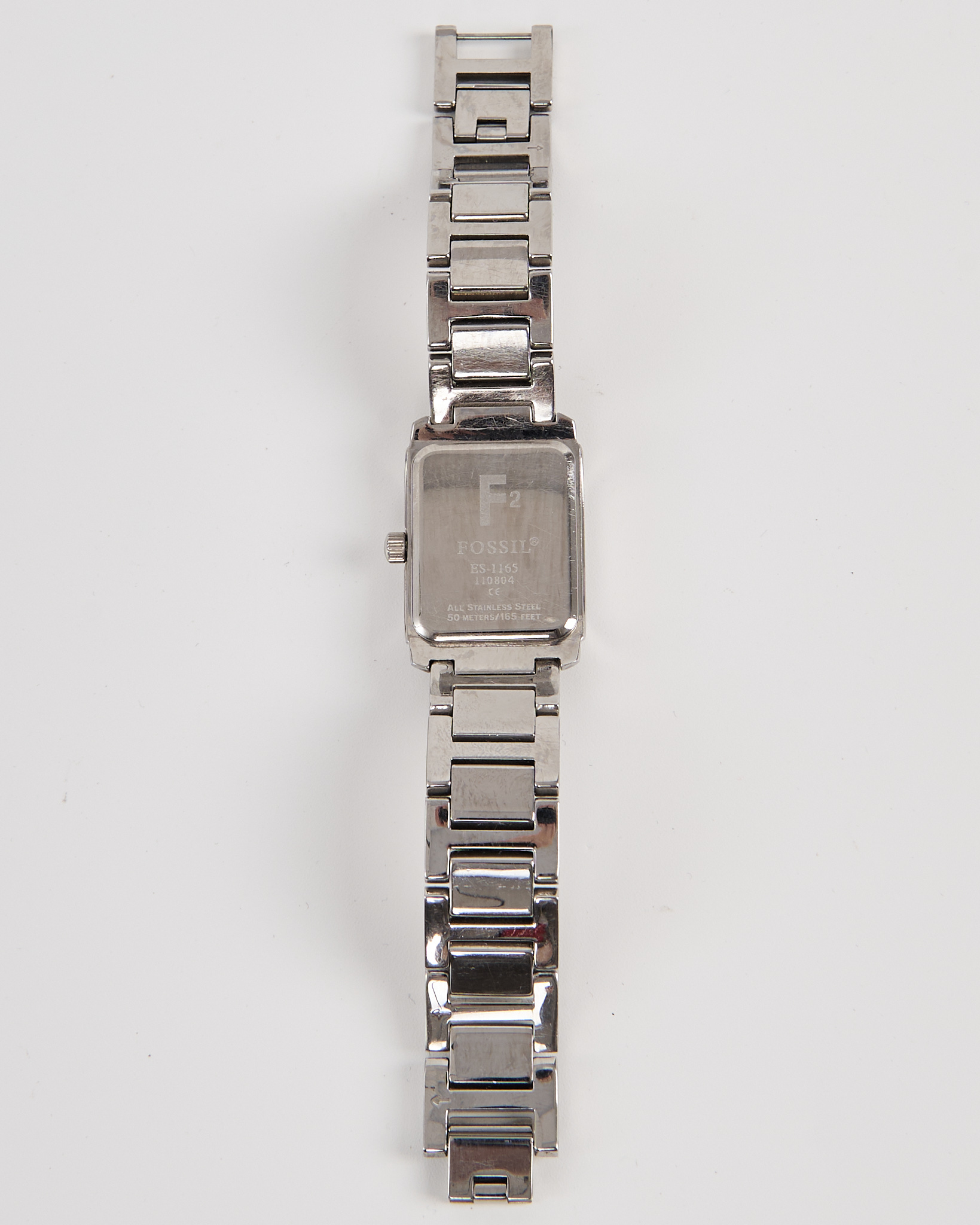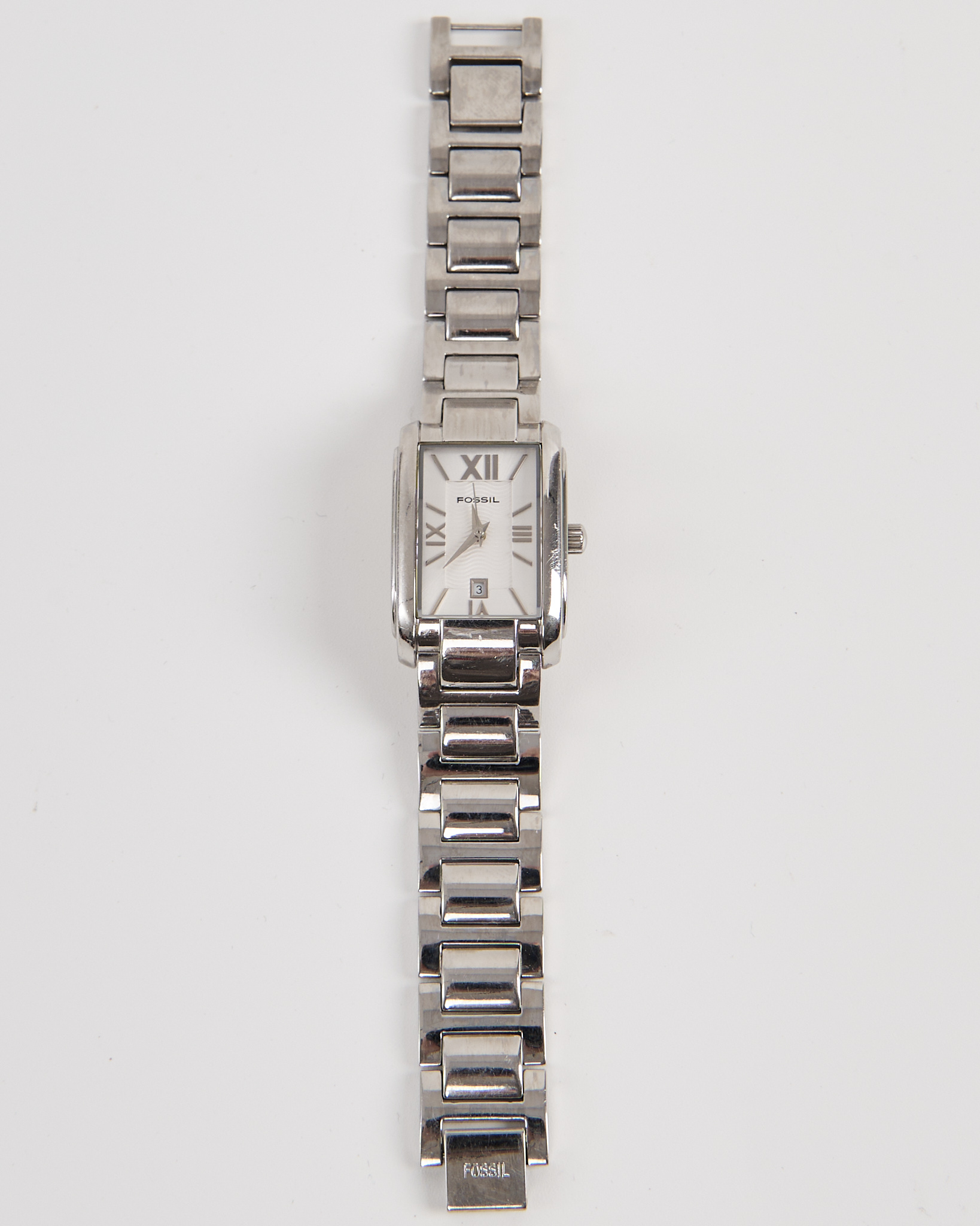 Часы Fossil на металлическом браслете. Прямоугольный корпус, светлый циферблат с римскими цифрами хорошо читается. Металлический браслет с удобной застежкой.