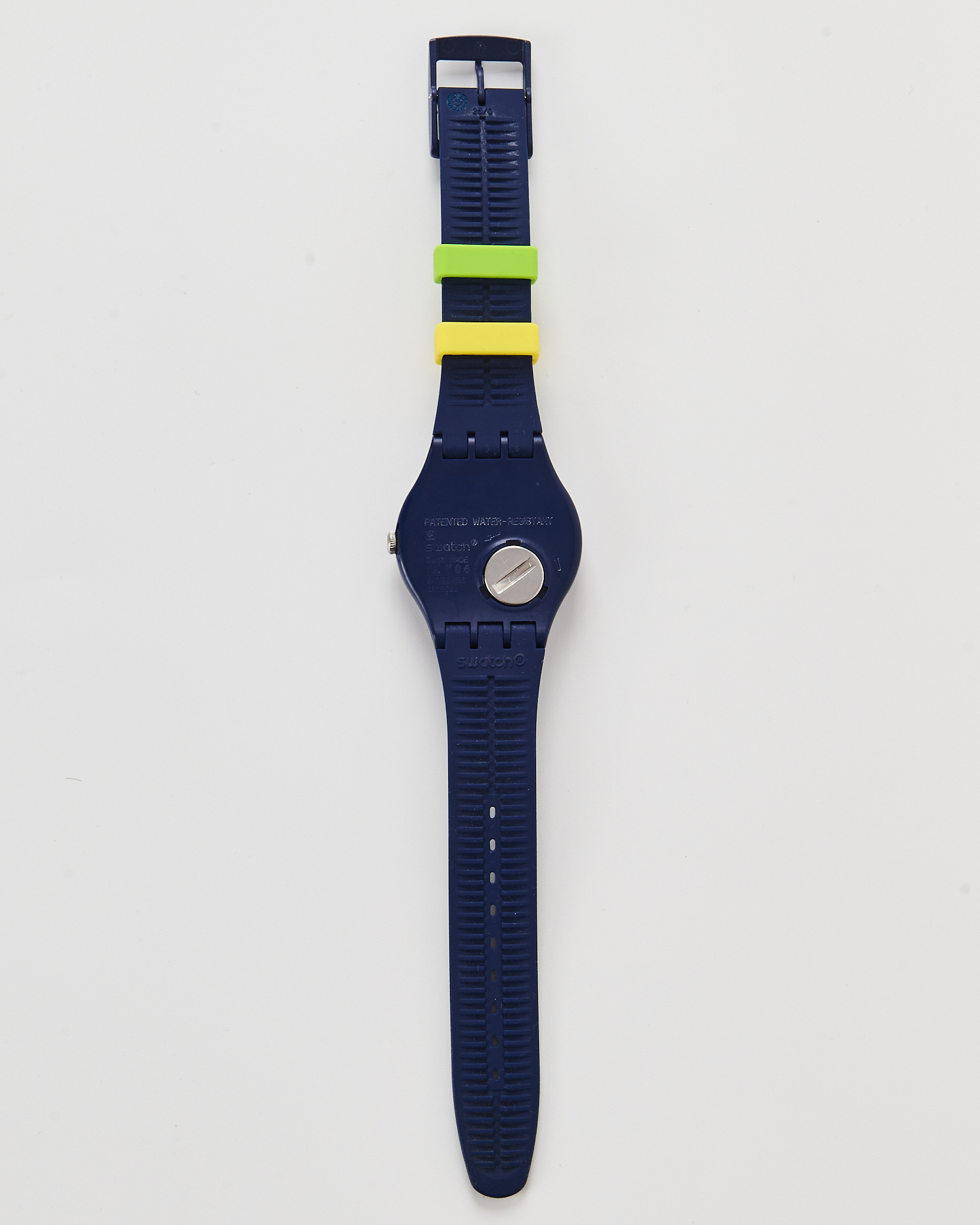 Часы Swiss в синем цвете. Часы комфортны в носке, благодаря гибкому браслету. Компактный циферблат с тонкими красными стрелками, акцентные желтые и зеленые крепления на ремешках.