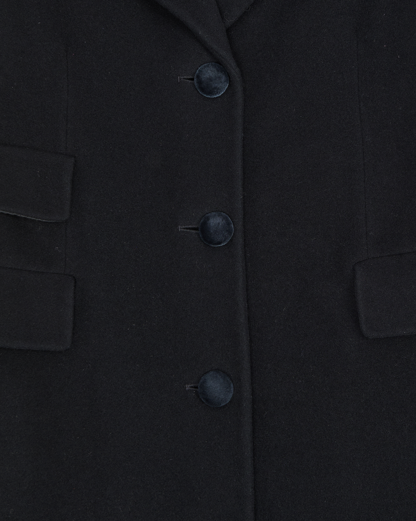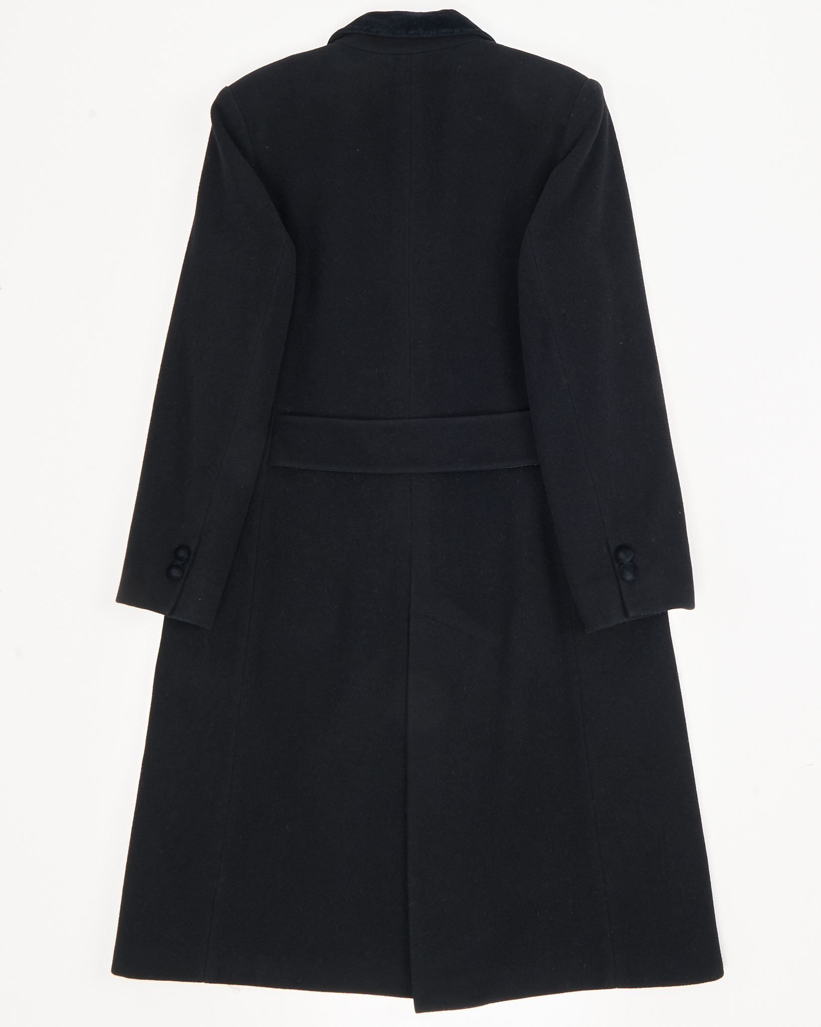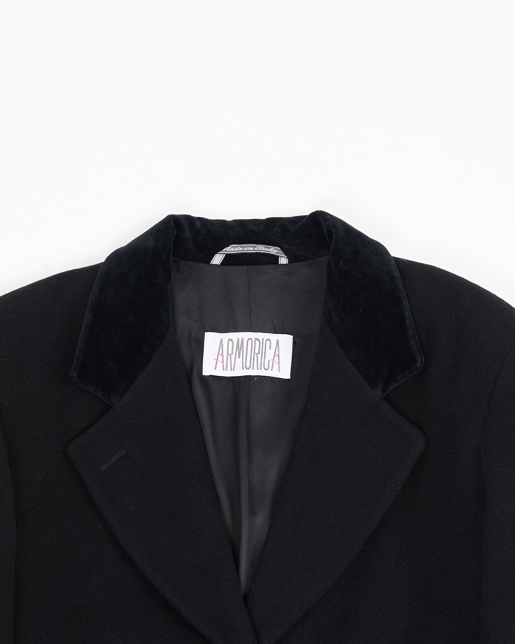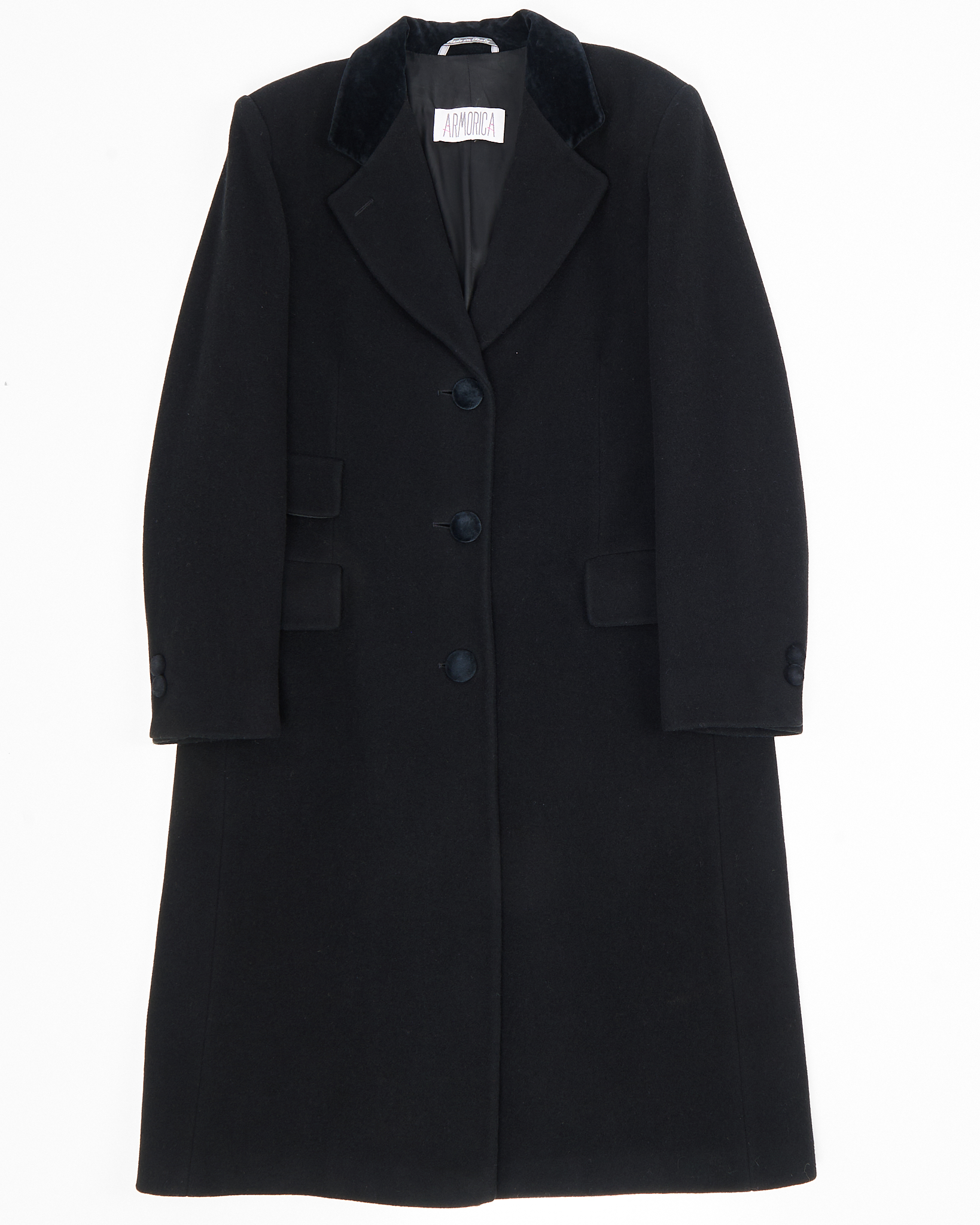 Классическое черное пальто от бренда Armorica. Выполнено из плотной шерстяной ткани, хорошо держит форму. Прямой удлинённый силуэт, застежка на три обтянутые бархатные пуговицы.