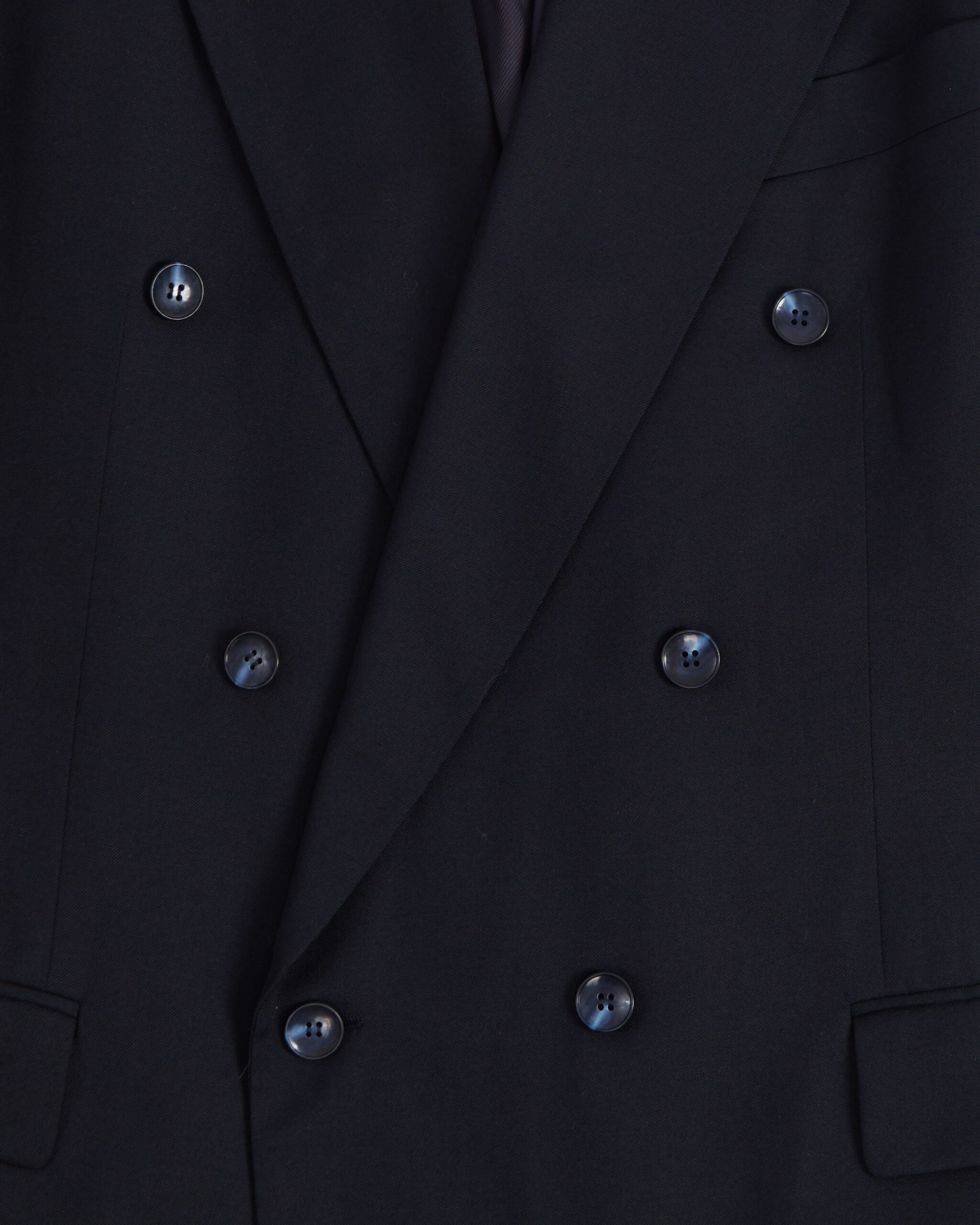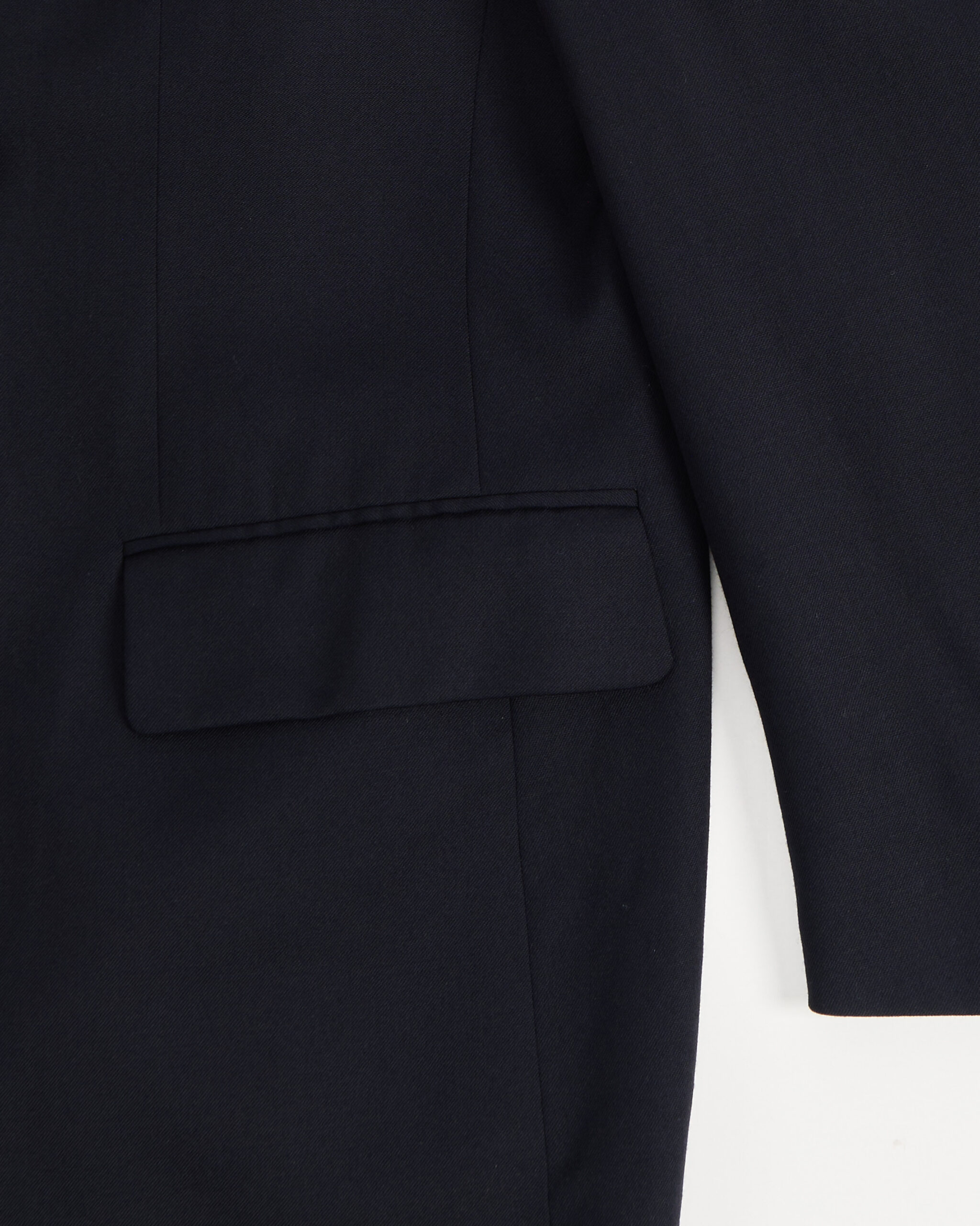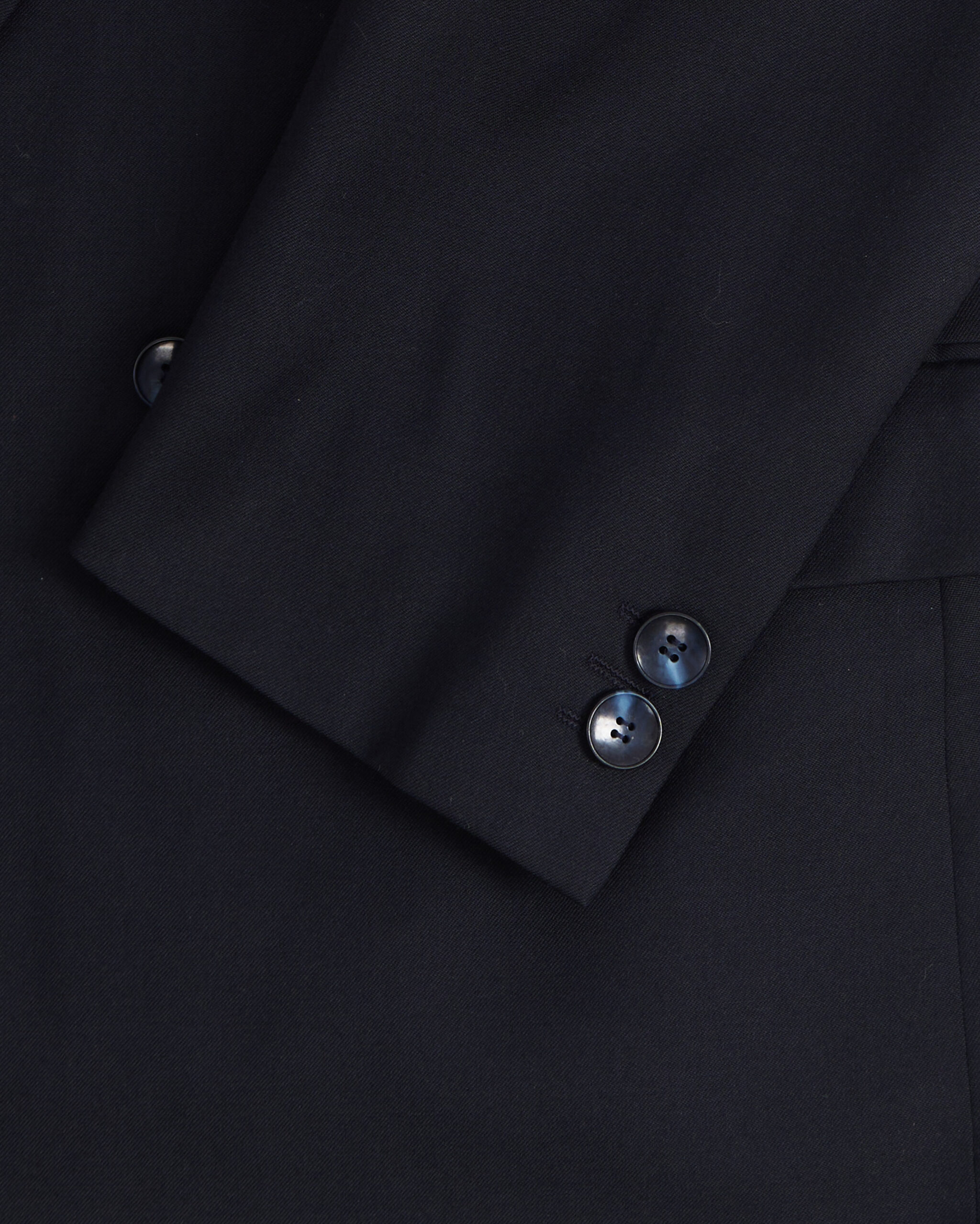 Пиджак выполнен из плотной костюмной шерсти глубокого темно-синего оттенка. Широкая линия плеч и удлиненный силуэт. Материал мягкий и гладкий.