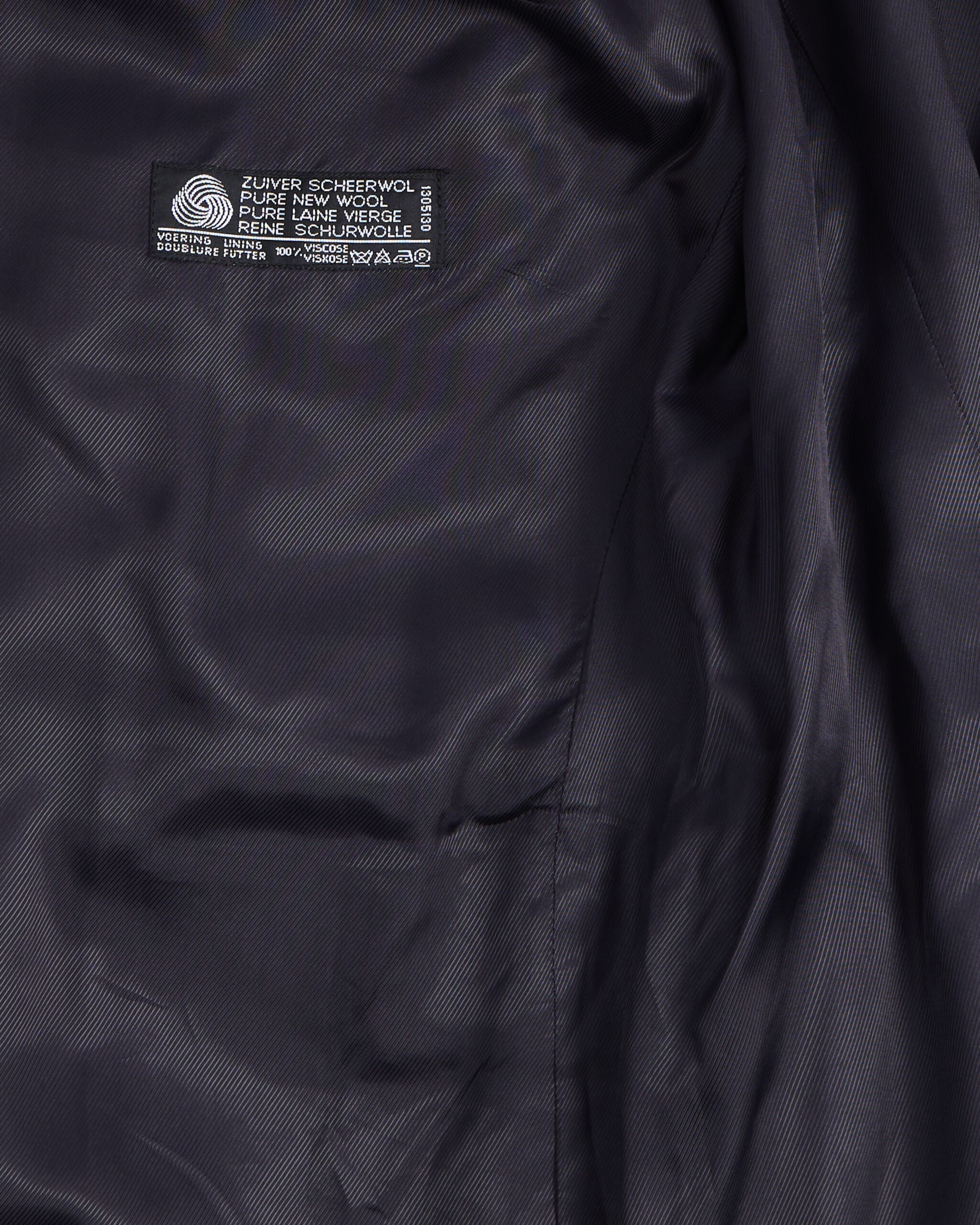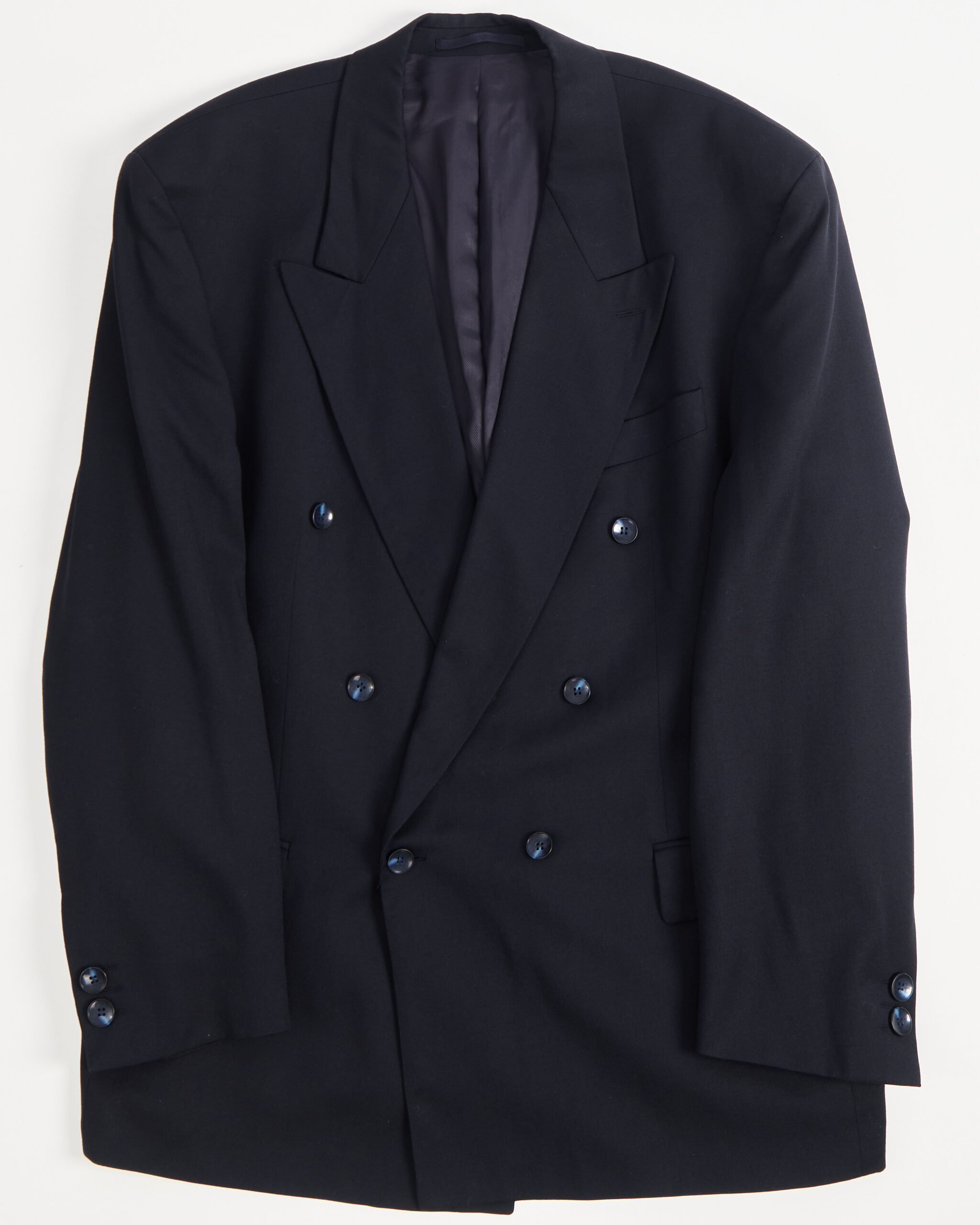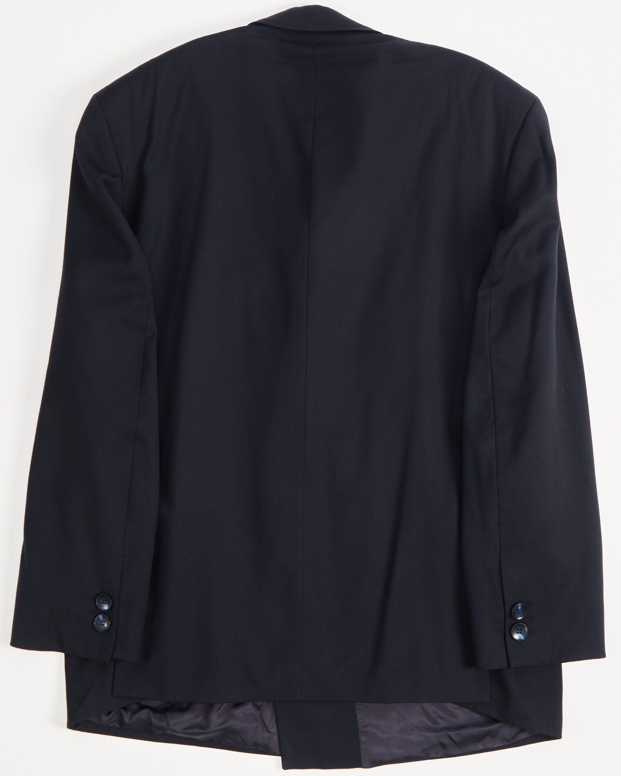 Пиджак выполнен из плотной костюмной шерсти глубокого темно-синего оттенка. Широкая линия плеч и удлиненный силуэт. Материал мягкий и гладкий.