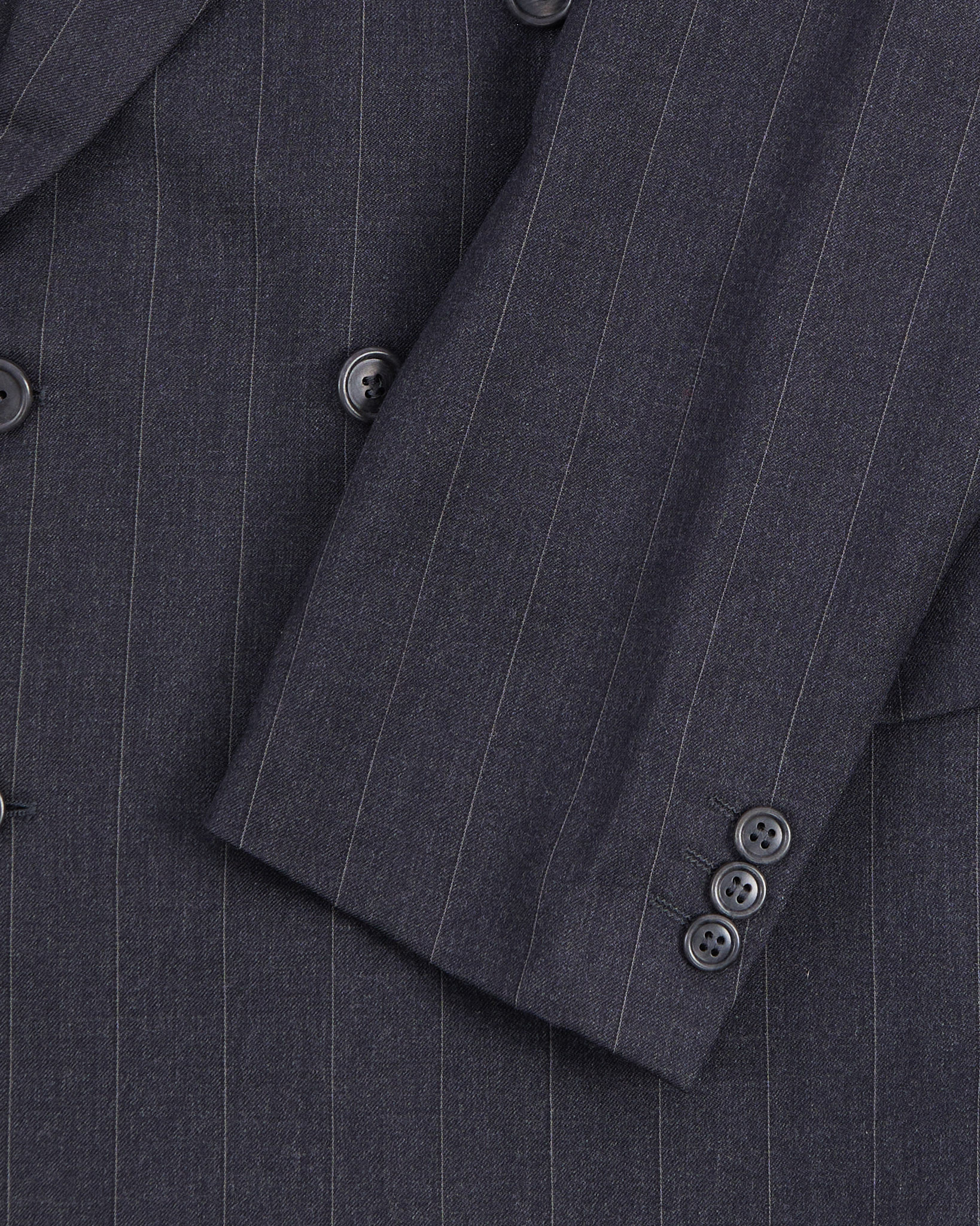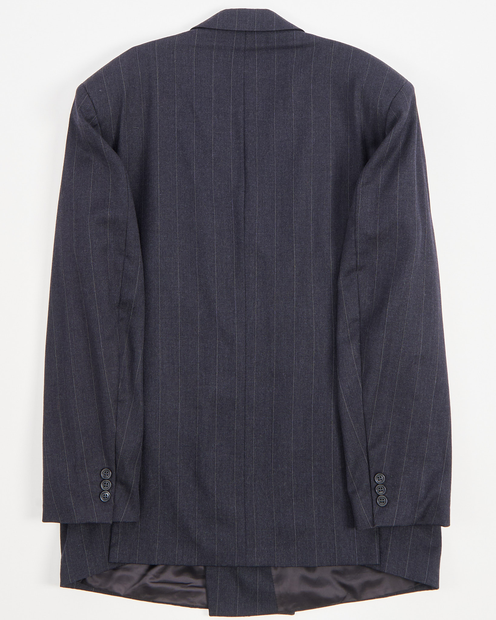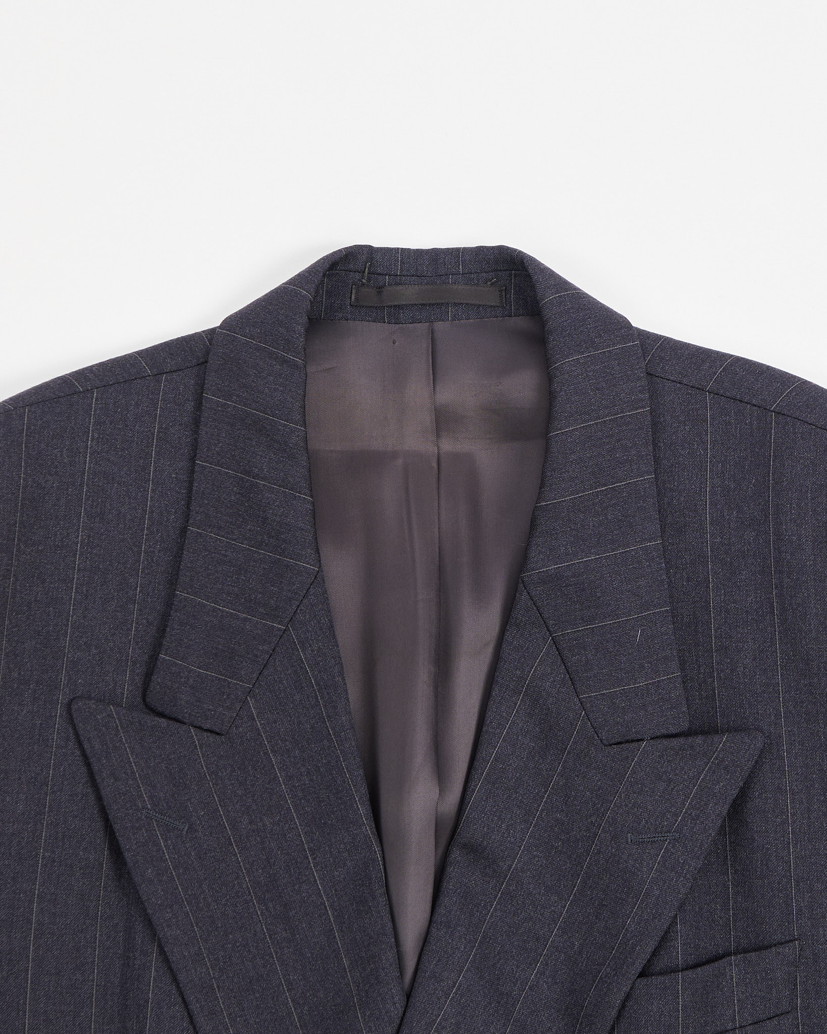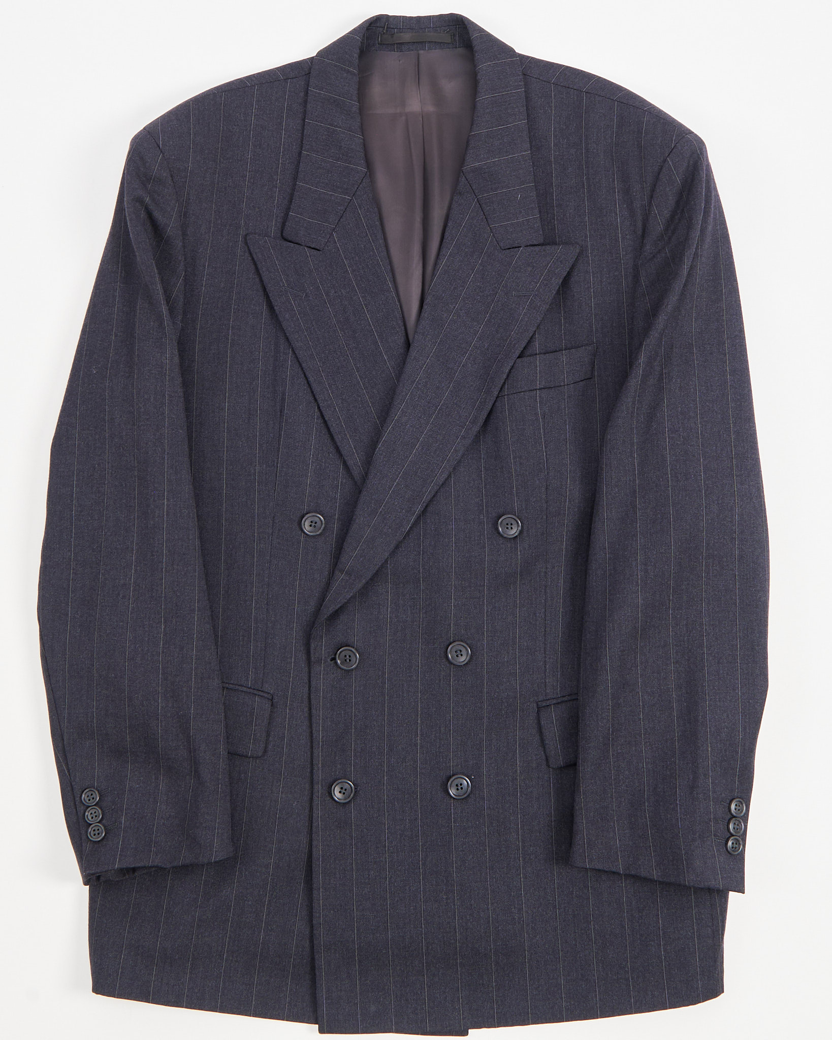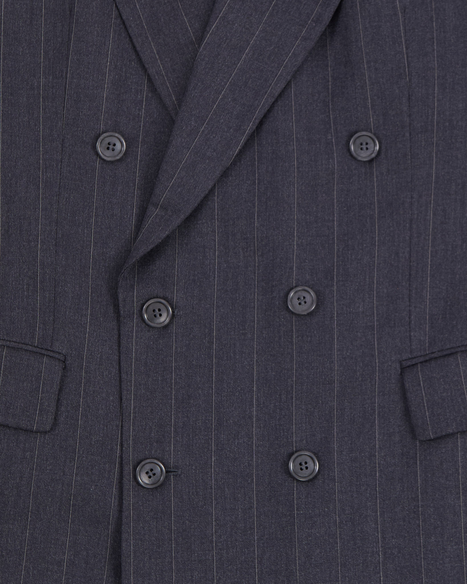 Двубортный пиджак в тонкую полоску. Пиджак от выполнен из 100% шерсти, отмечен знаком woolmark. Посадка прямая, с чёткой линией плеч. Двубортная конструкция и классические лацканы.