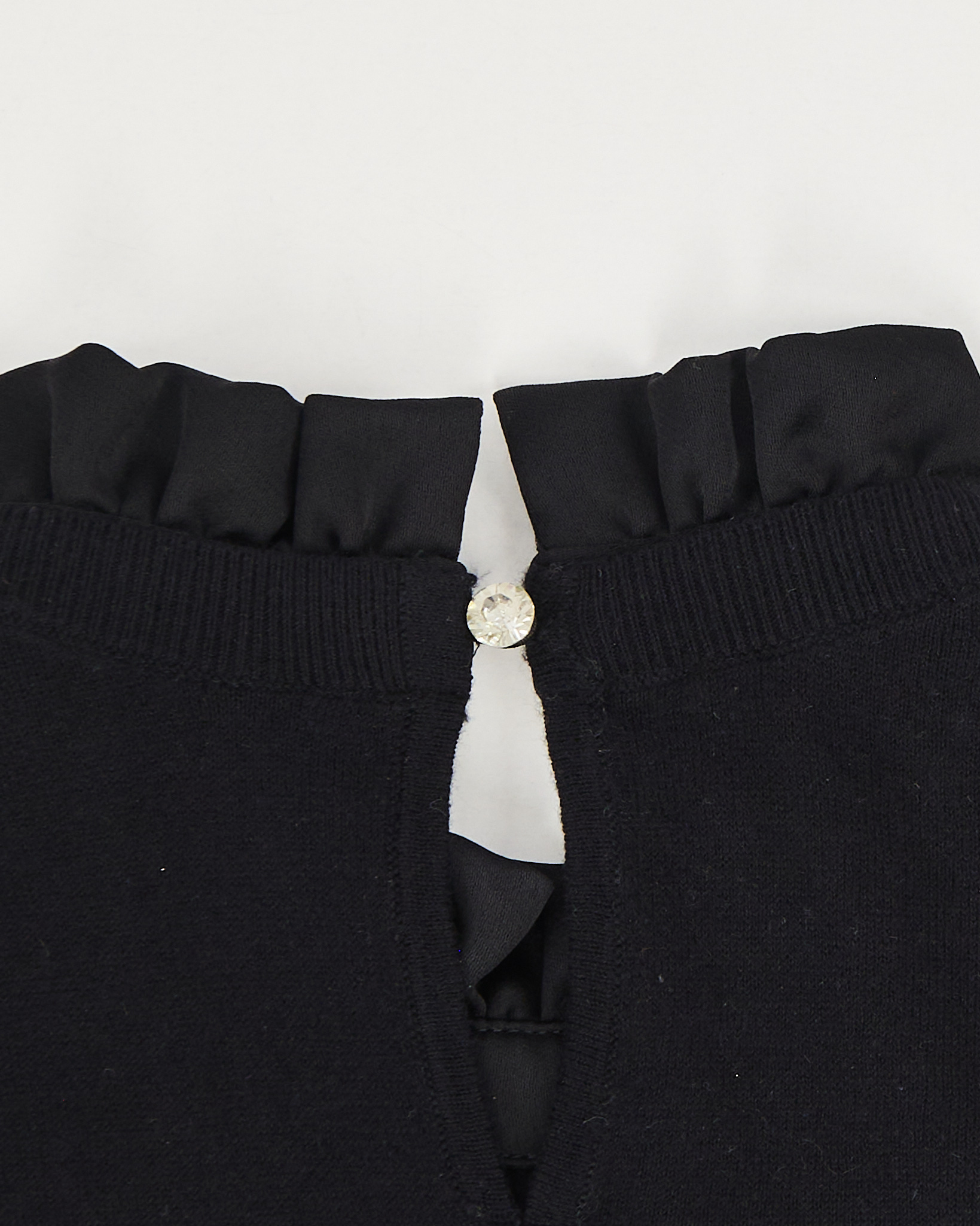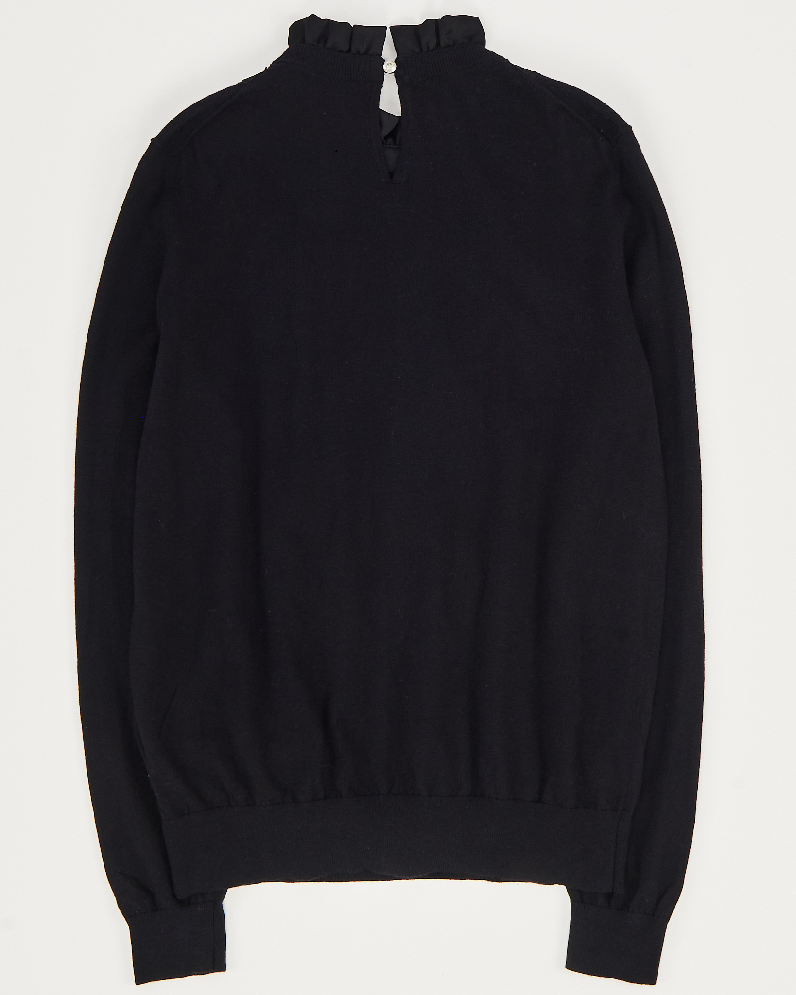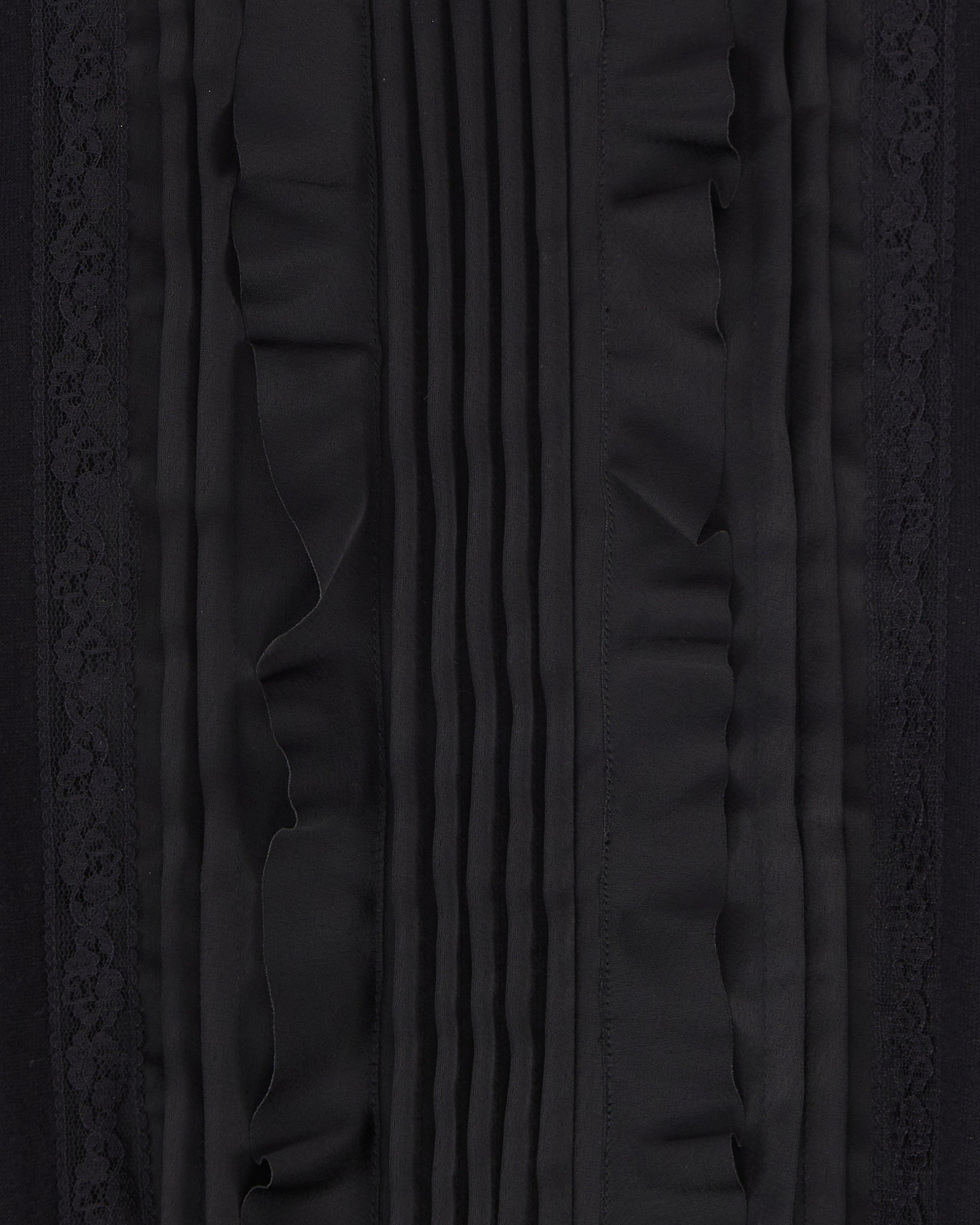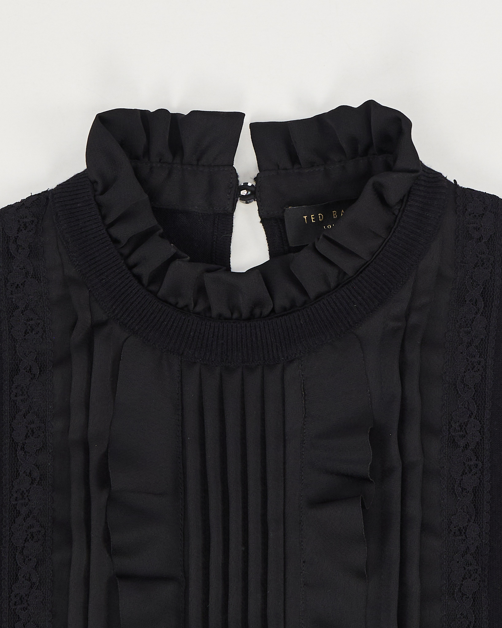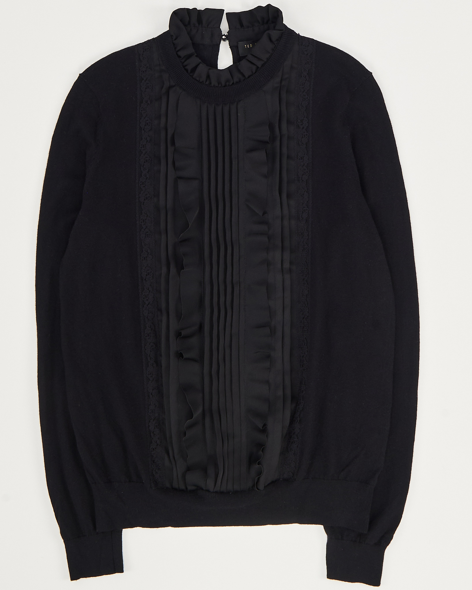Джемпер Ted Baker глубокого чёрного цвета с декоративной вставкой на груди. Трикотаж мягкий и гладкий на ощупь, материал тянется и сохраняет форму. Посадка свободная и аккуратная, в центре вставка из кружева и шелка. Акцентная оборка у горловины.