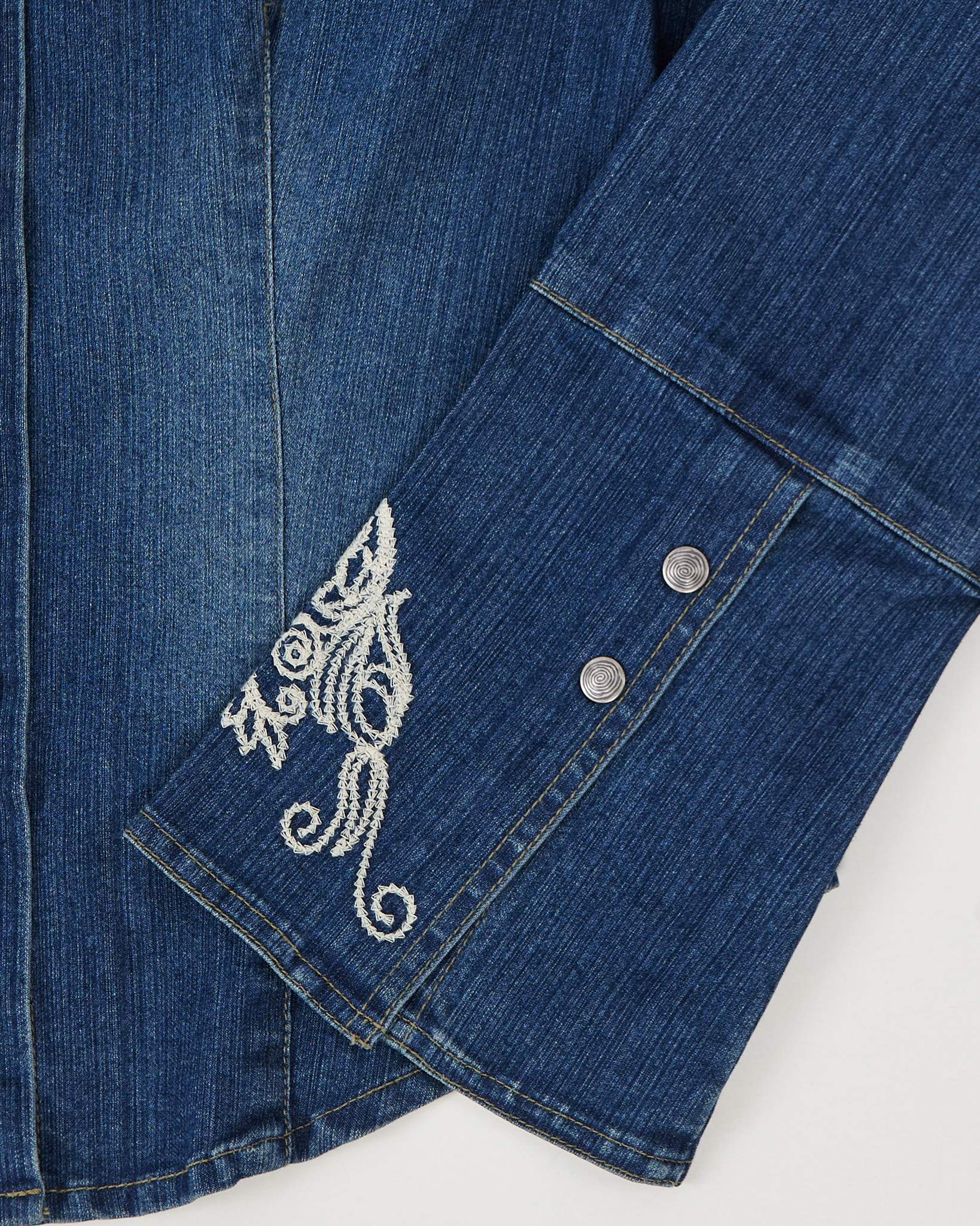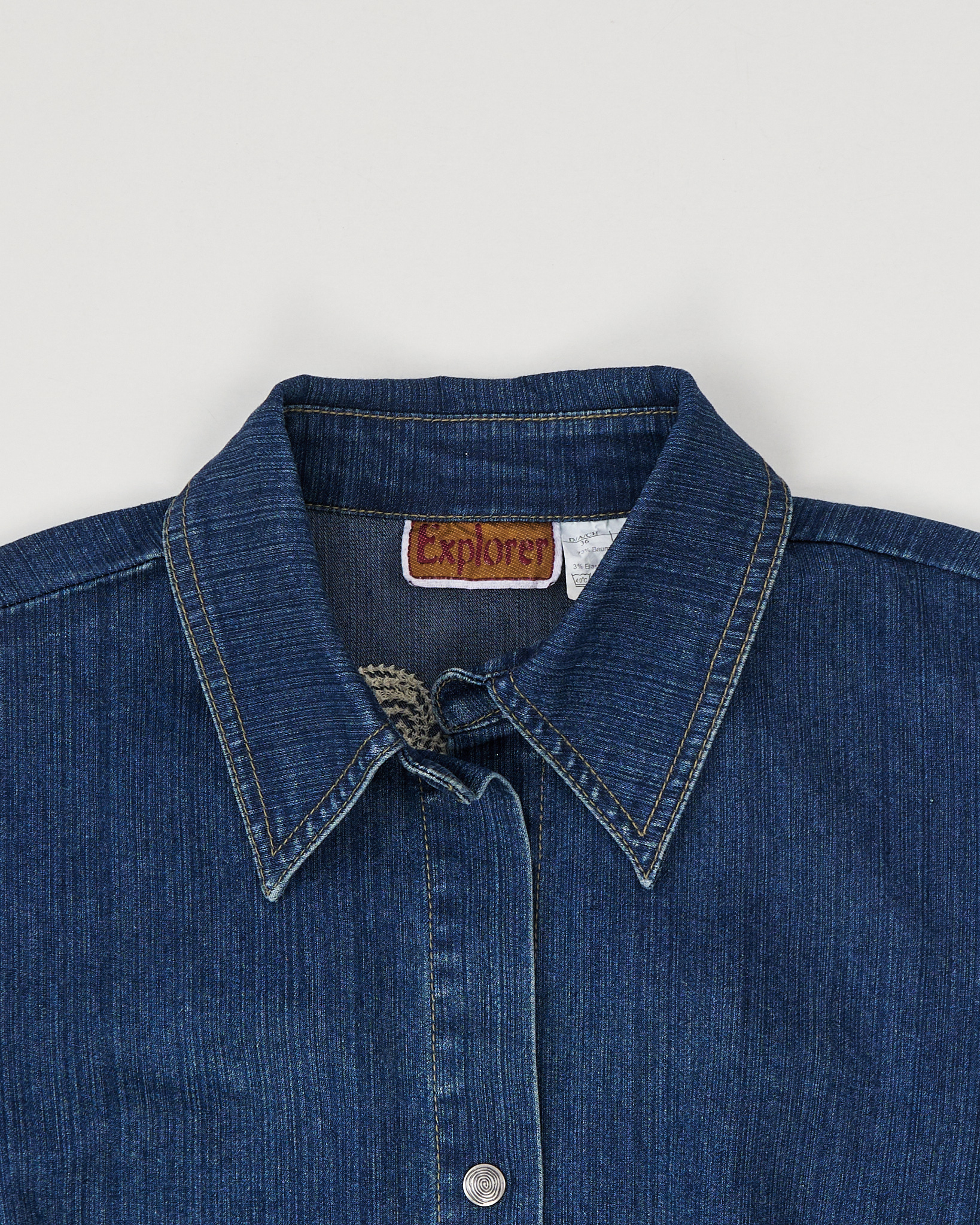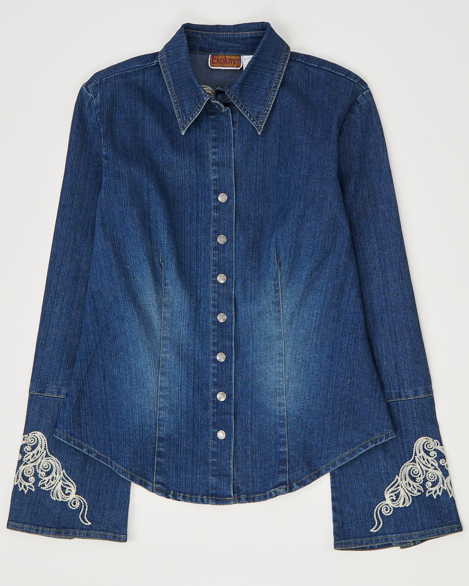 Джинсовая рубашка Explorer с вышивкой. Плотный деним, посадка прямая. Контрастная вышивка на спине и рукавах, металлические кнопки и выверенные швы.