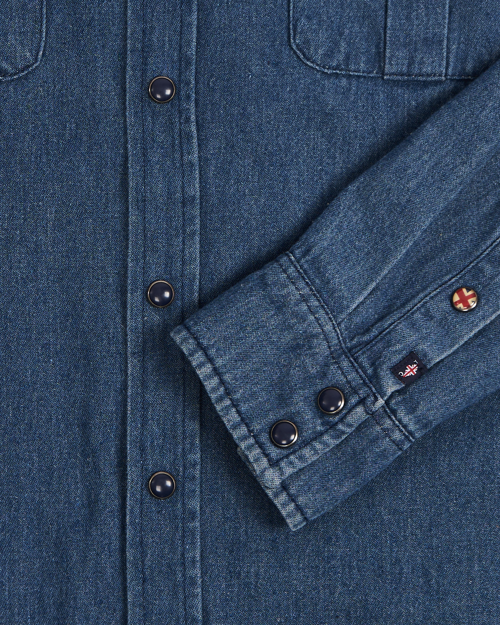 Плотная хлопковая деним-ткань хорошо держит форму. Прямая посадка Regular Fit. Два нагрудных кармана и кнопки в тон. Детали с британской символикой.