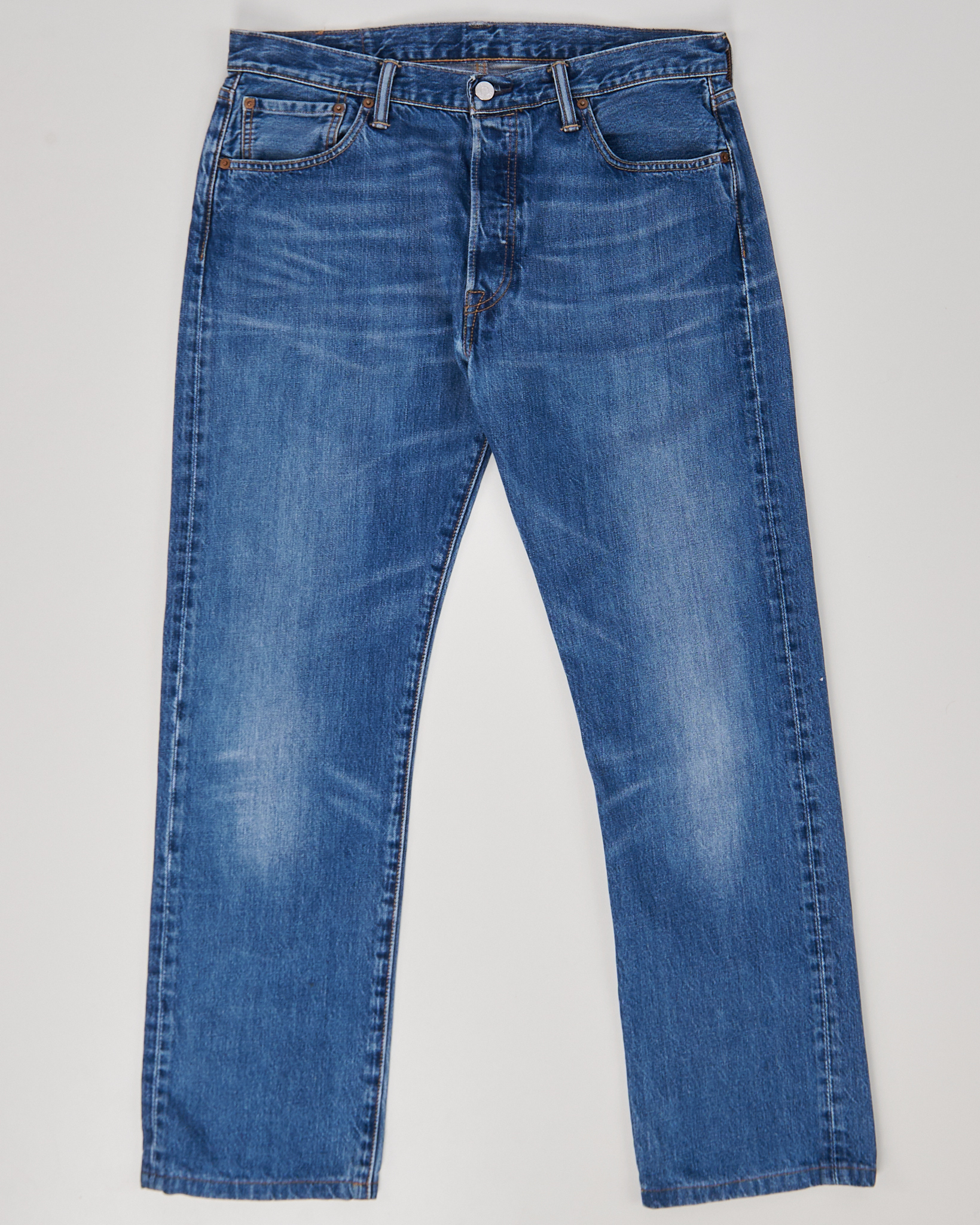 Джинсы Levi’s 501 из плотного хлопкового денима насыщенного синего оттенка. Посадка прямая, лёгкий винтажный дистресс придает акцент. Классическая модель с пятью карманами и фирменной фурнитурой Levi’s.