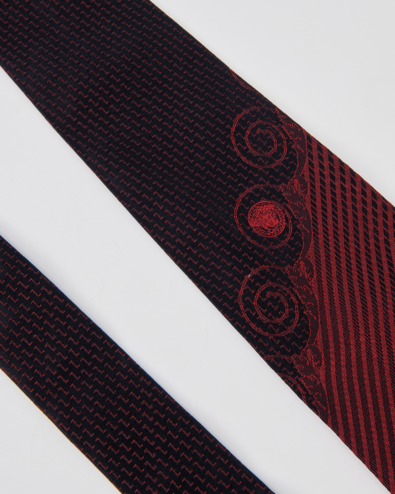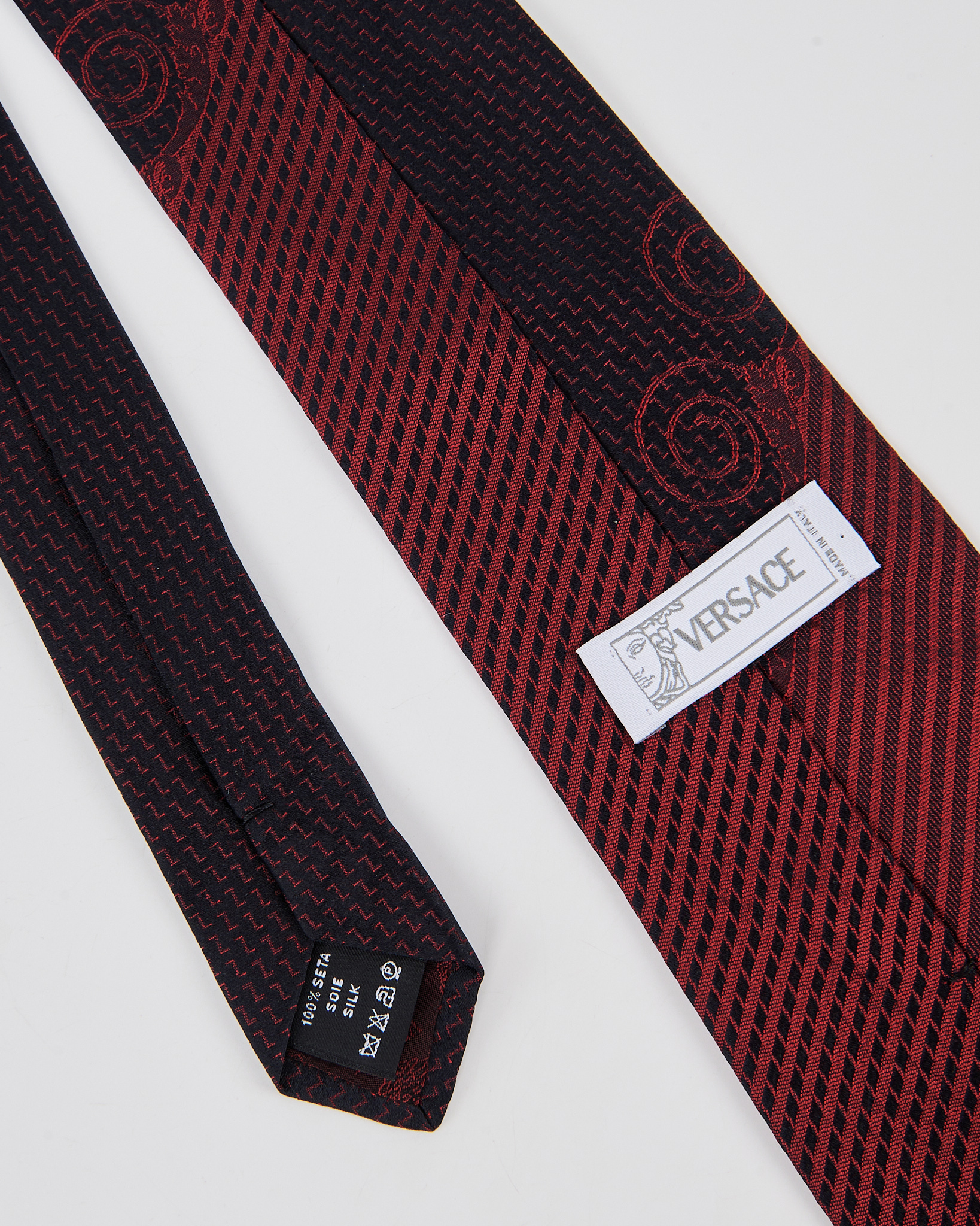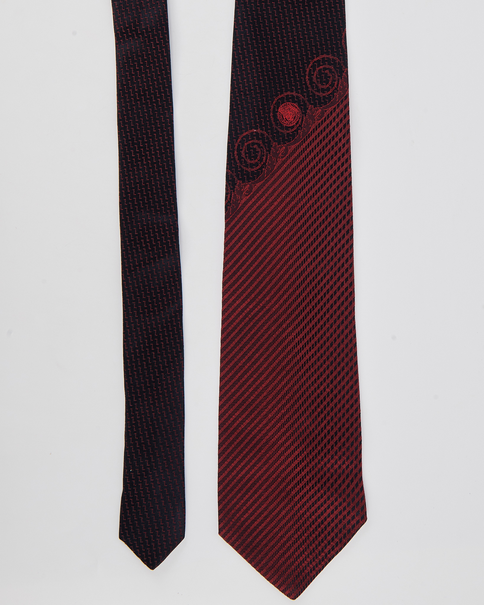 Галстук из 100% шелка с диагональным рисунком и плавным переходом оттенков от алого к глубокому бордовому. Абстрактный узор с кругами, сочетание насыщенного цвета и редкого дизайнерского рисунка