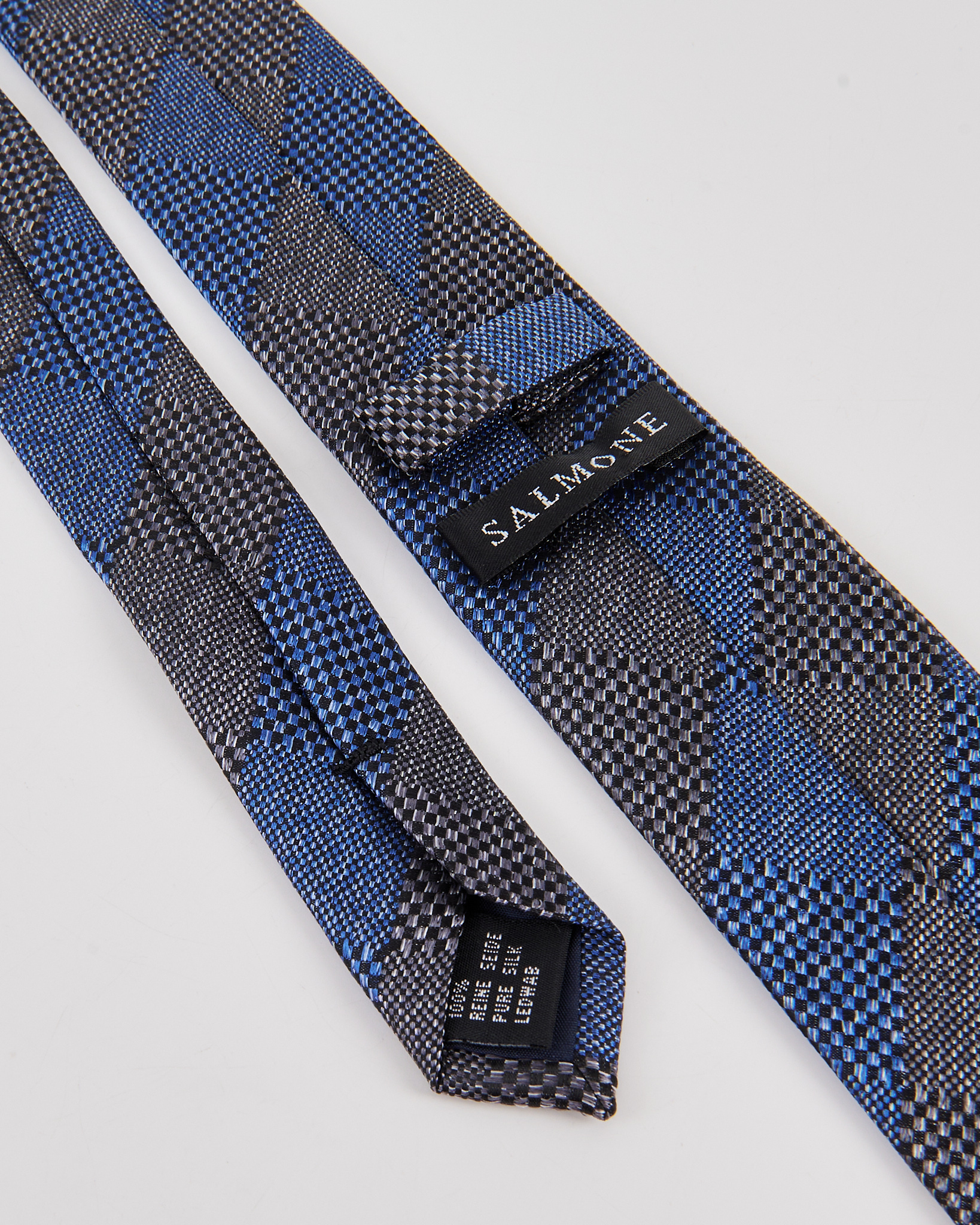 Этот элегантный галстук от SALMONE, изготовленный из 100% натурального шелка. Ткань обладает роскошным блеском и мягкой текстурой, а классический клетчатый узор в серо-синих тонах делает аксессуар универсальным для делового и торжественного образа