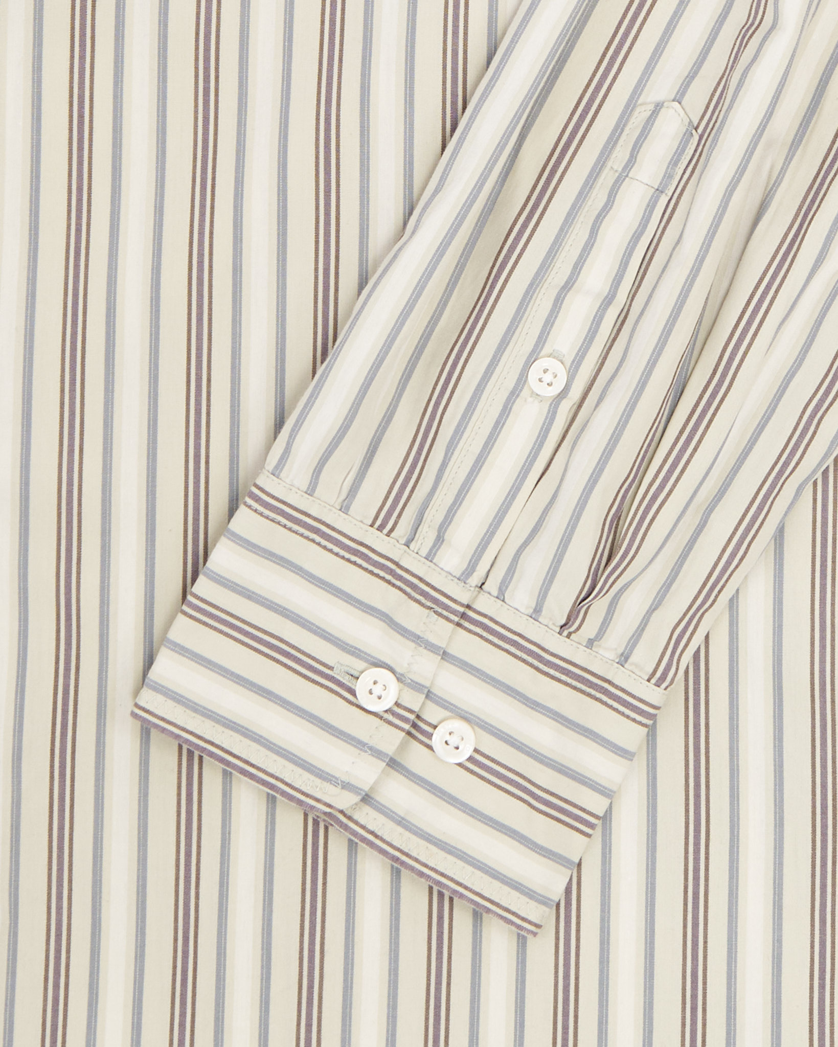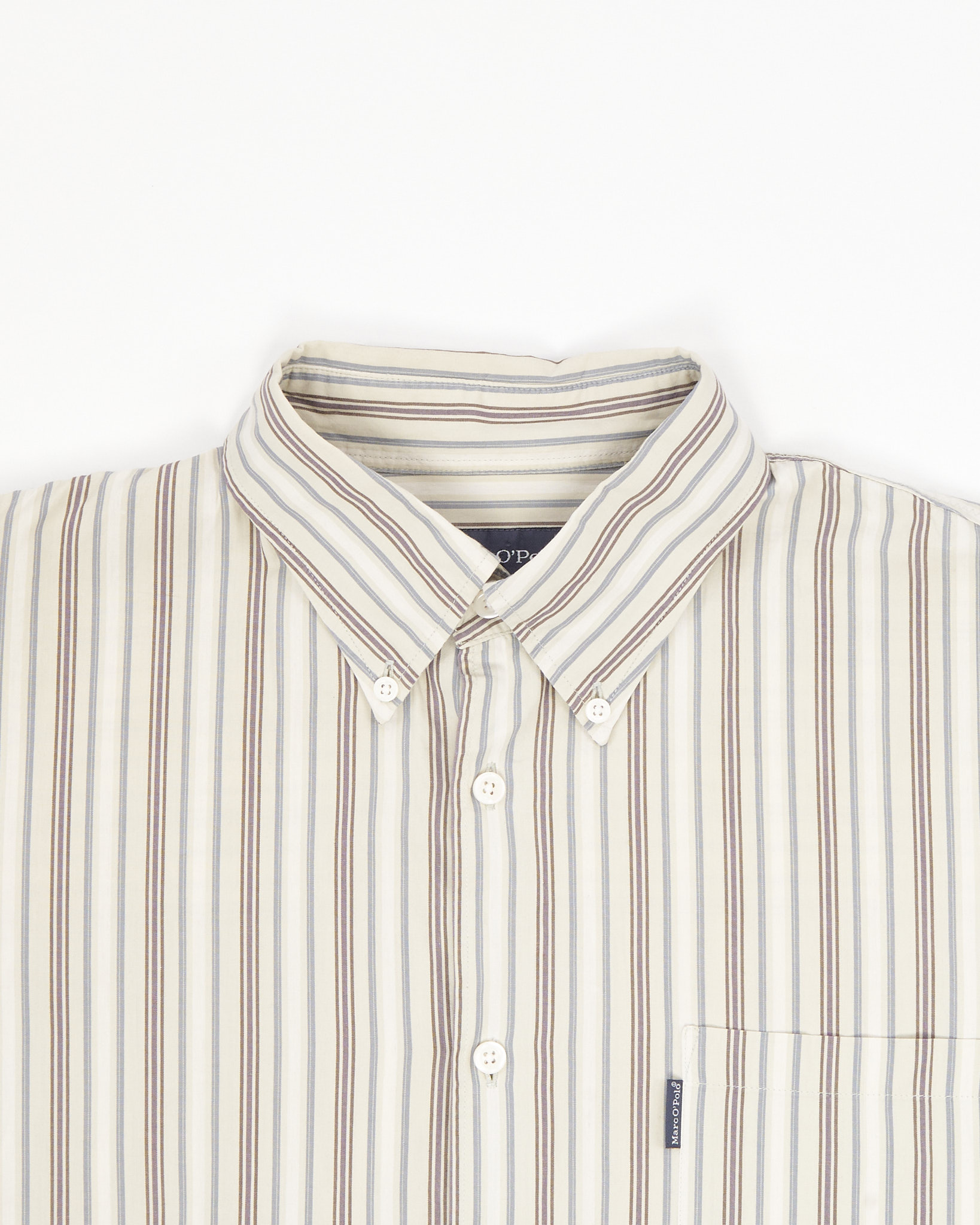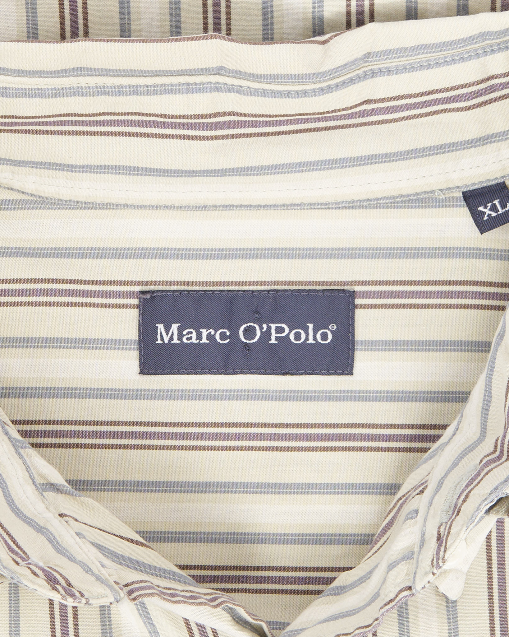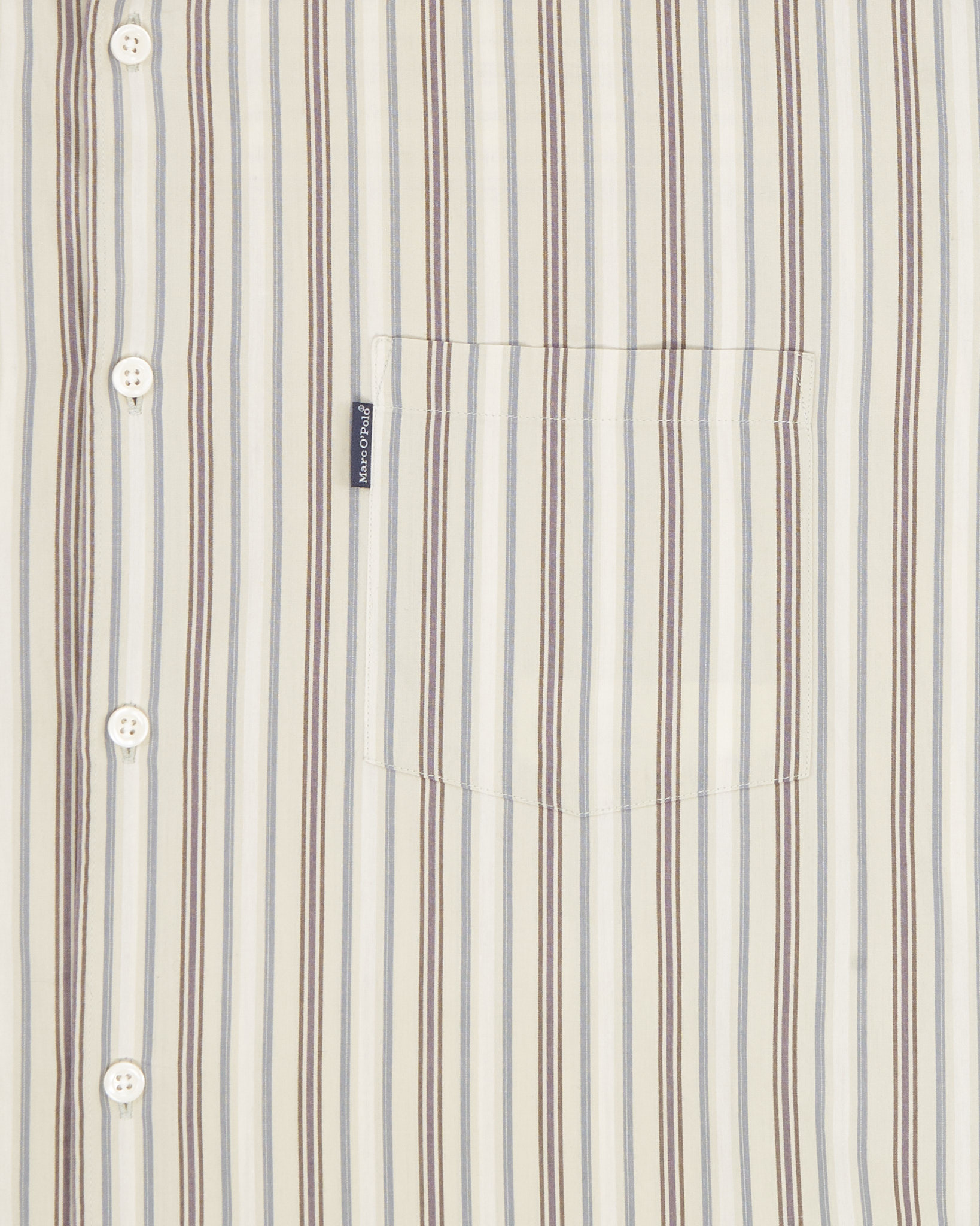 Классическая мужская рубашка от бренда Marc O'Polo выполнена из 100% натурального хлопка. Вертикальны1 принт в полоску в спокойных оттенках оливкового, серого и черного. Классический отложной воротник с застежкой на пуговицы.