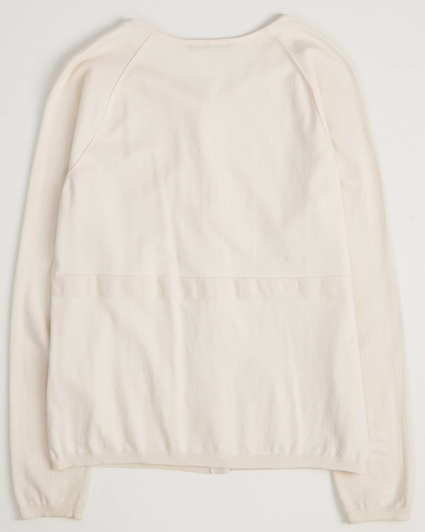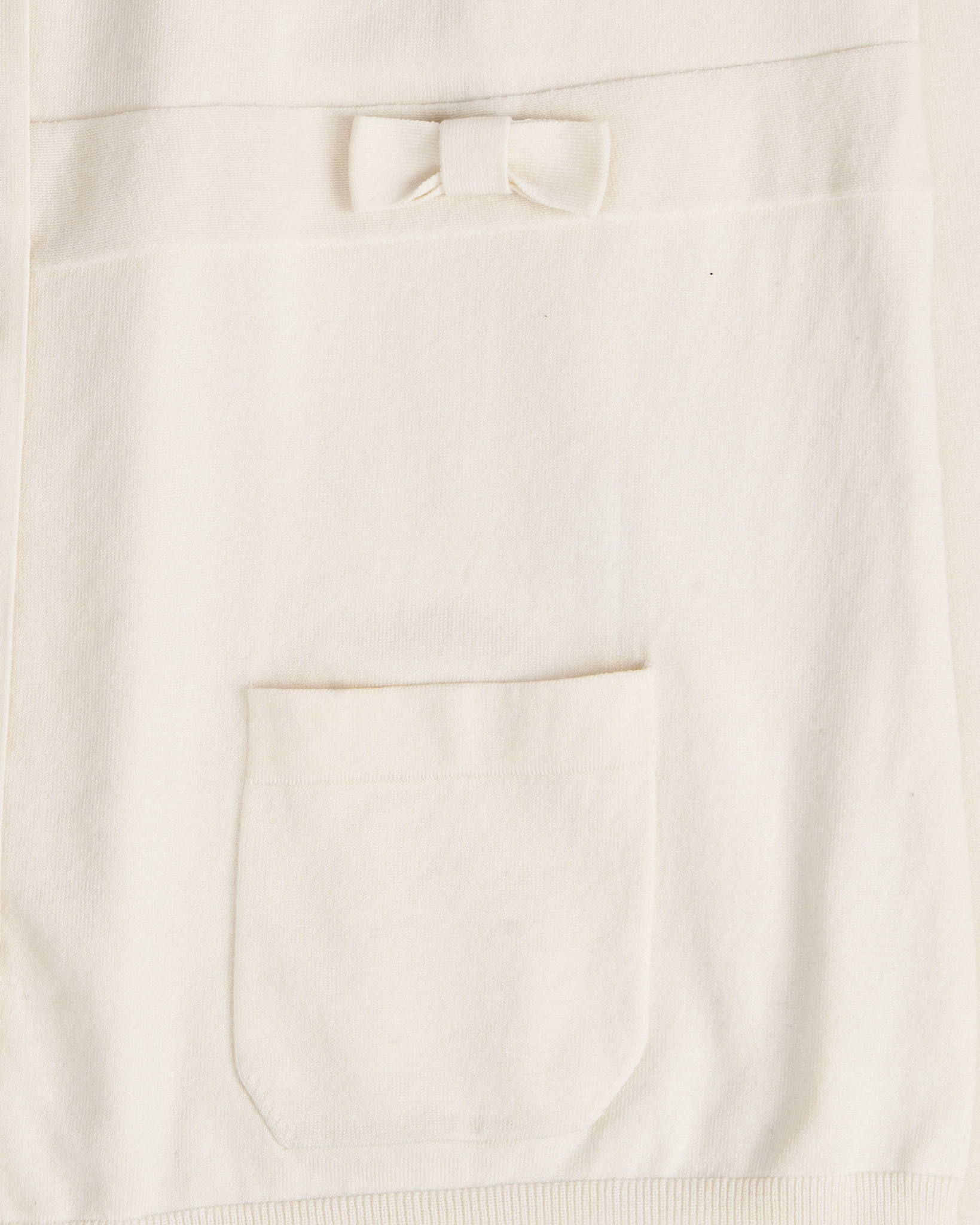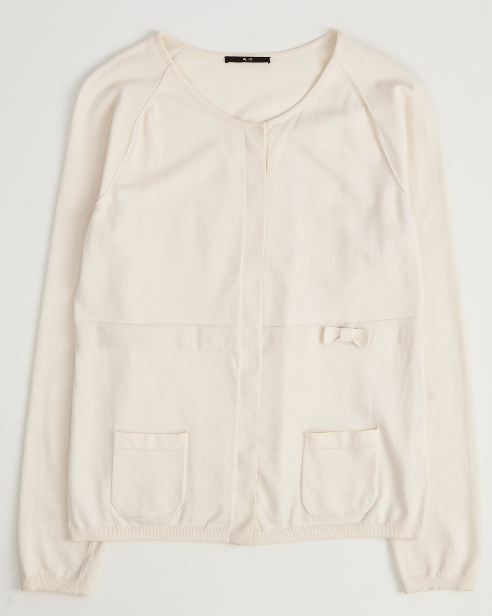 Кардиган из мягкого трикотажа молочного оттенка от BOSS, материал приятный к телу. Посадка свободная, рукав с аккуратной резинкой. Центральная скрытая планка, небольшой бант на груди добавляет акцент.