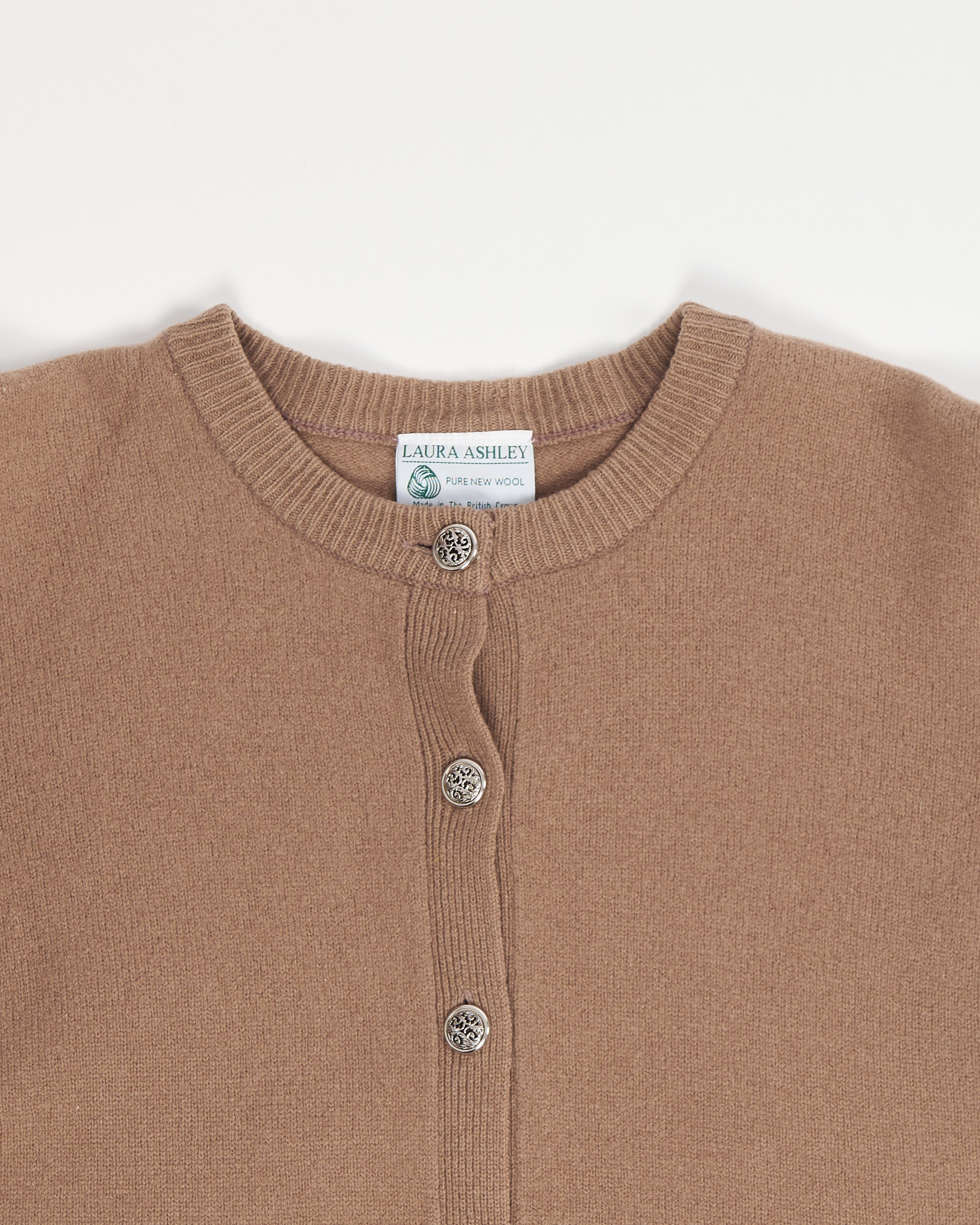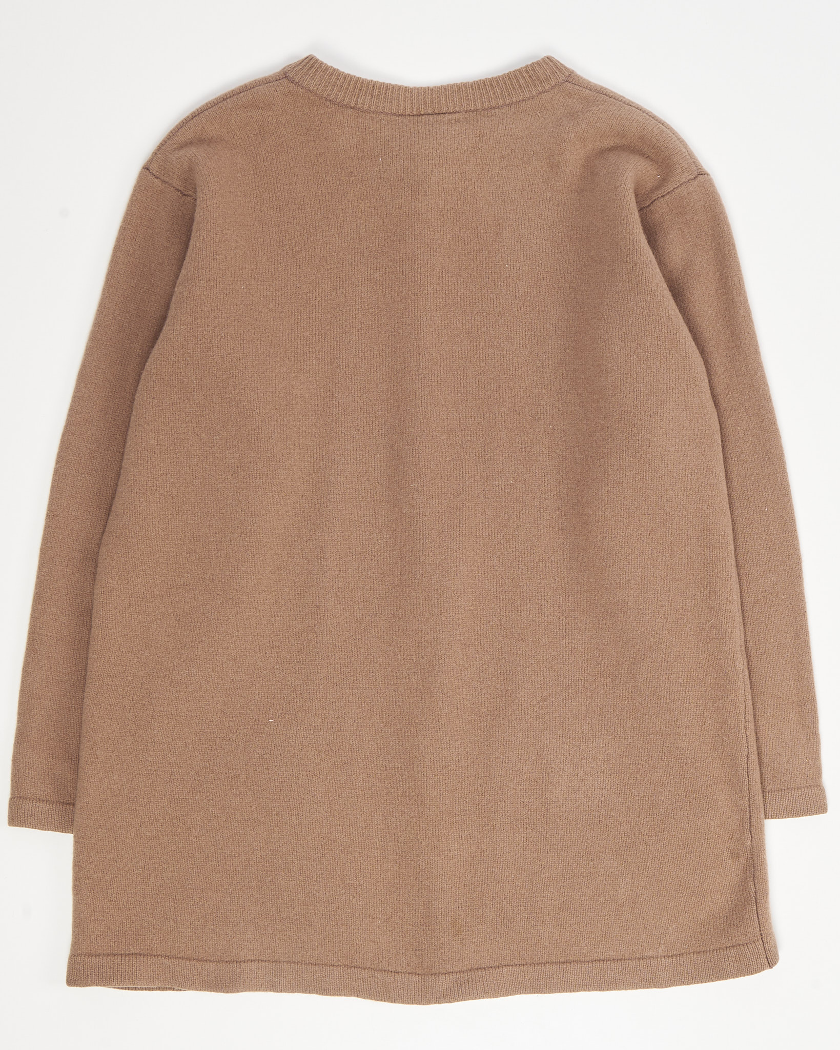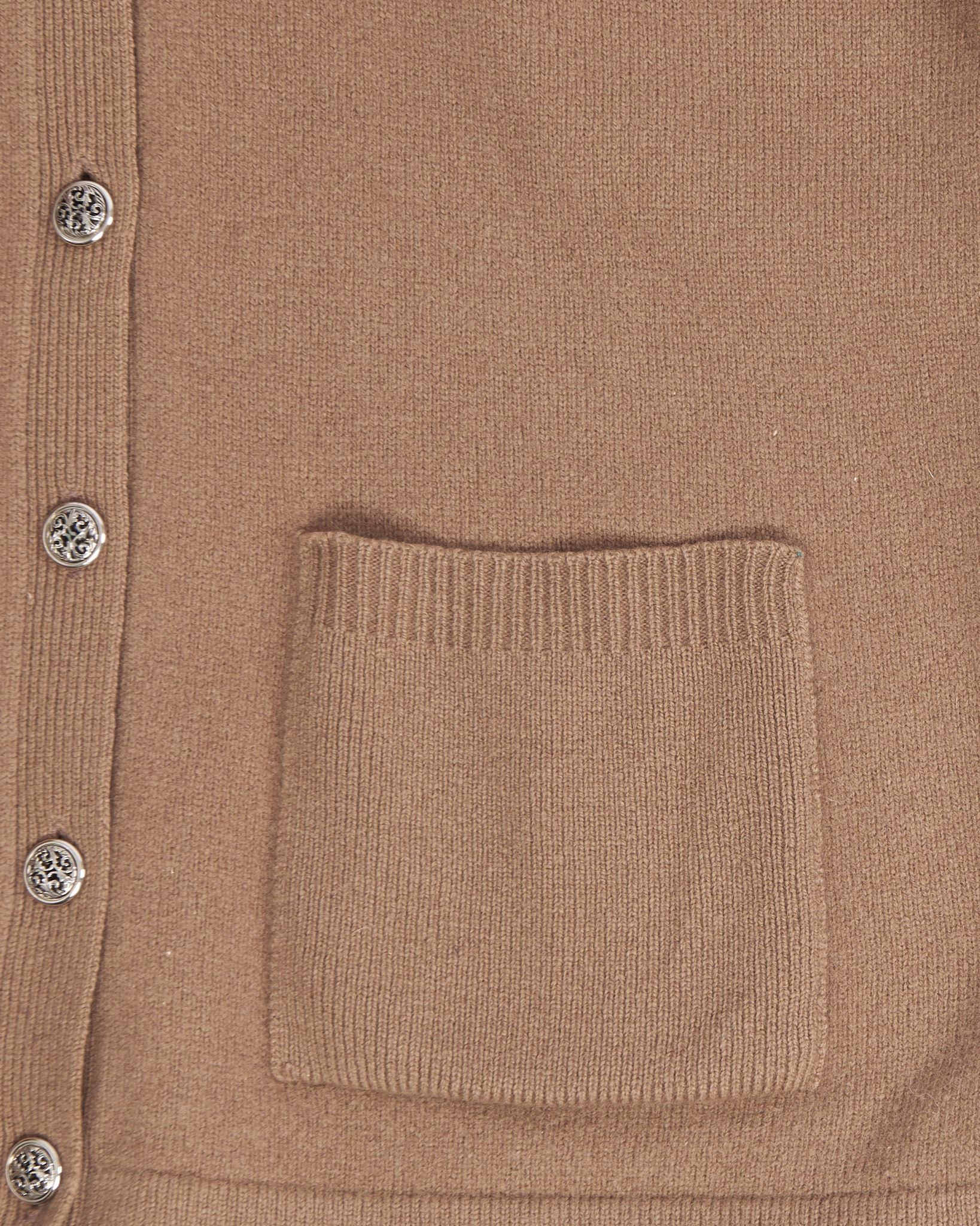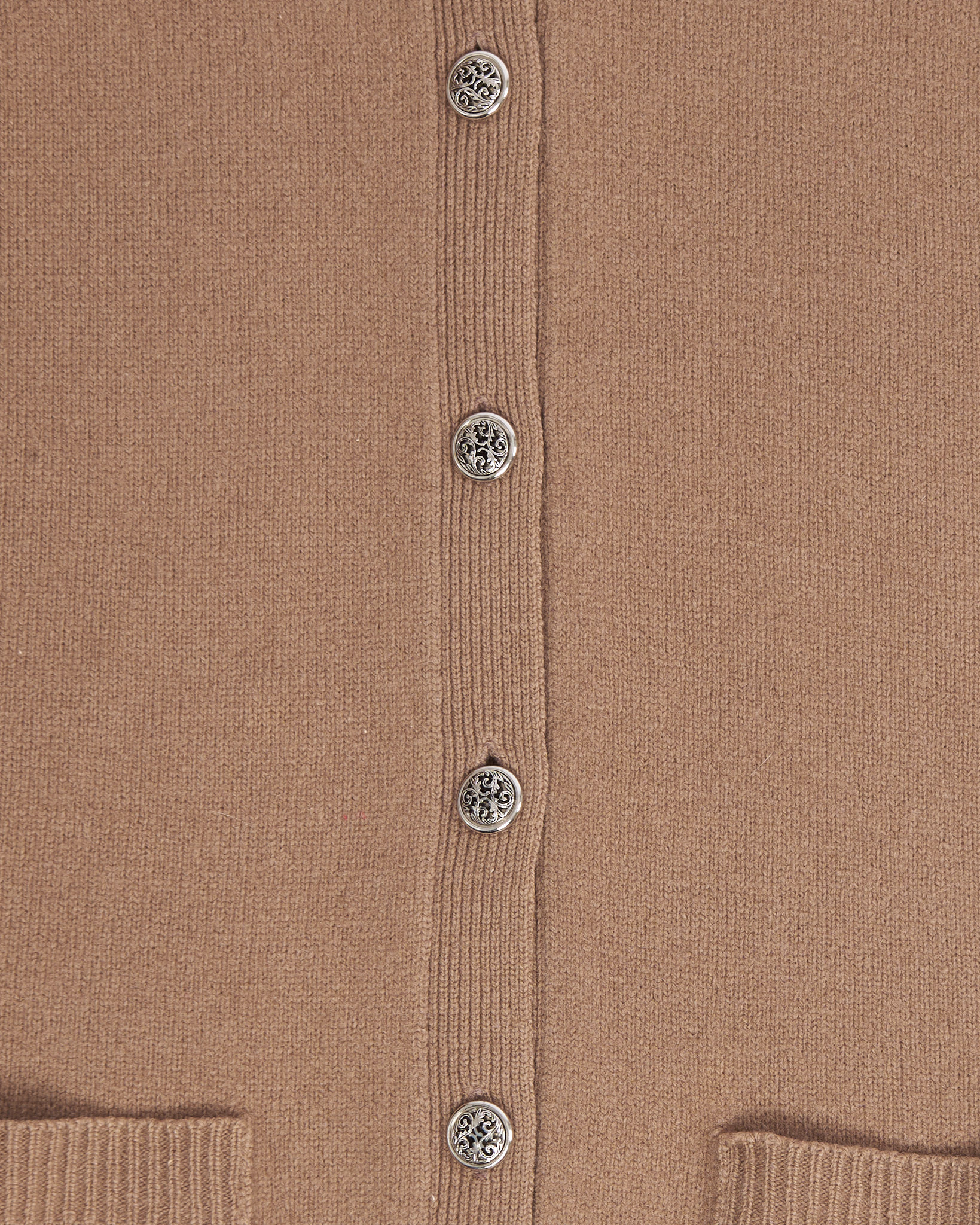 Кардиган из мягкой натуральной шерсти. Прямая посадка, создаёт аккуратный силуэт без излишнего объёма. Декоративные металлические пуговицы и накладные карманы придают акцент. Тёплый бежевый оттенок подчёркивает естественную фактуру материала.
