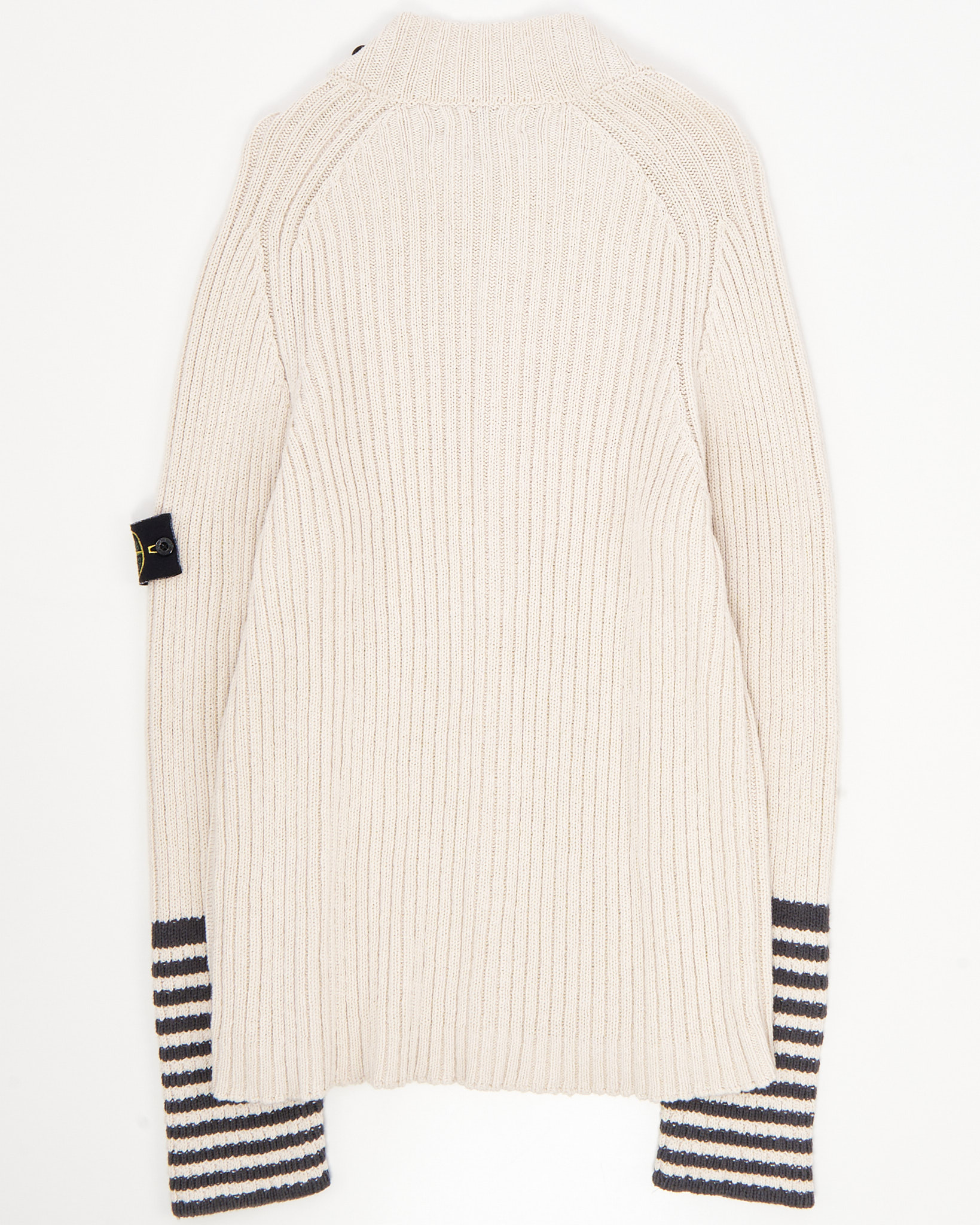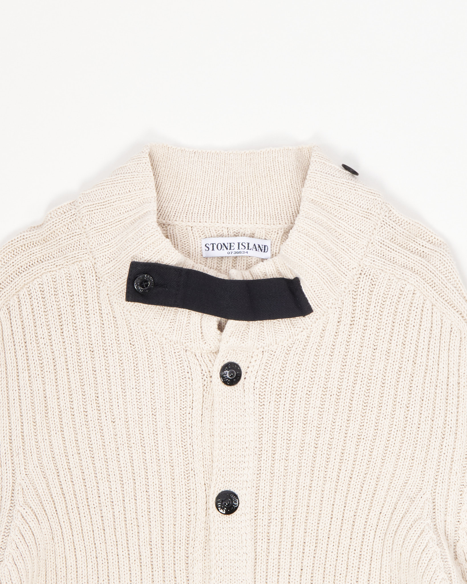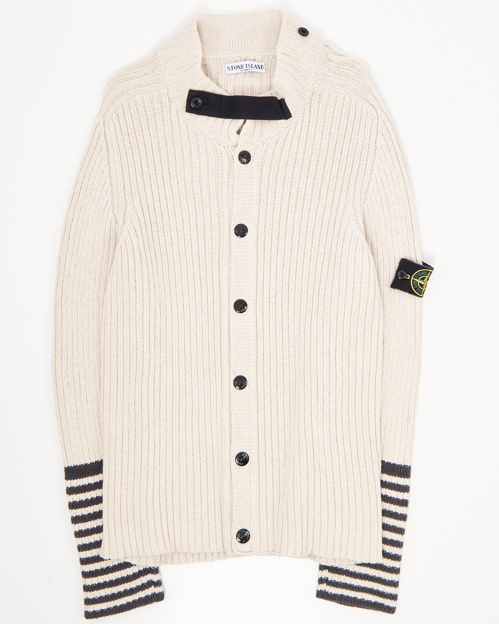 Бежевый хлопковый кардиган с черными пуговицами и воротником-стойкой. Контрастные черные полоски на рукавах. Фирменный патч Stone Island на рукаве. Сделан в Италии