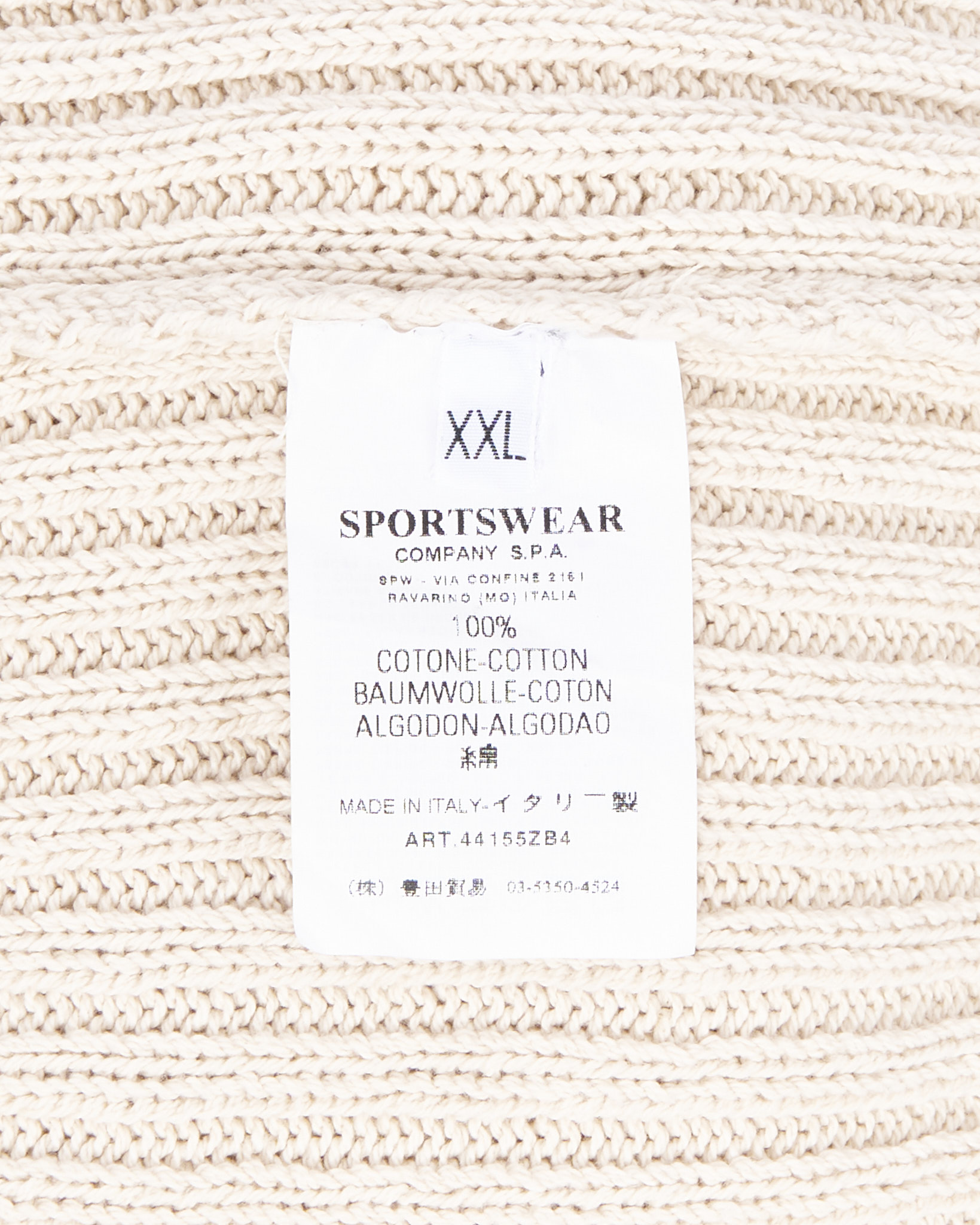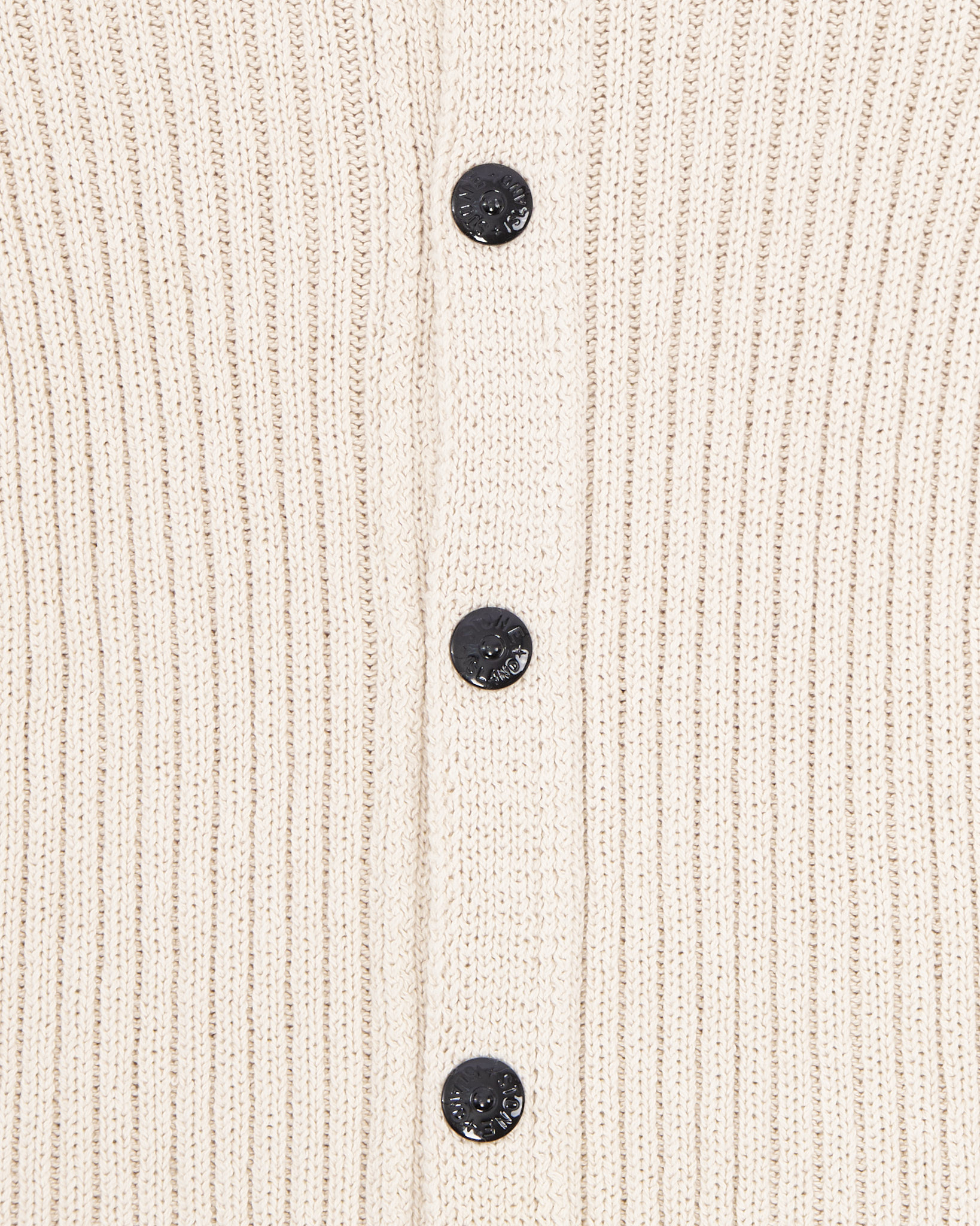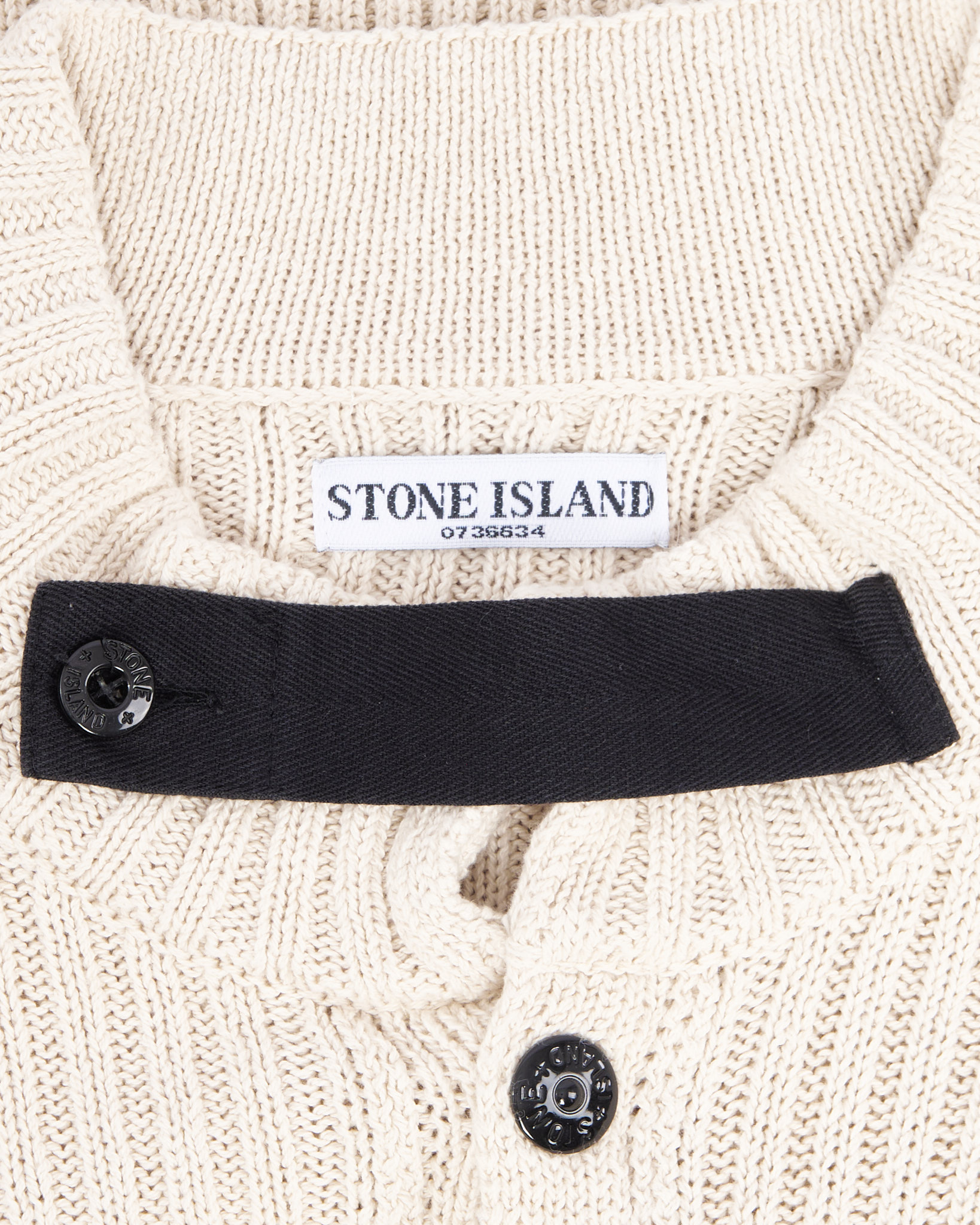 Бежевый хлопковый кардиган с черными пуговицами и воротником-стойкой. Контрастные черные полоски на рукавах. Фирменный патч Stone Island на рукаве. Сделан в Италии