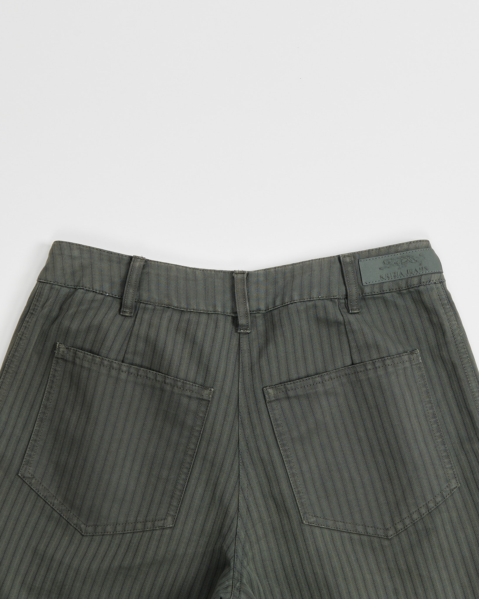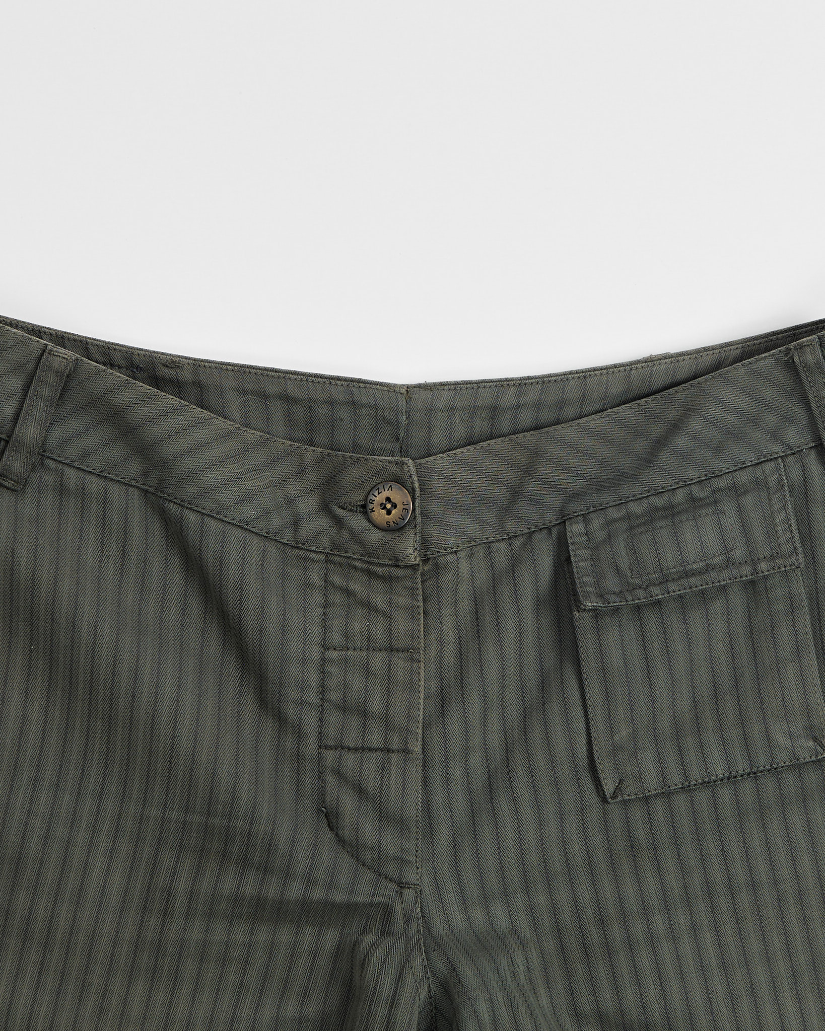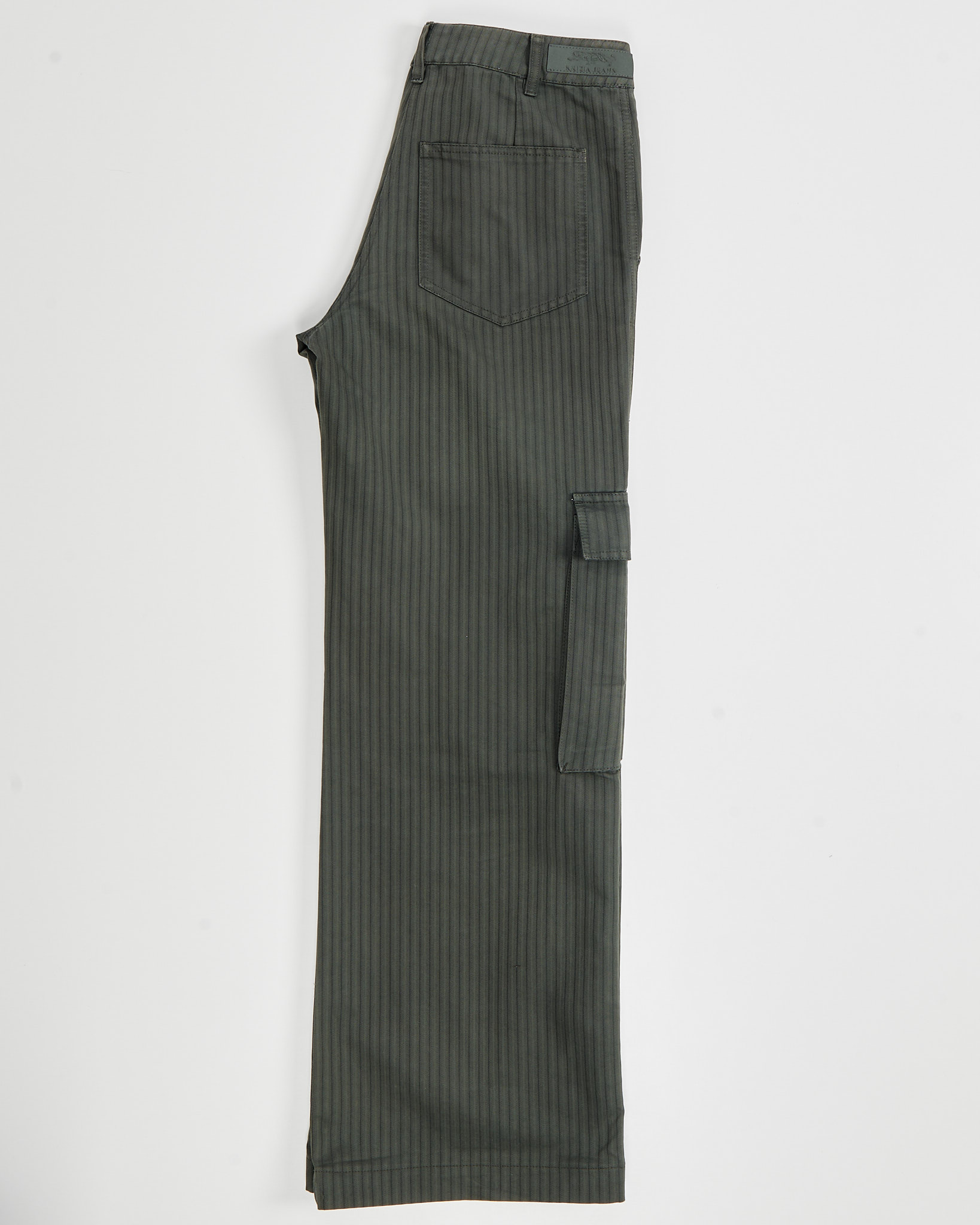 Брюки выполнены из плотного хлопка. Свободного кроя, ткань гладкая на ощупь, с лёгкой фактурой и тонкой полоской. Средняя посадка, есть функциональные карманы
