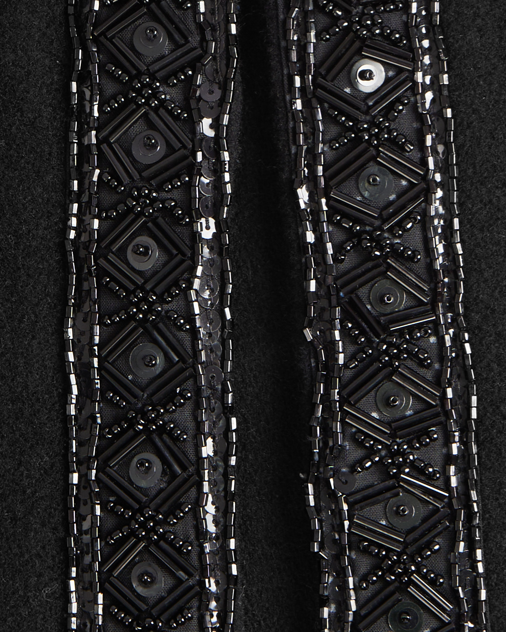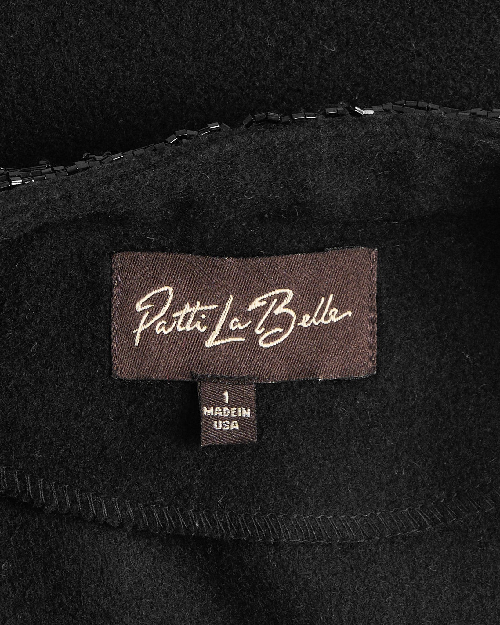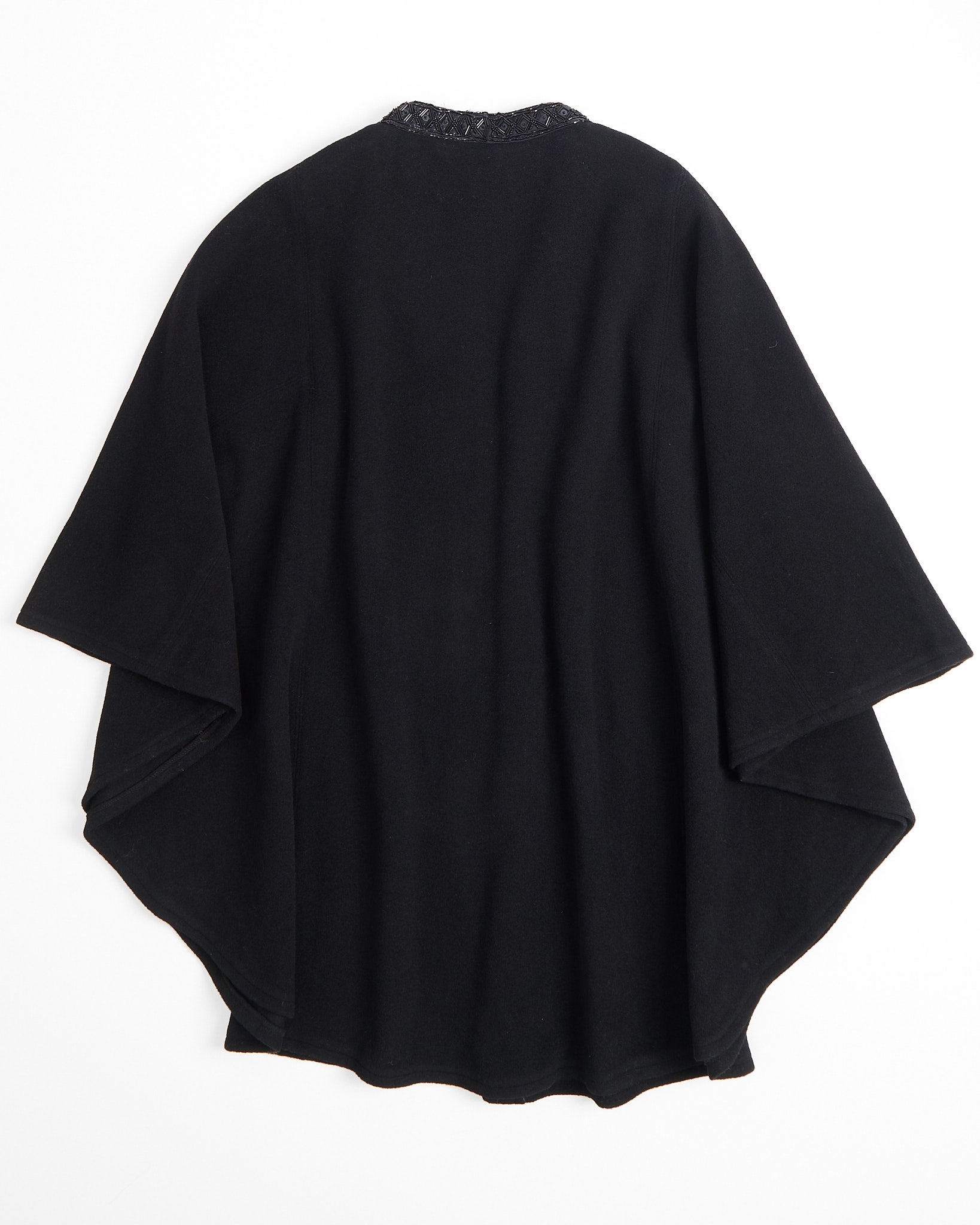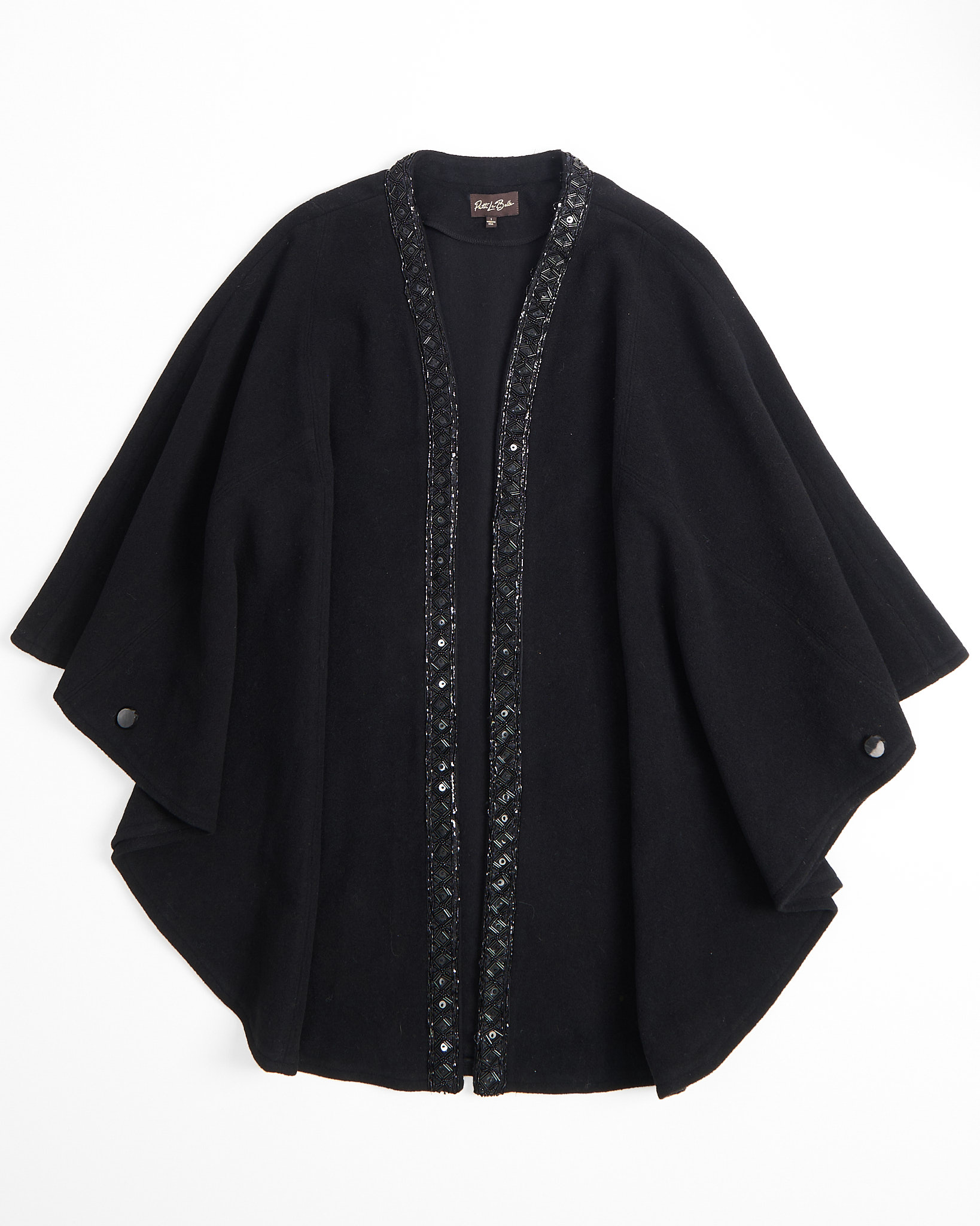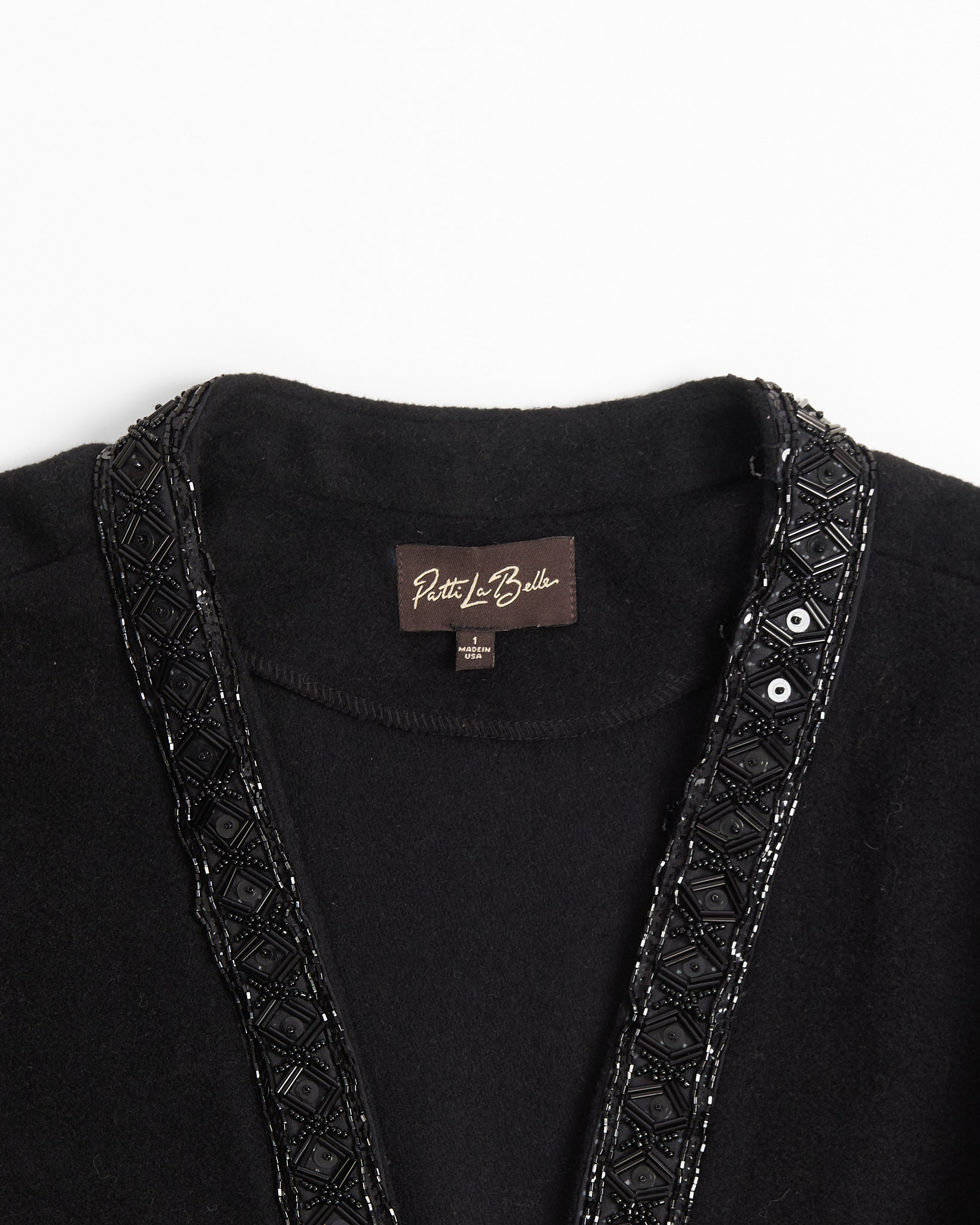 Шерстяной кейп Patti LaBelle с вышивкой. Свободная посадка, удобная застёжка на рукавах. Массивный узор из черного стекляруса и пайеток. Американское производство.