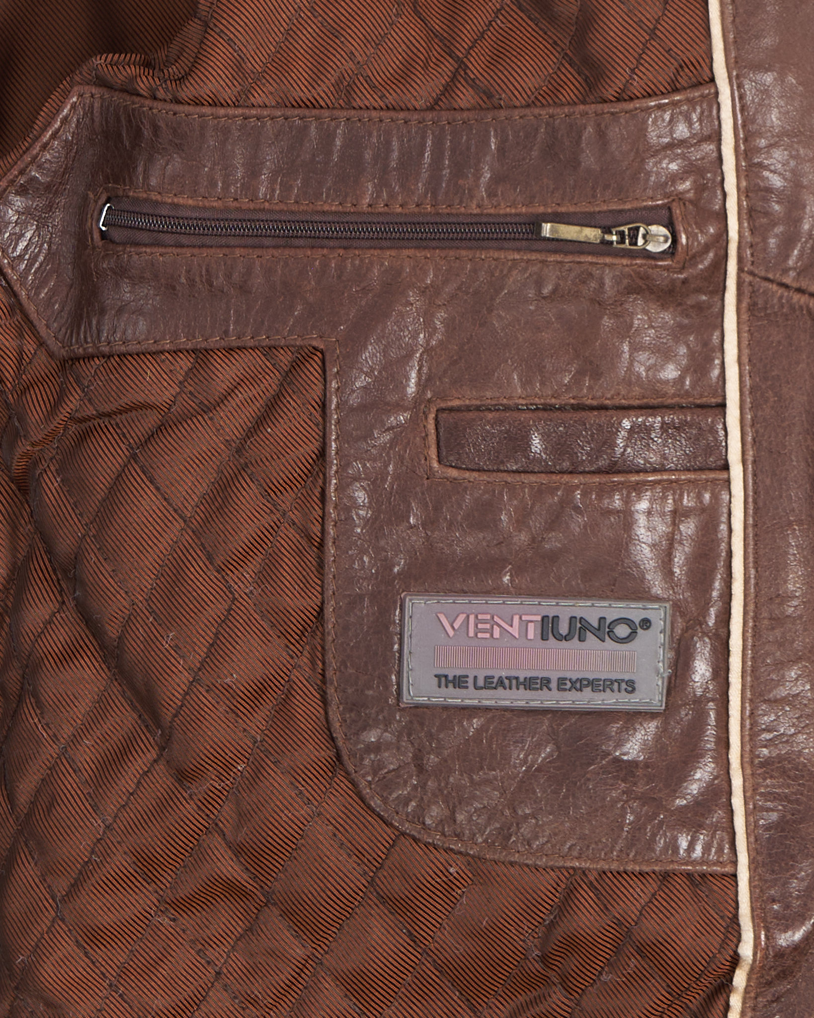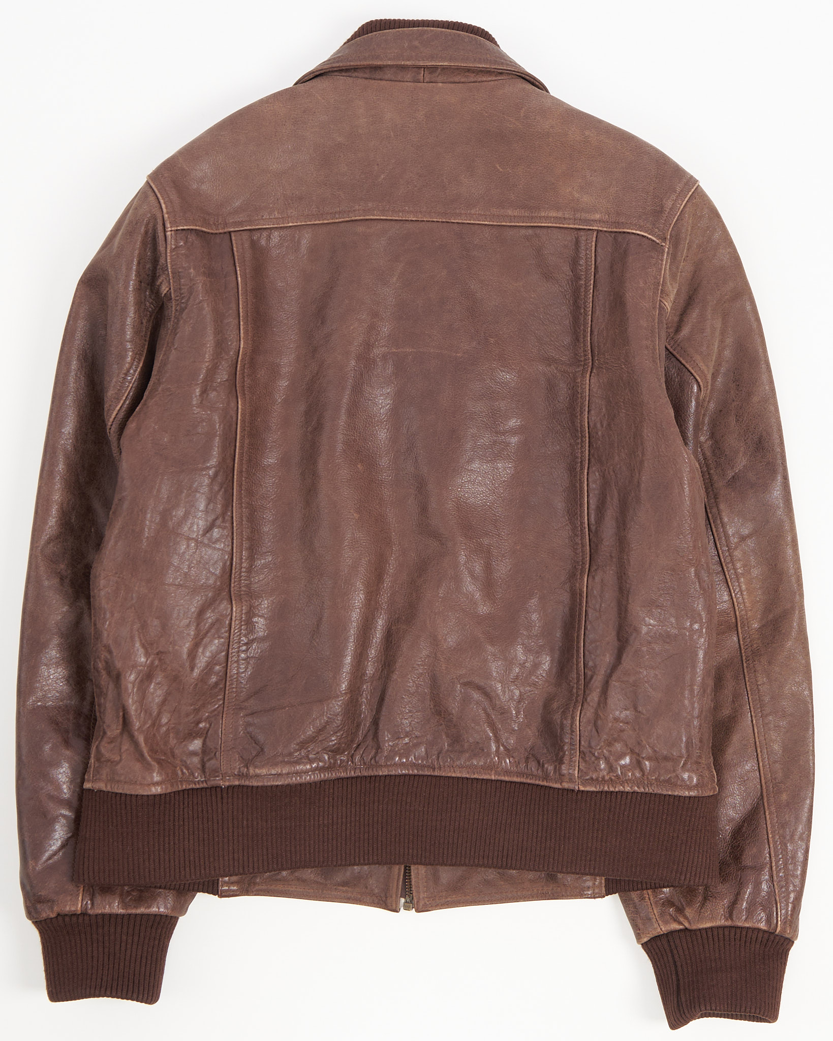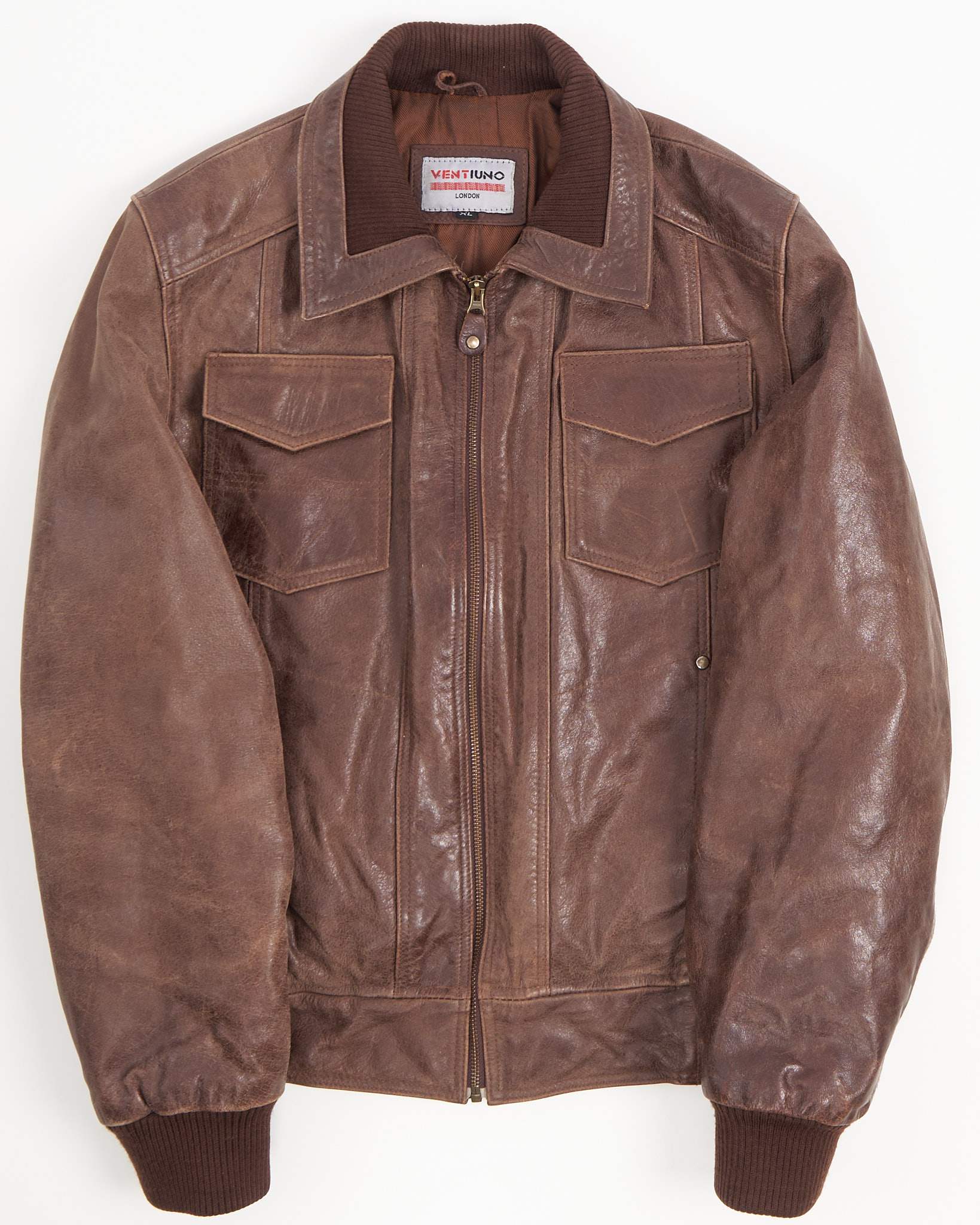 Винтажная куртка- бомбер из кожи Ventiuno London. Широкие трикотажные резинки на поясе и манжетах, двойной воротник и крупные накладные карманы, удобная застёжка на молнию.