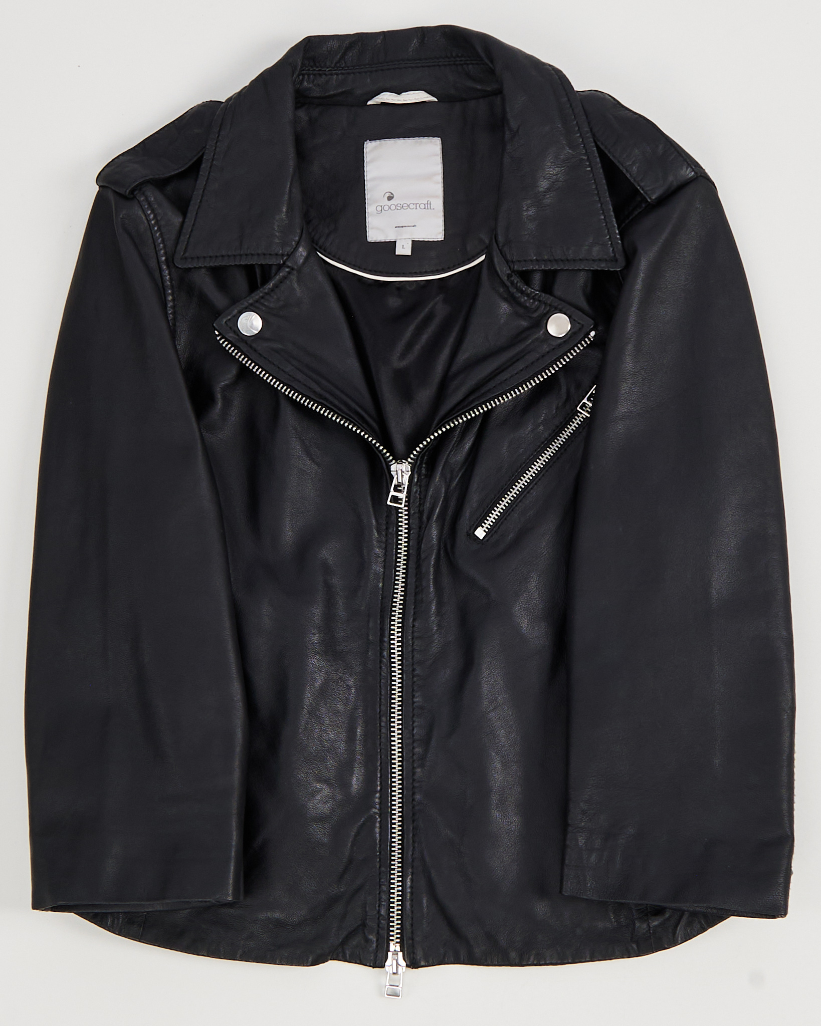 Куртка goosecraft выполнена из натуральной кожи чeрного цвета. Материал мягкий и гладкий на ощупь. Посадка свободная, укороченная длина. Косая молния и металлическая фурнитура