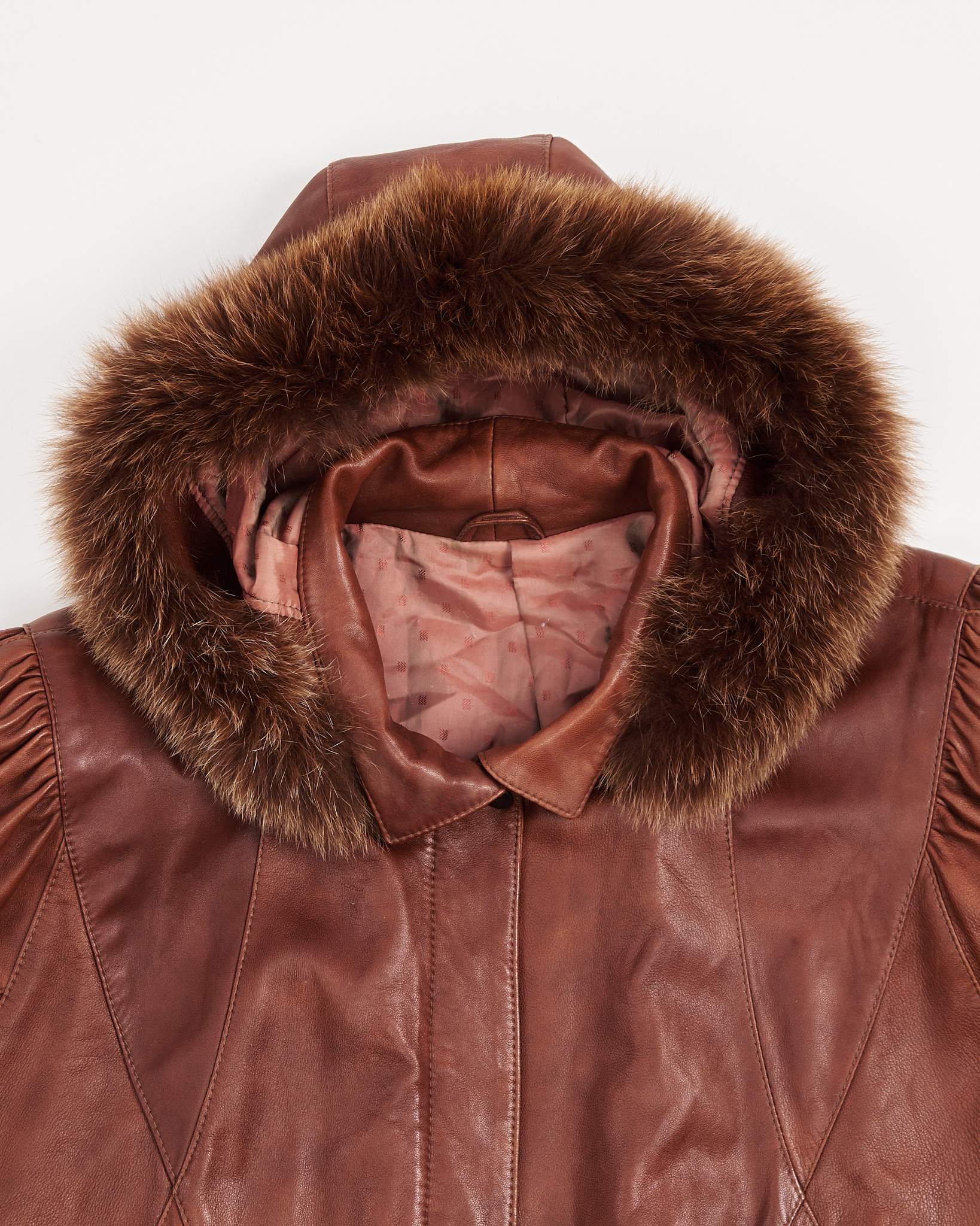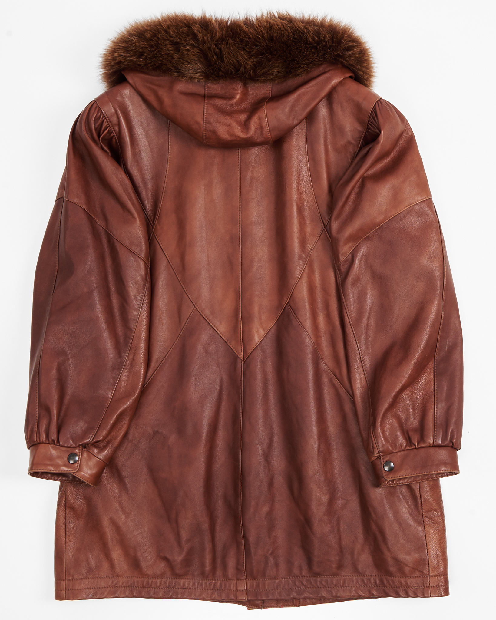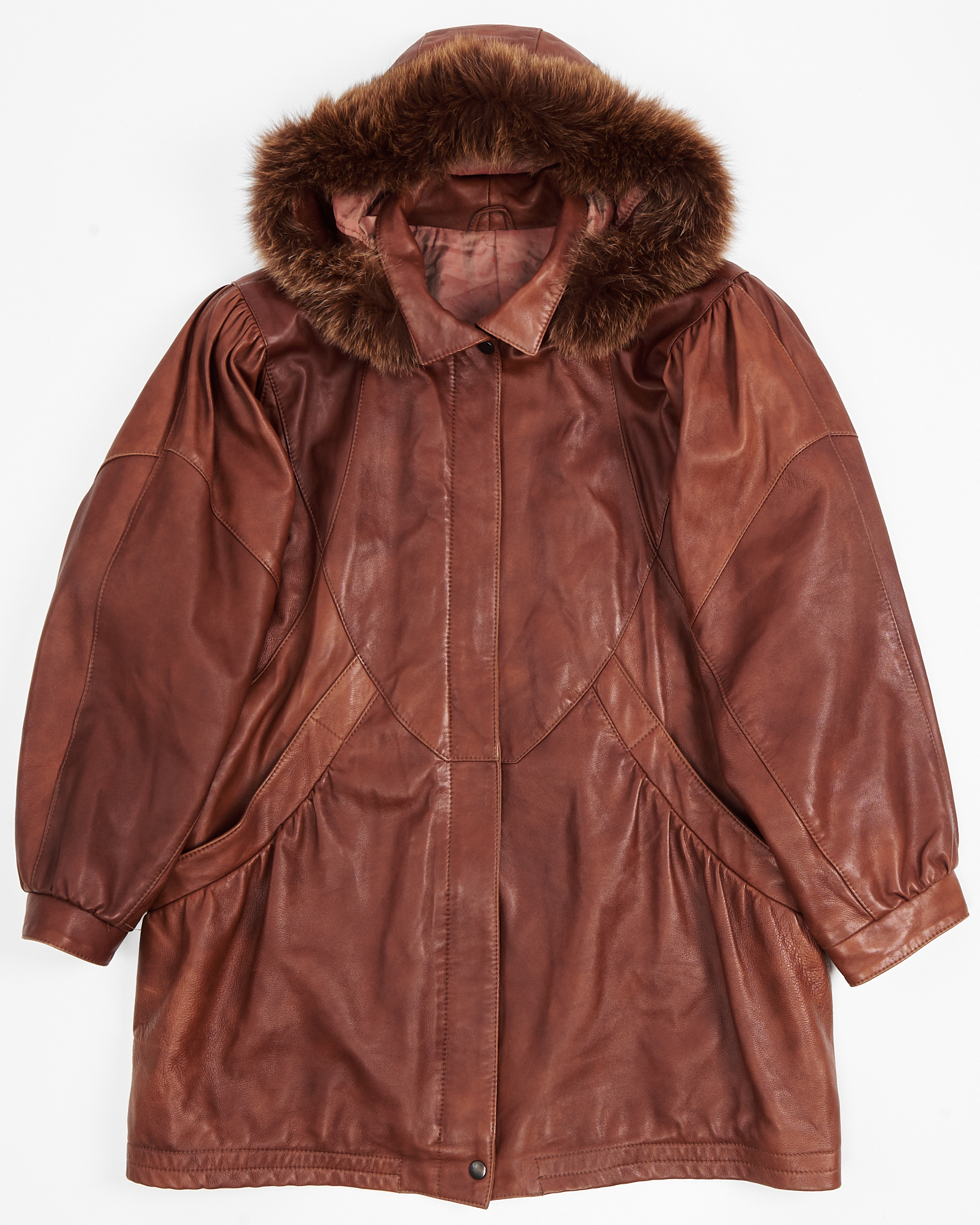 Кожаная куртка IFG Company с меховой отделкой. Куртка выполнена из мягкой натуральной кожи тёплого коньячного оттенка. Свободная посадка, капюшон с густой меховой отделкой. Конструктивные швы, застёжка на молнию и клёпки, функциональные карманы по бокам.