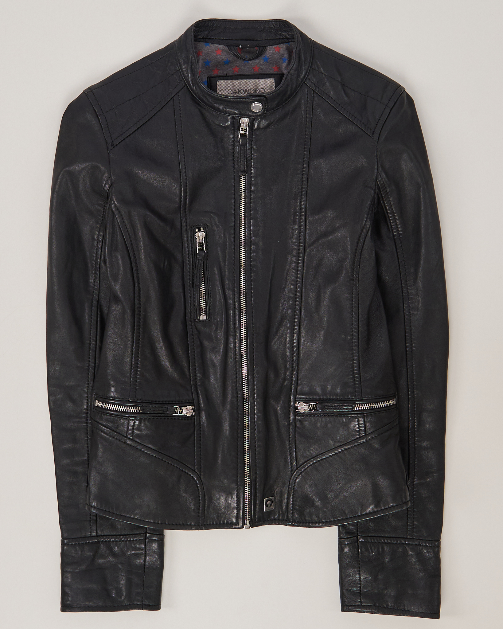 Куртка из натуральной кожи Oakwood. Воротник на застежке, приталенная посадка. Контрастная подкладка, акцентные ремешки внизу и разрез.