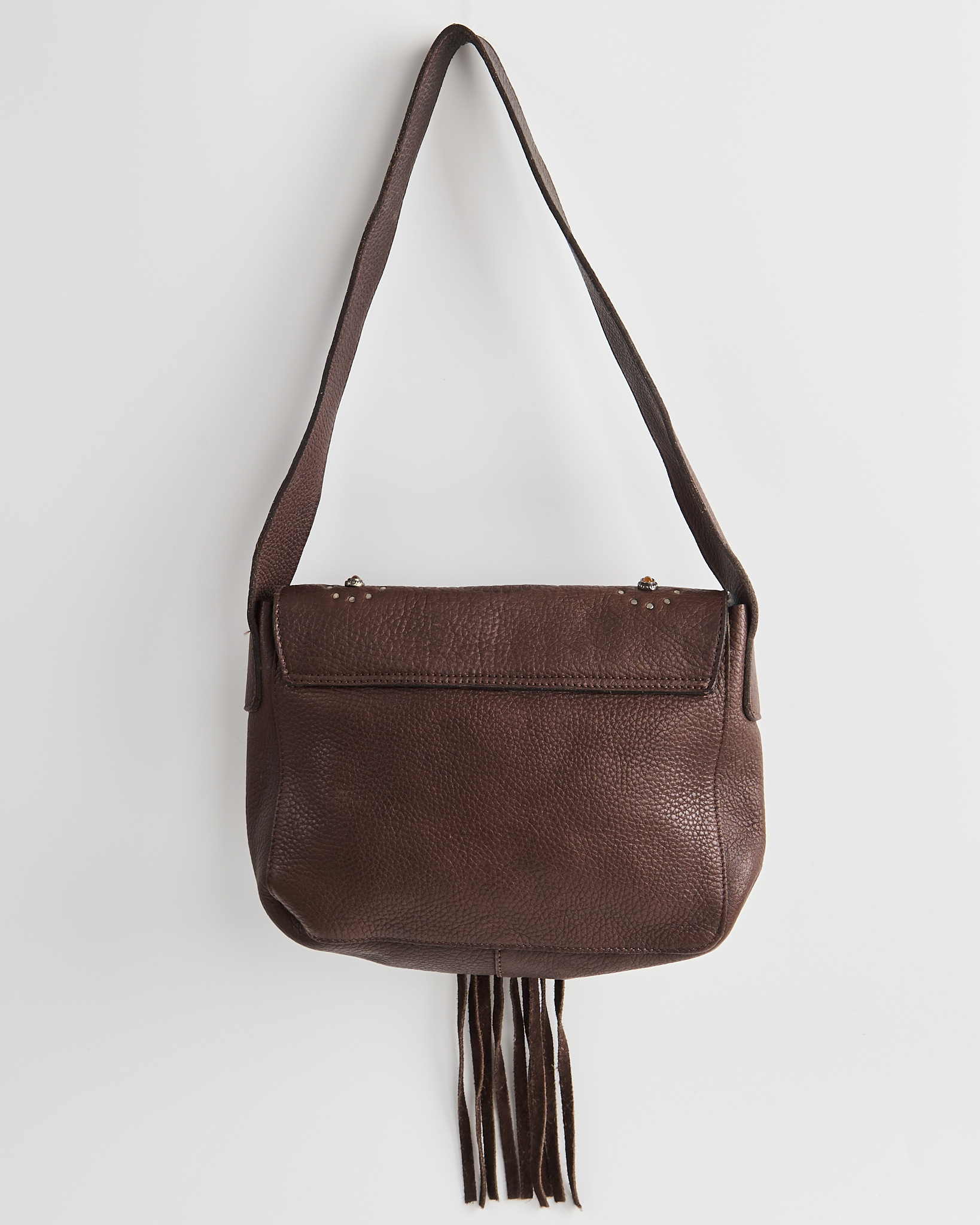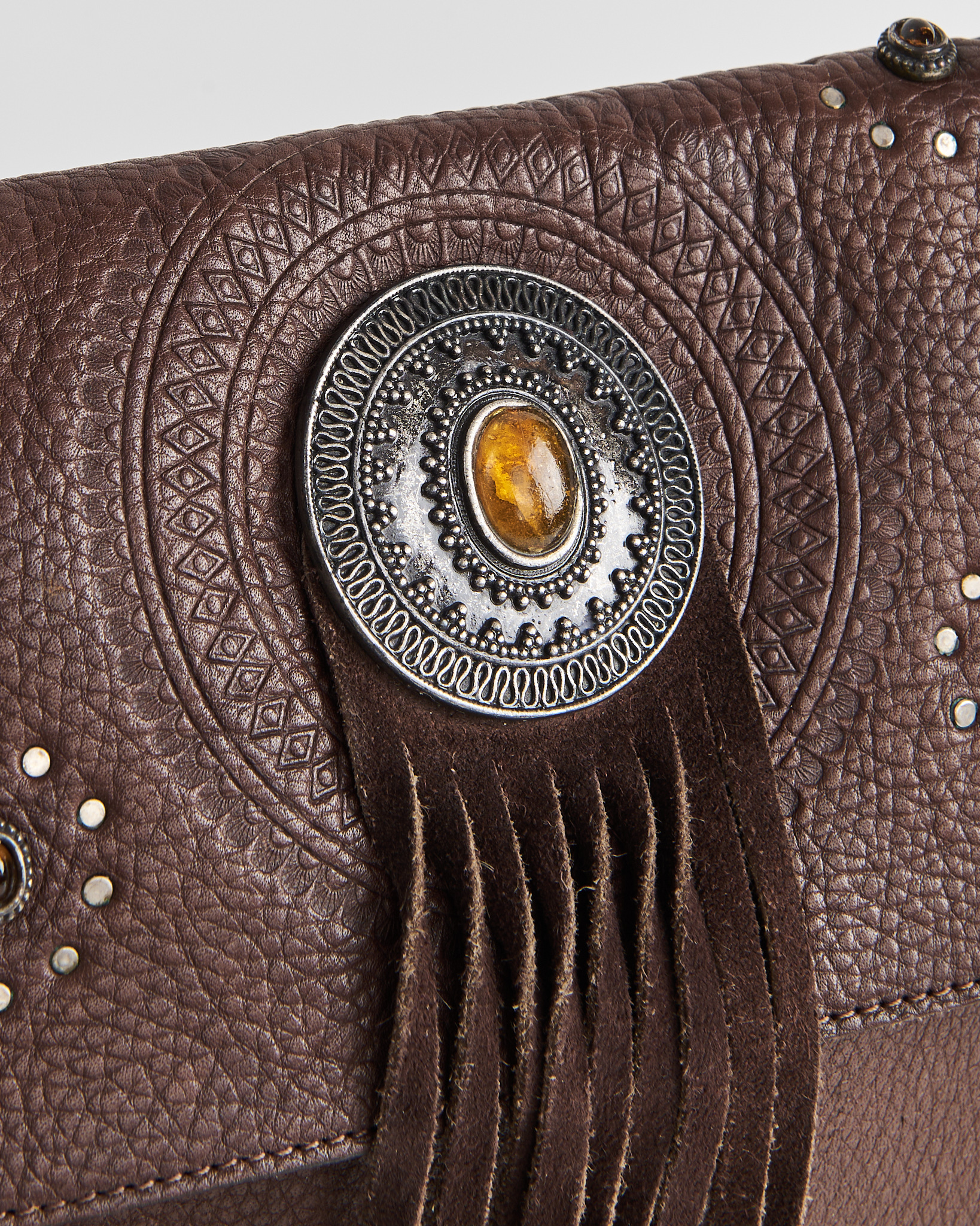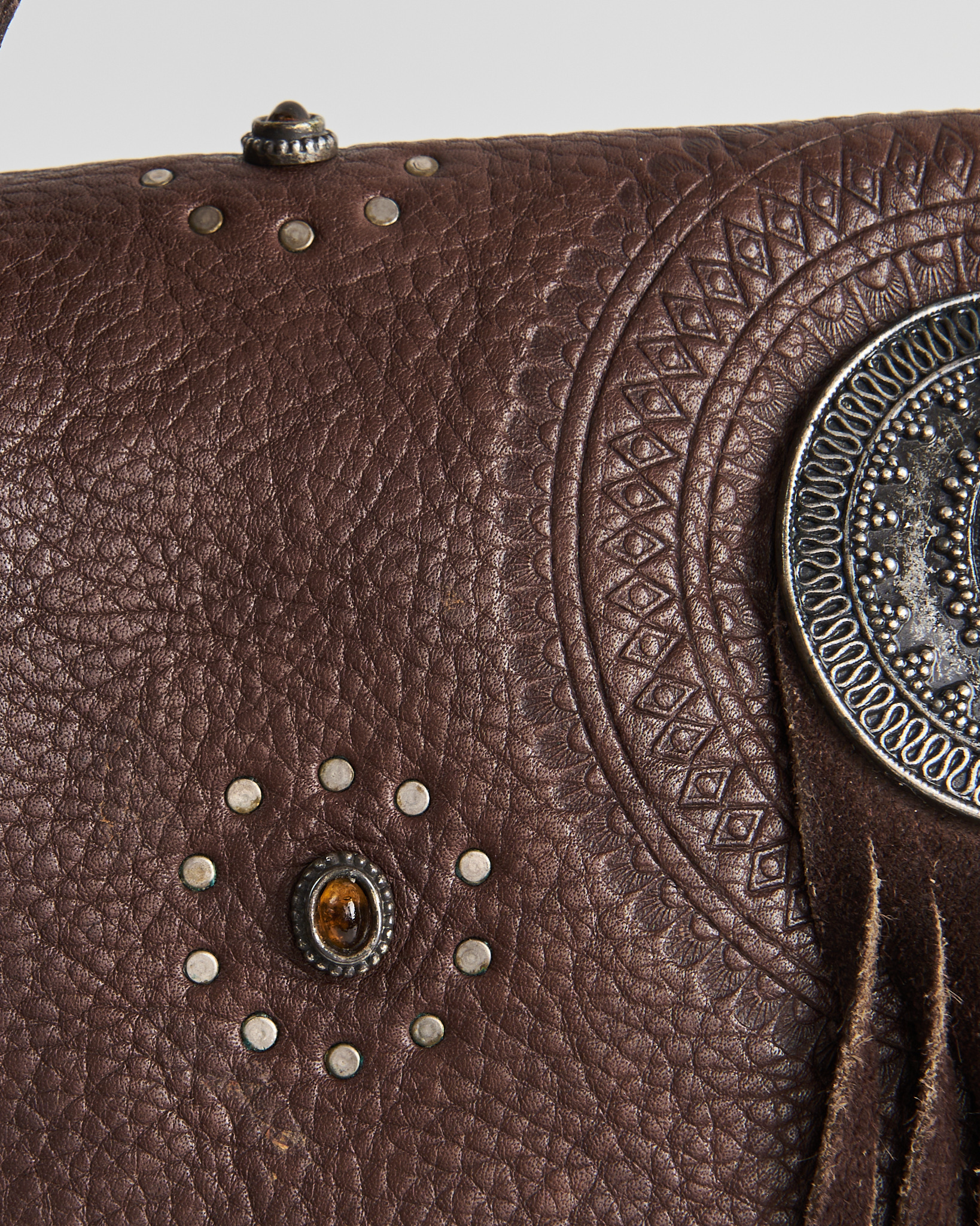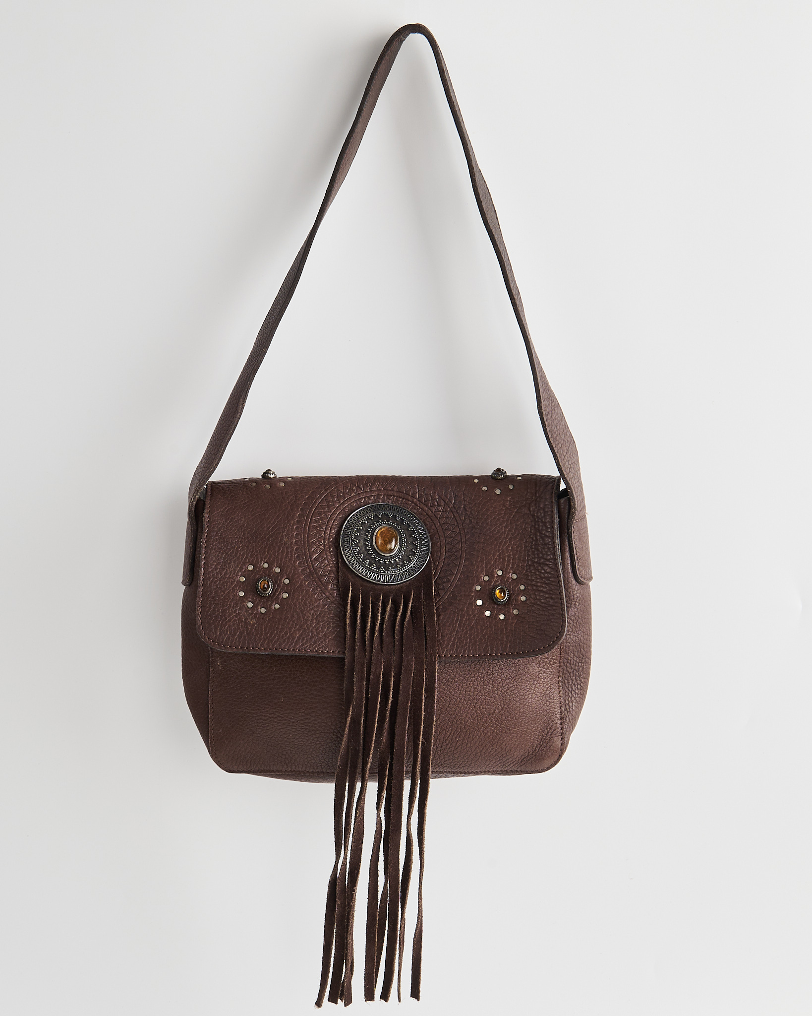 Сумка из натуральной кожи коричневого оттенка. Материал плотный, посадка на плече удобная, ремень держит форму и не скользит. Центральный декор с тиснением и вставкой под камень придает акцент. Длинная бахрома в центре.