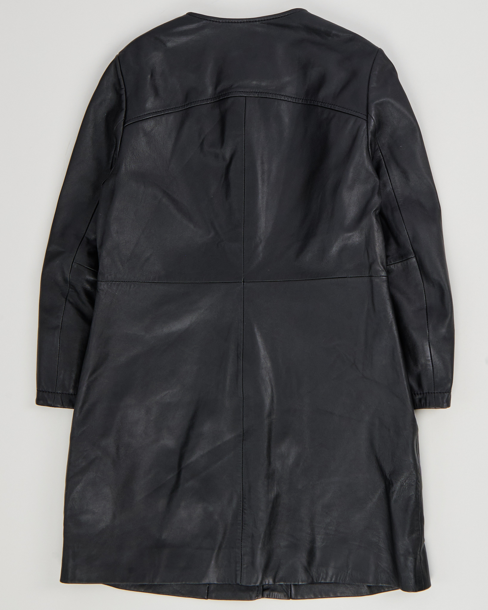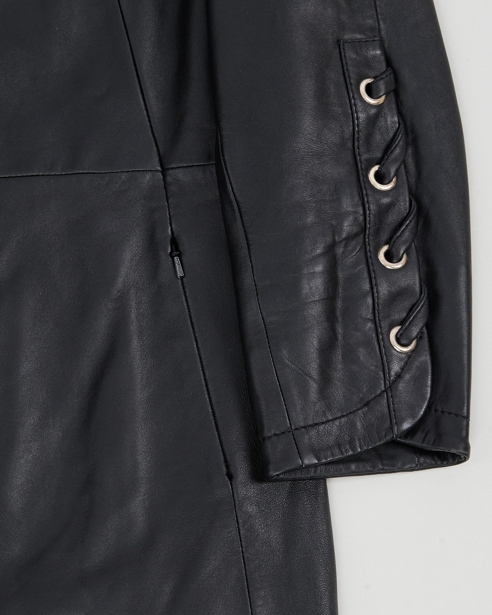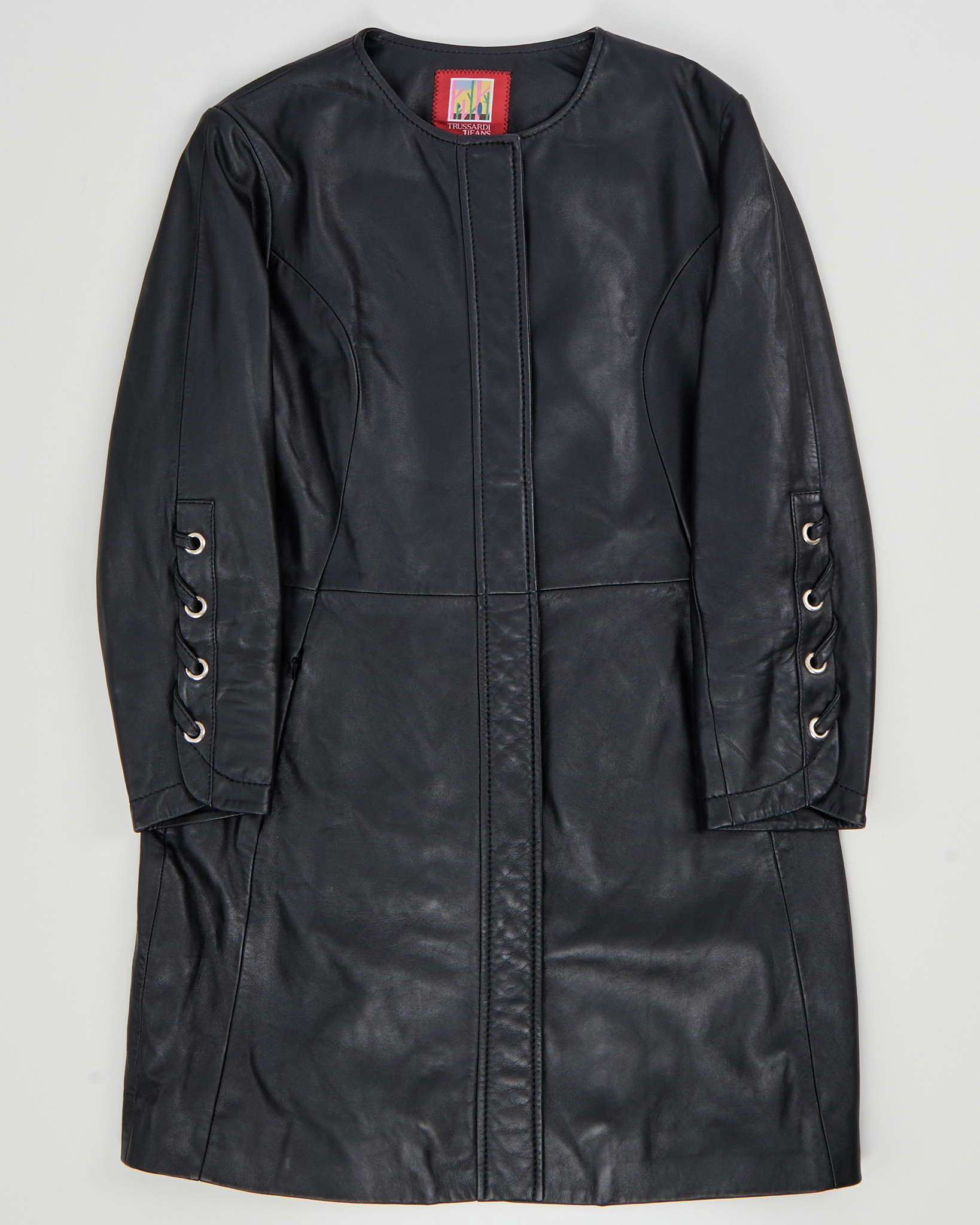 Кожаное пальто Trussardi Jeans из натуральной мягкой кожи. Приталенная посадка, вытянутый силуэт. Шнуровка на рукавах с металлическими люверсами, удобные карманы на молнии.