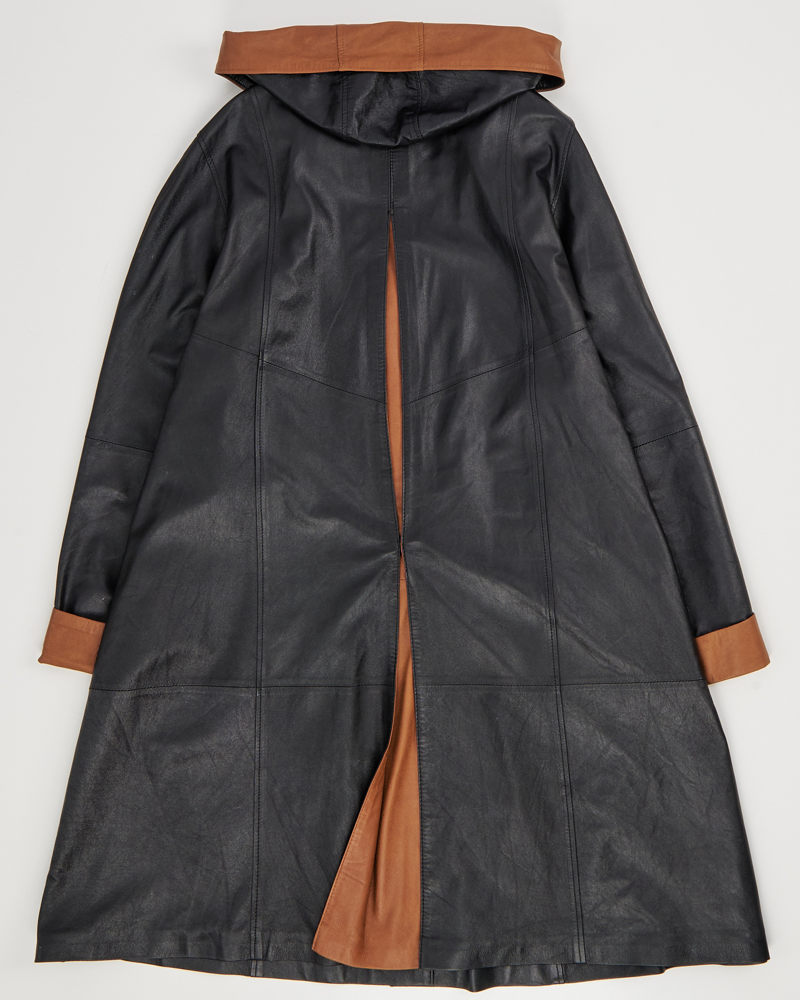 Кожаное пальто Turquoise Collection by Uysallar из натуральной кожи. Посадка свободная, линия кроя создаёт вытянутый силуэт. Контрастные вставки на манжетах и капюшоне, декоративные клапаны карманов, удобная застежка на пуговицы. Капюшон с завязками, акцентная вставка на спинке.