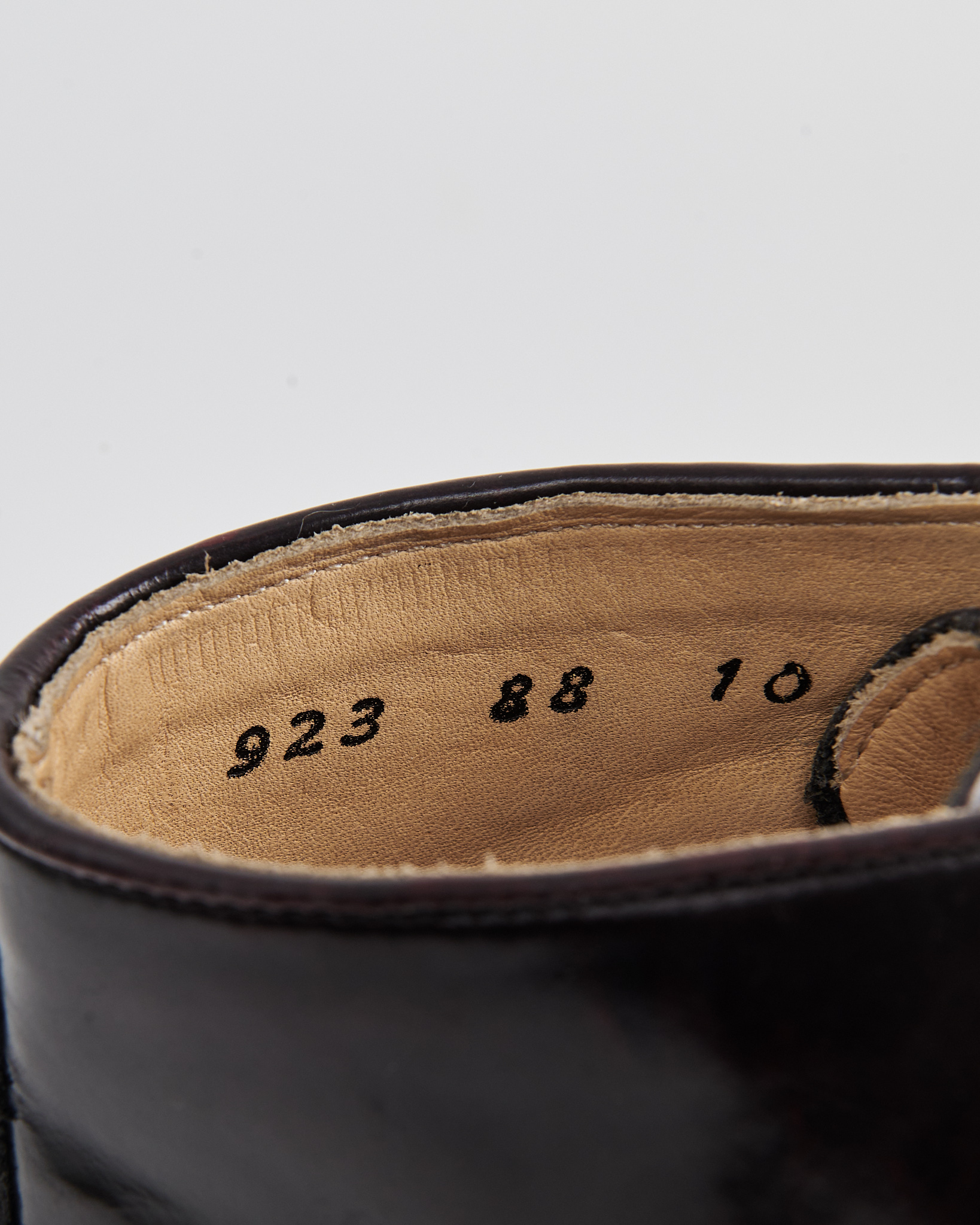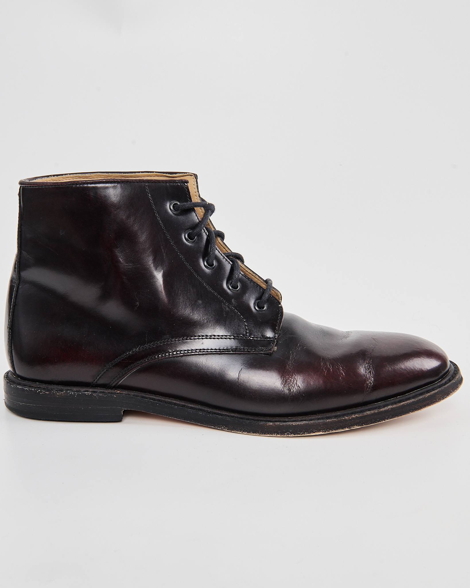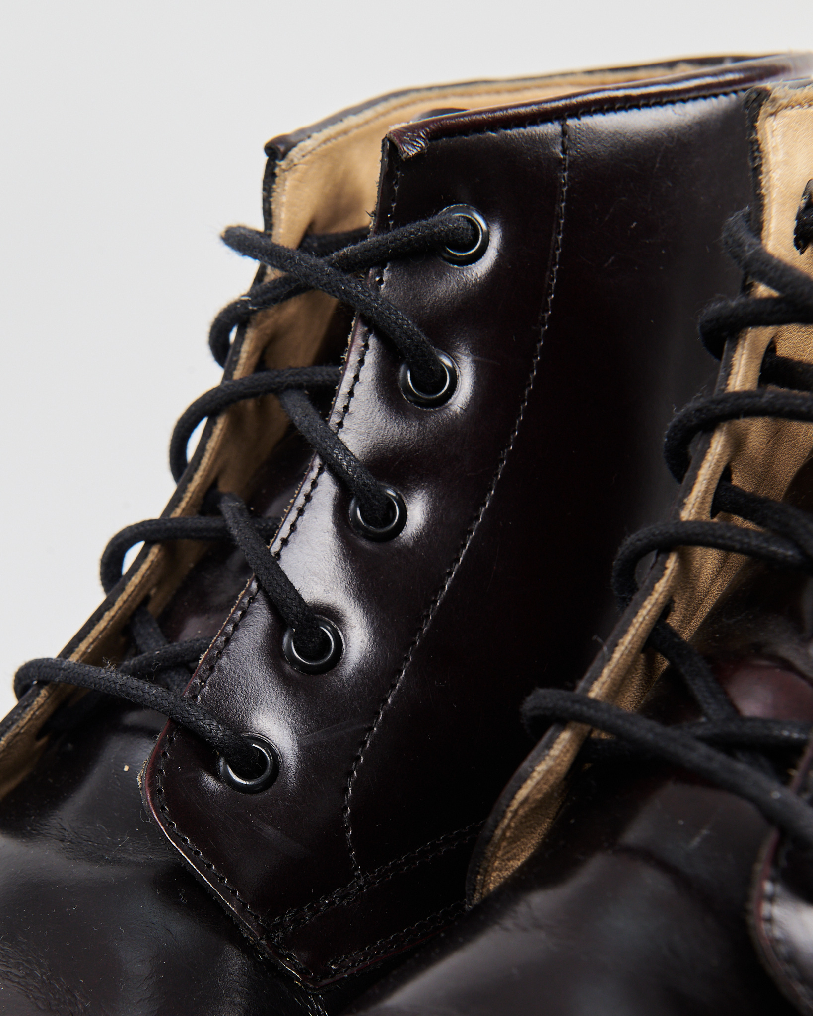 Ботинки из плотной натуральной кожи глубокого темно-коричневого оттенка. Колодка держит четкий силуэт и фиксирует стопу благодаря высокой шнуровке.