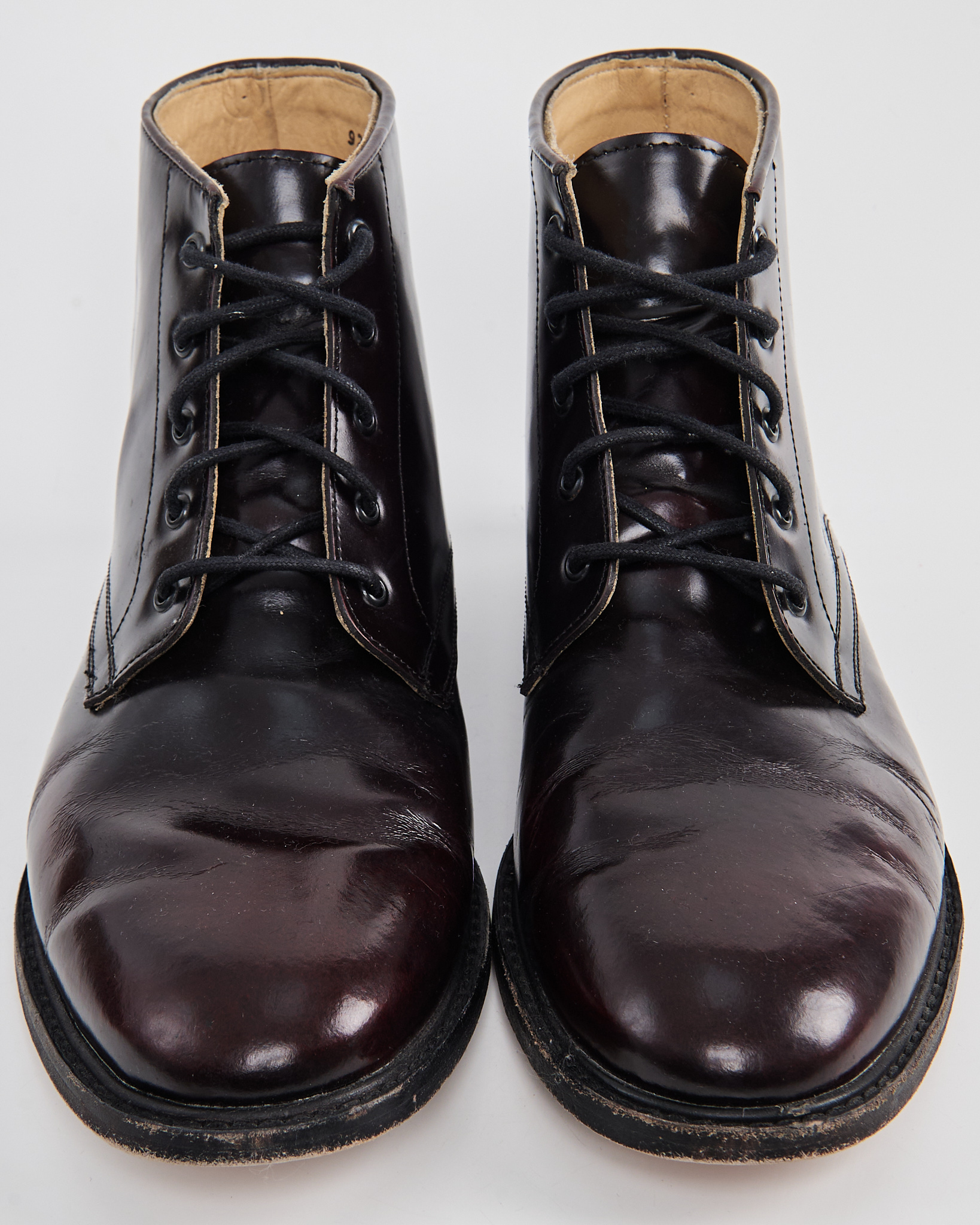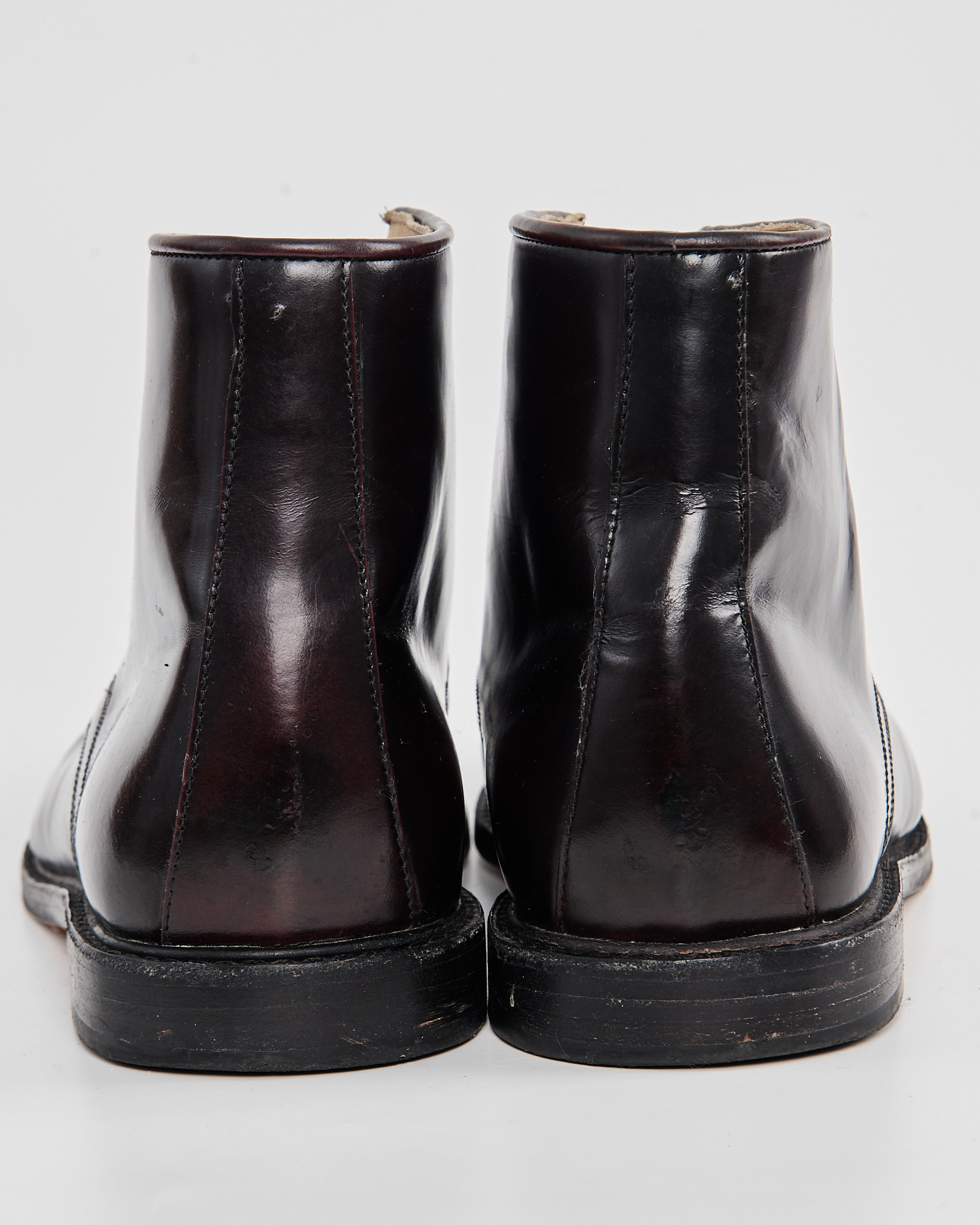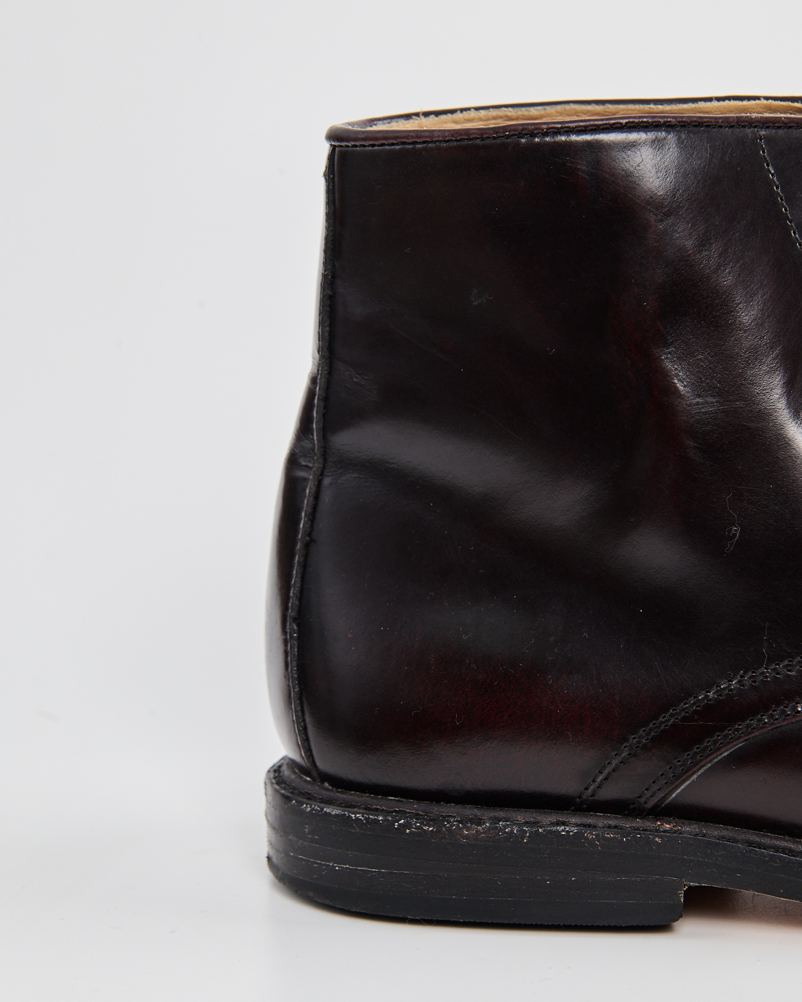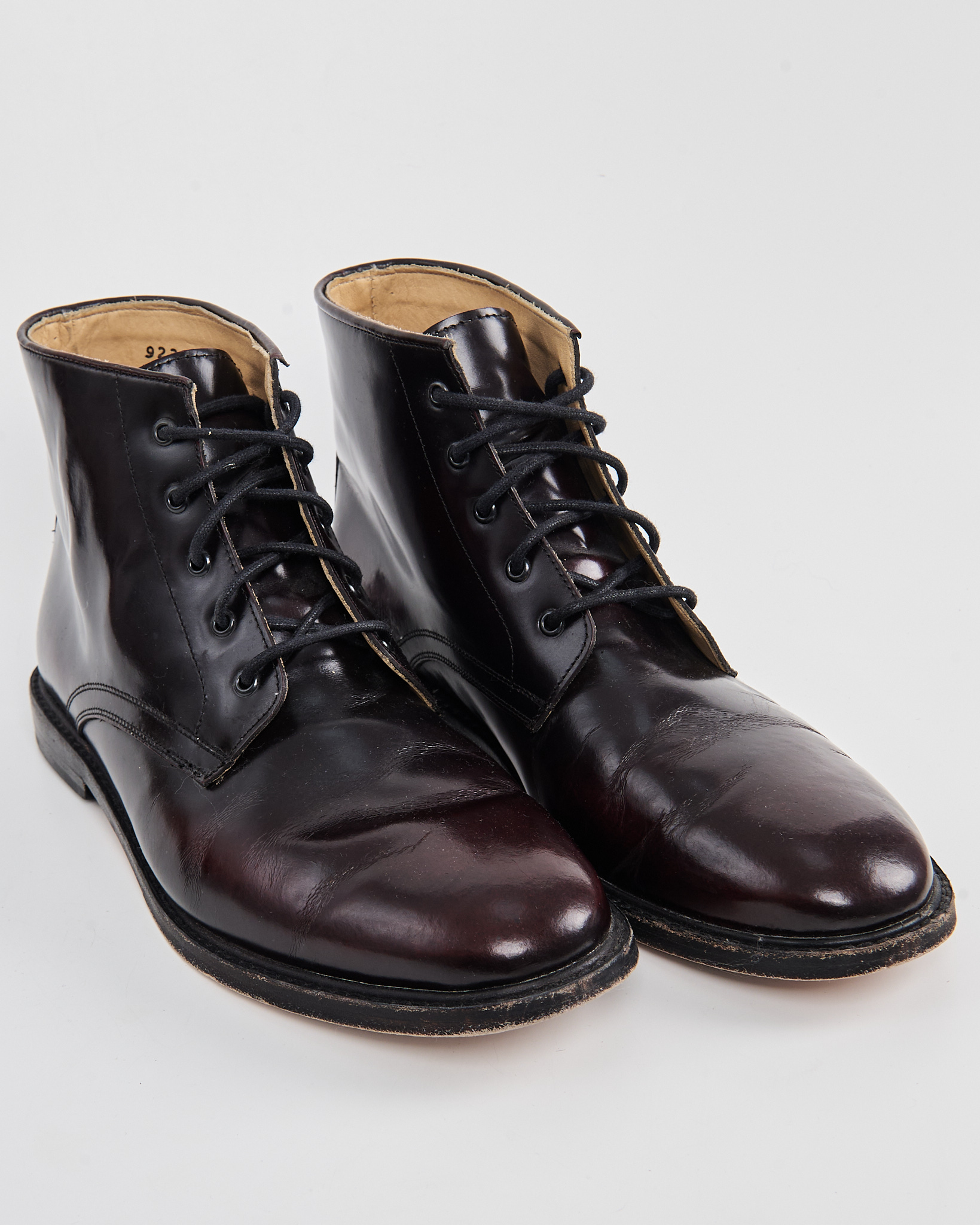 Ботинки из плотной натуральной кожи глубокого темно-коричневого оттенка. Колодка держит четкий силуэт и фиксирует стопу благодаря высокой шнуровке.