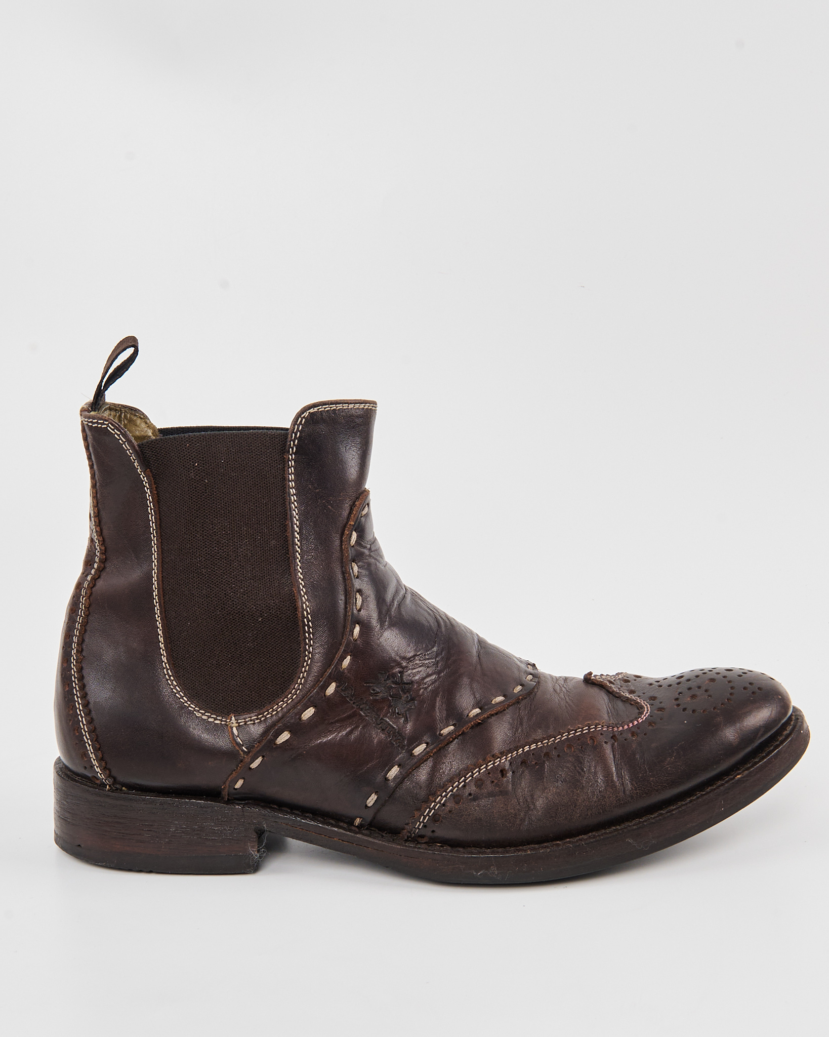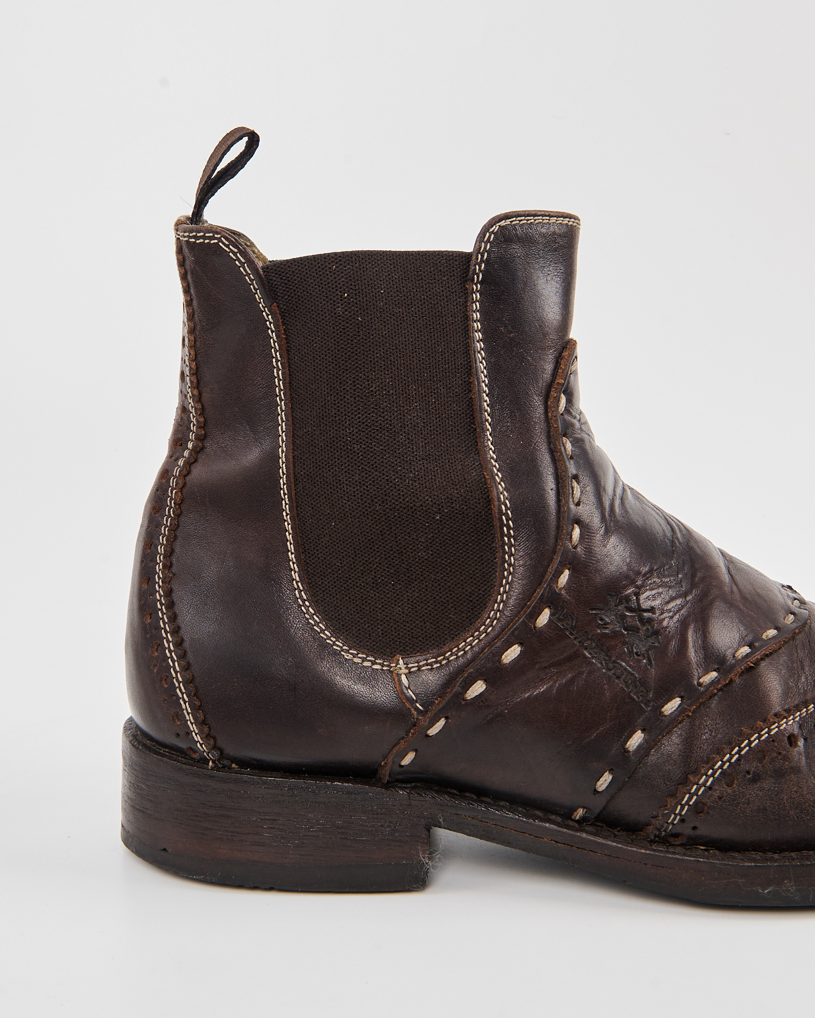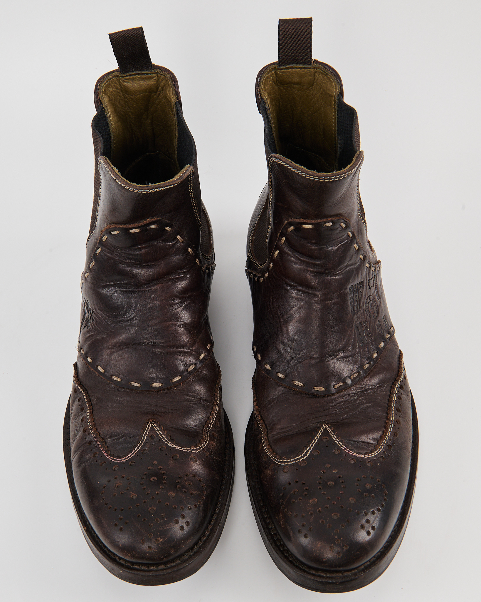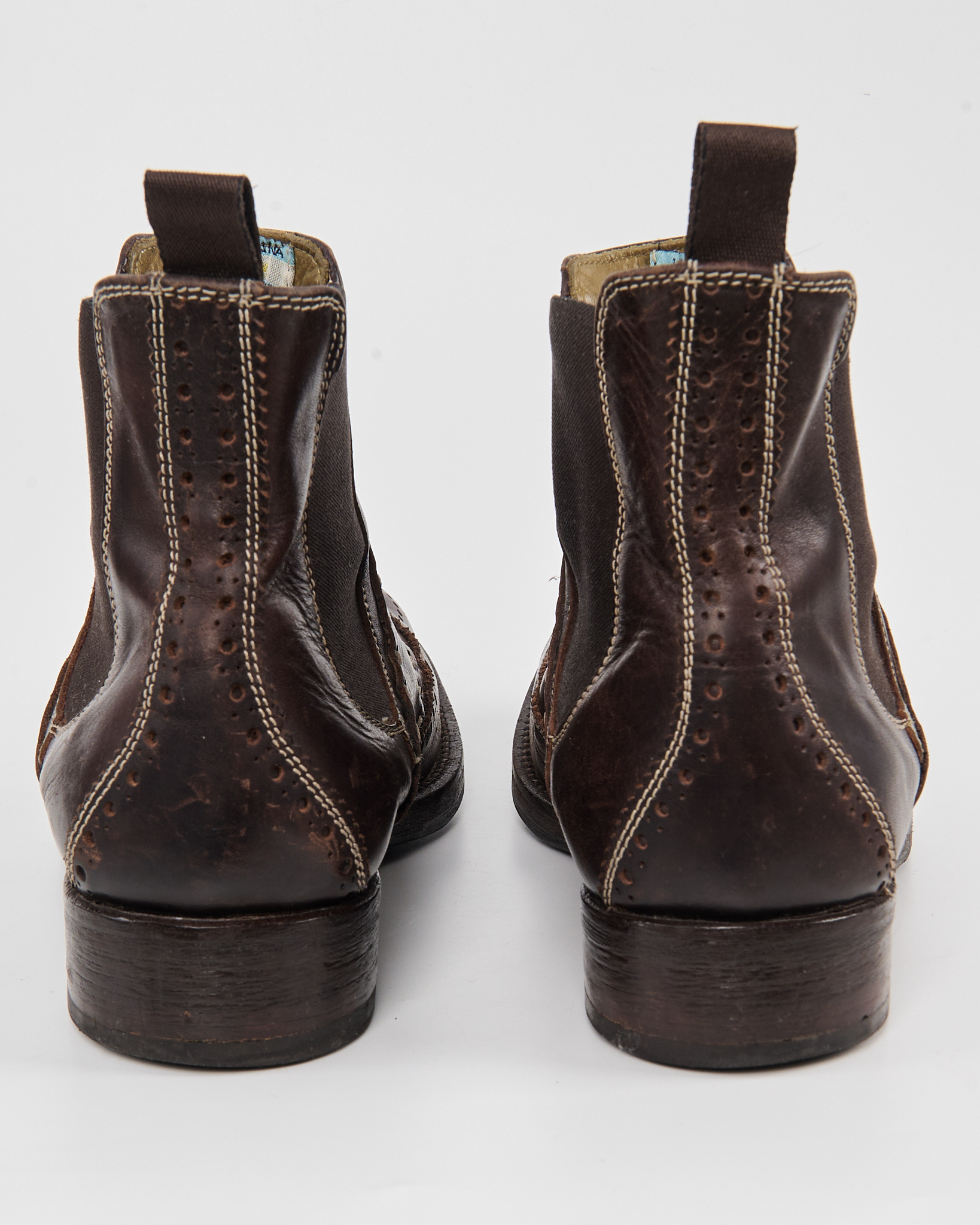 Кожаные челси с декоративной перфорацией. Ботинки из плотной натуральной кожи глубокого коричневого оттенка. Эластичные боковые вставки обеспечивают удобную посадку, контрастная прошивка.