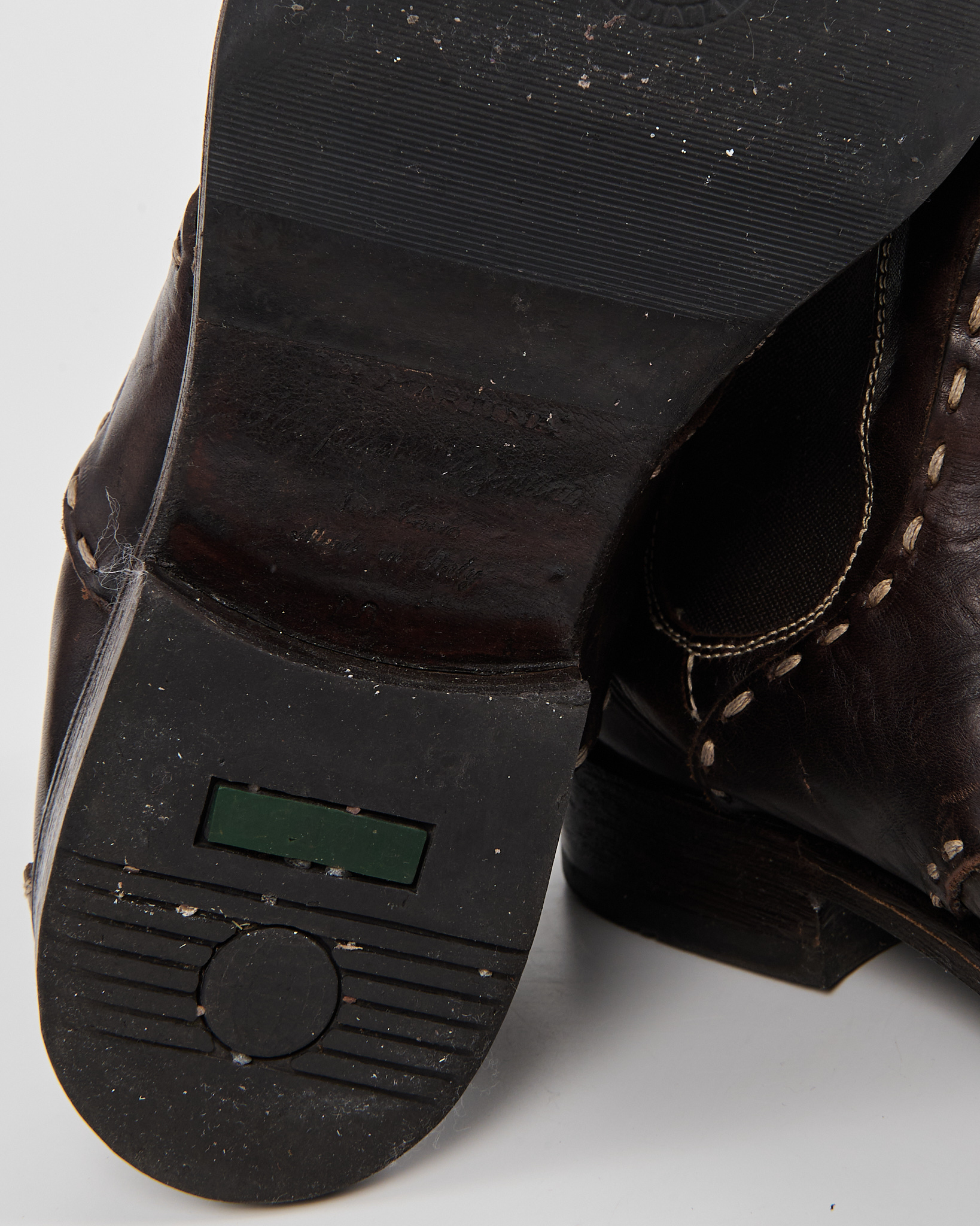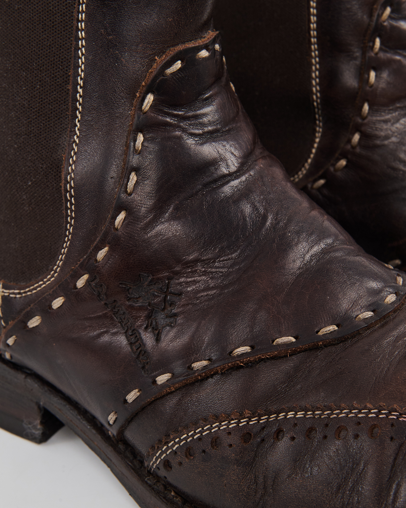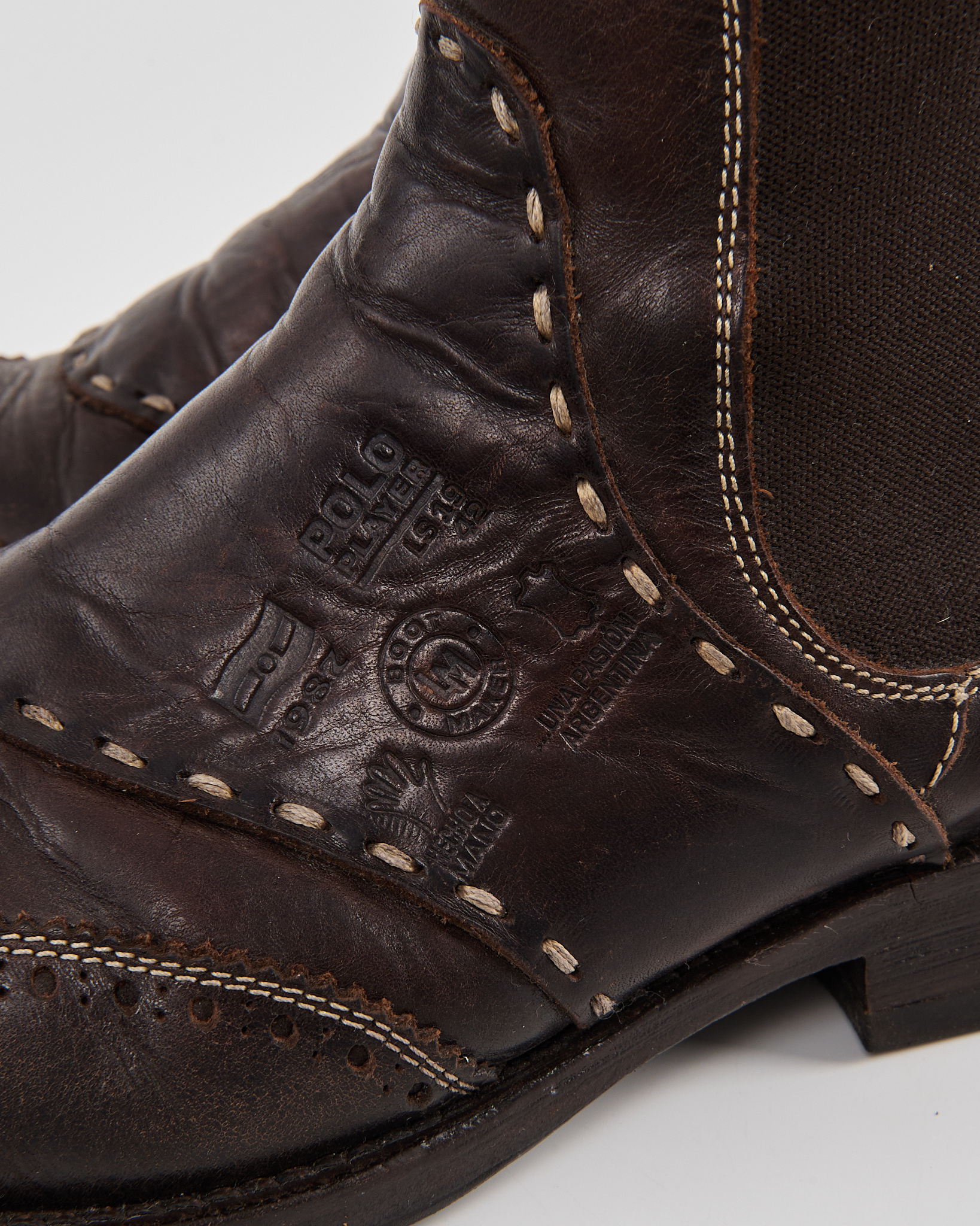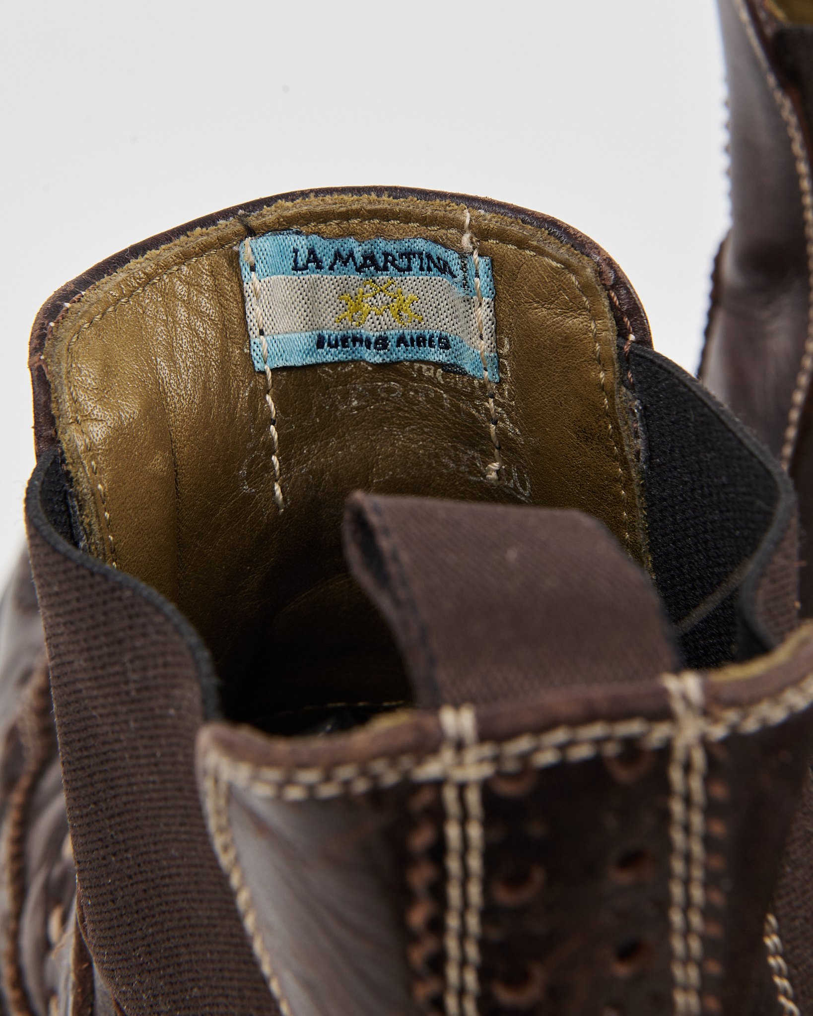 Кожаные челси с декоративной перфорацией. Ботинки из плотной натуральной кожи глубокого коричневого оттенка. Эластичные боковые вставки обеспечивают удобную посадку, контрастная прошивка.