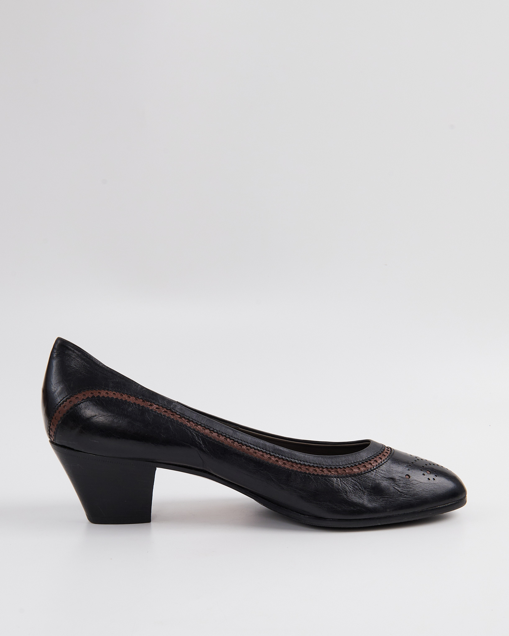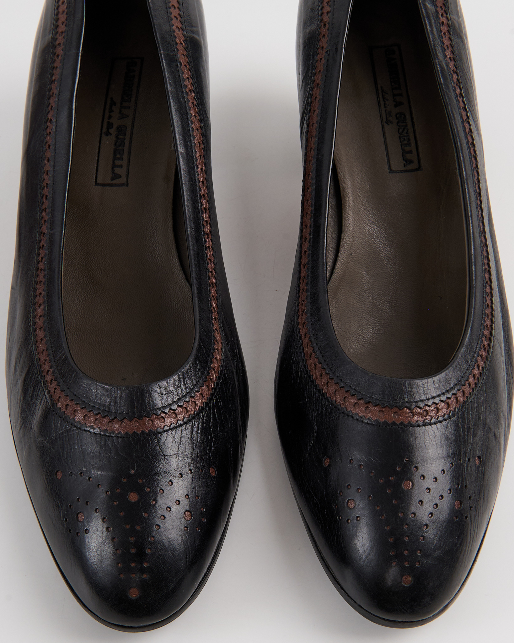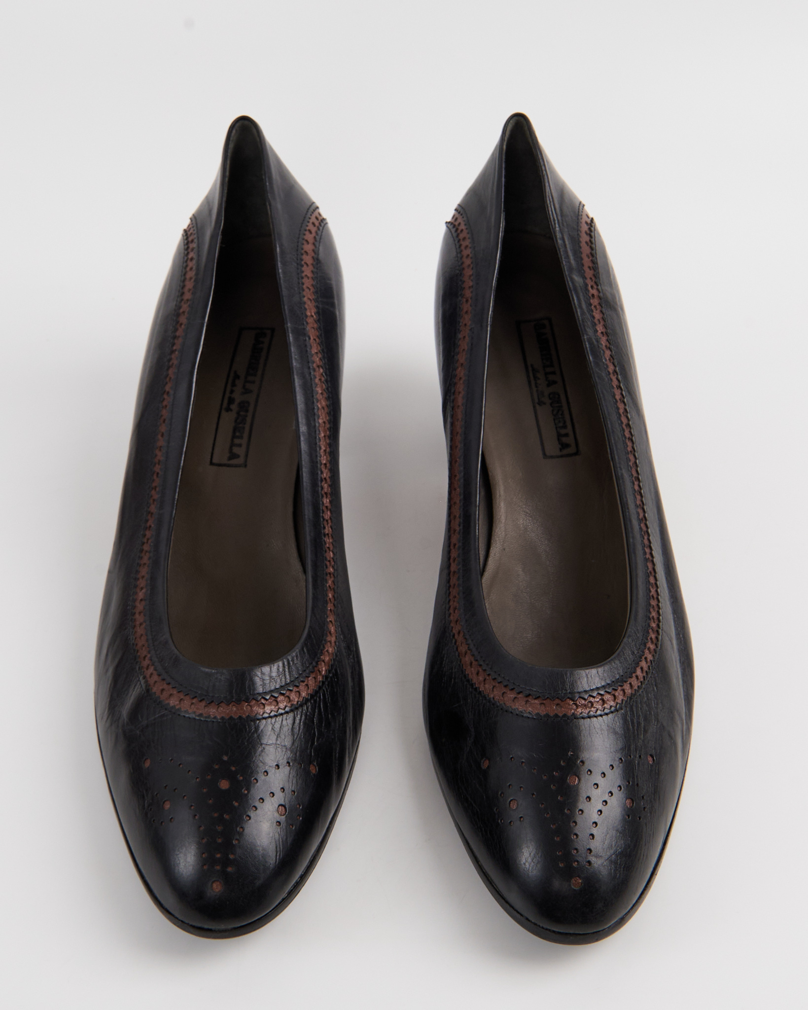 Элегантные итальянские туфли De Roberti Calzature из натуральной кожи. Стильный классический дизайн с округлым носком, дополненный изящными декоративными перфорациями и контрастной коричневой строчкой. Удобный устойчивый каблук средней высоты. Сделаны в Италии.
